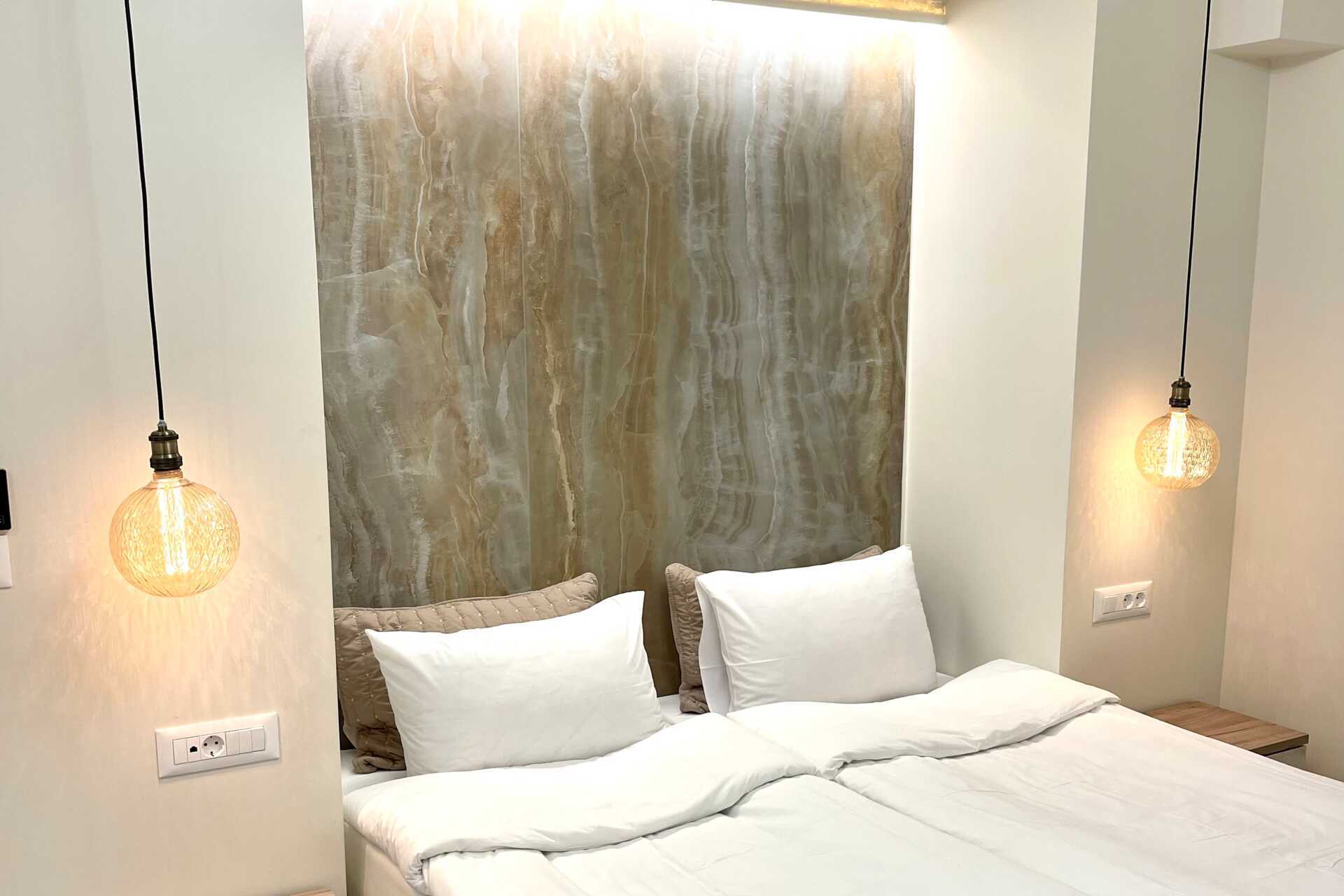 Dobbeltrom, noen med balkong og noen uten uteplass. En dobbeltseng eller to enkeltsenger. Wifi, luftkondisjonering og safe inkludert. Kjøleskap. TV. Badekåper og tøfler. Badekar eller dusj samt wc, hårføner. Rengjøring 6 ggr/uke. Barn under 2 år regnes inn i maksantallet i rommet.