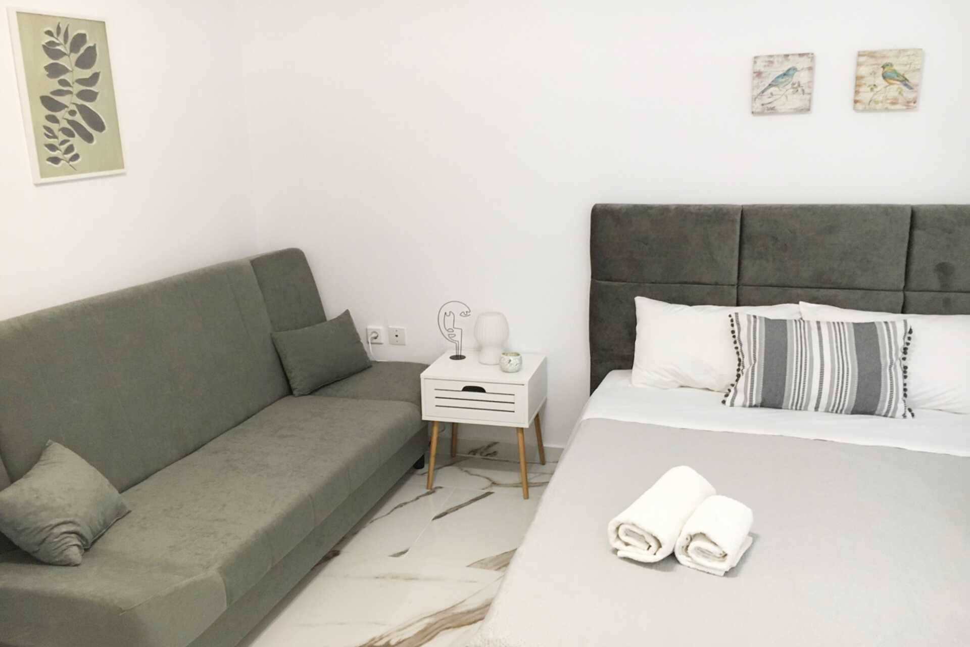 Ettromsleilighet med balkong eller markterrasse. Soverom kombinert med kjøkkenkrok. En dobbeltseng. Mulig med en ekstraseng i sovesofa eller enkeltseng. Minikjøkken med en eller to kokeplater og stekeovn, kjøleskap og enkelt kjøkkenutstyr. Wifi og luftkondisjonering inkludert. TV. Dusj og wc. Rengjøring 7 ggr/uke.