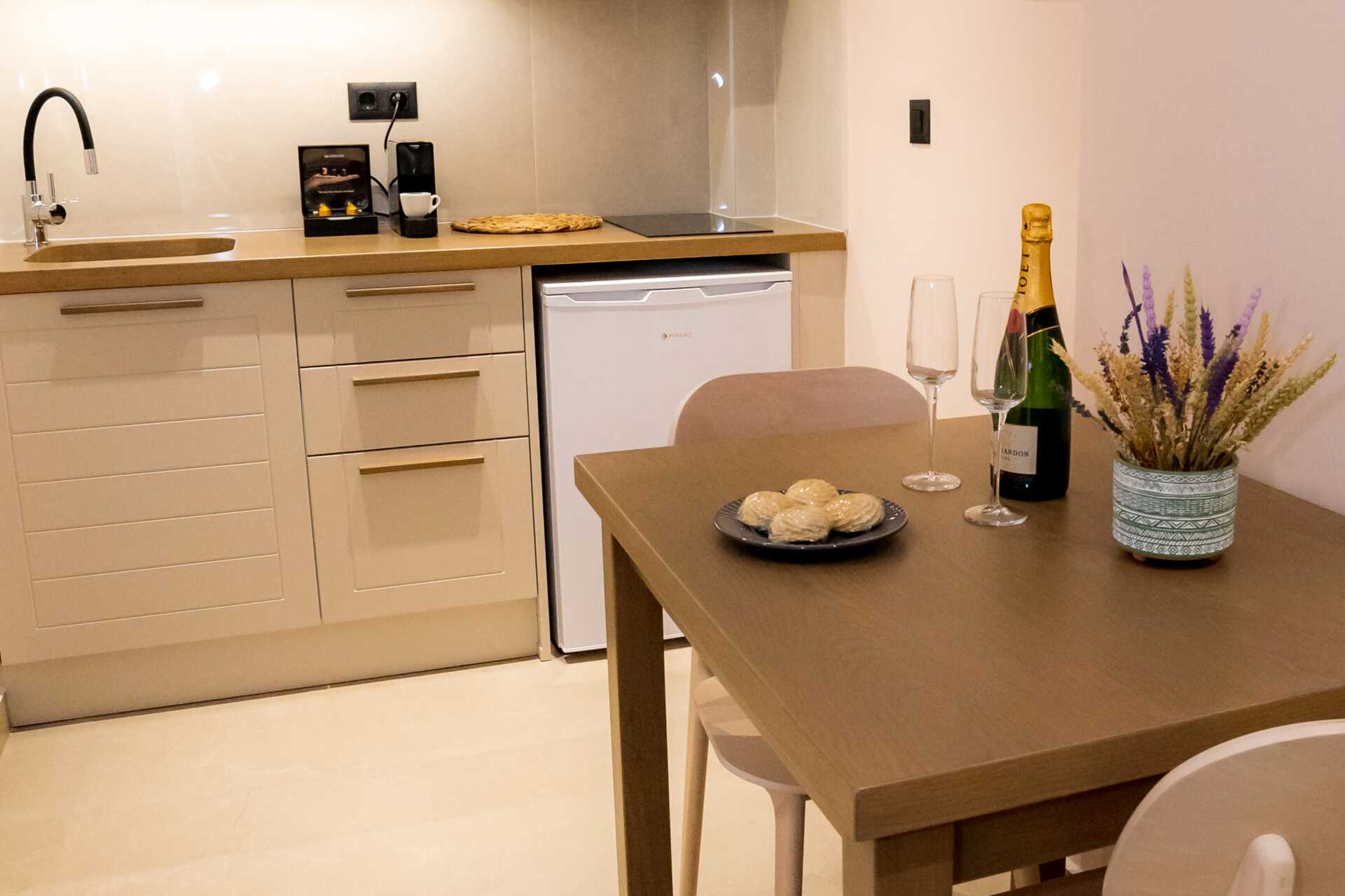 Ettromsleilighet med balkong eller markterrasse. I rommene med markterrasse kan det én person bo. Soverom kombinert med minikjøkken. En dobbeltseng. Minikjøkken med kokeplater, kjøleskap, brødrister og enkelt kjøkkenutstyr. Wifi, luftkondisjonering og safe inkludert. TV. Dusj og wc. Rengjøring 7 ggr/uke. Barn under 2 år regnes inn i maksantallet i rommet.