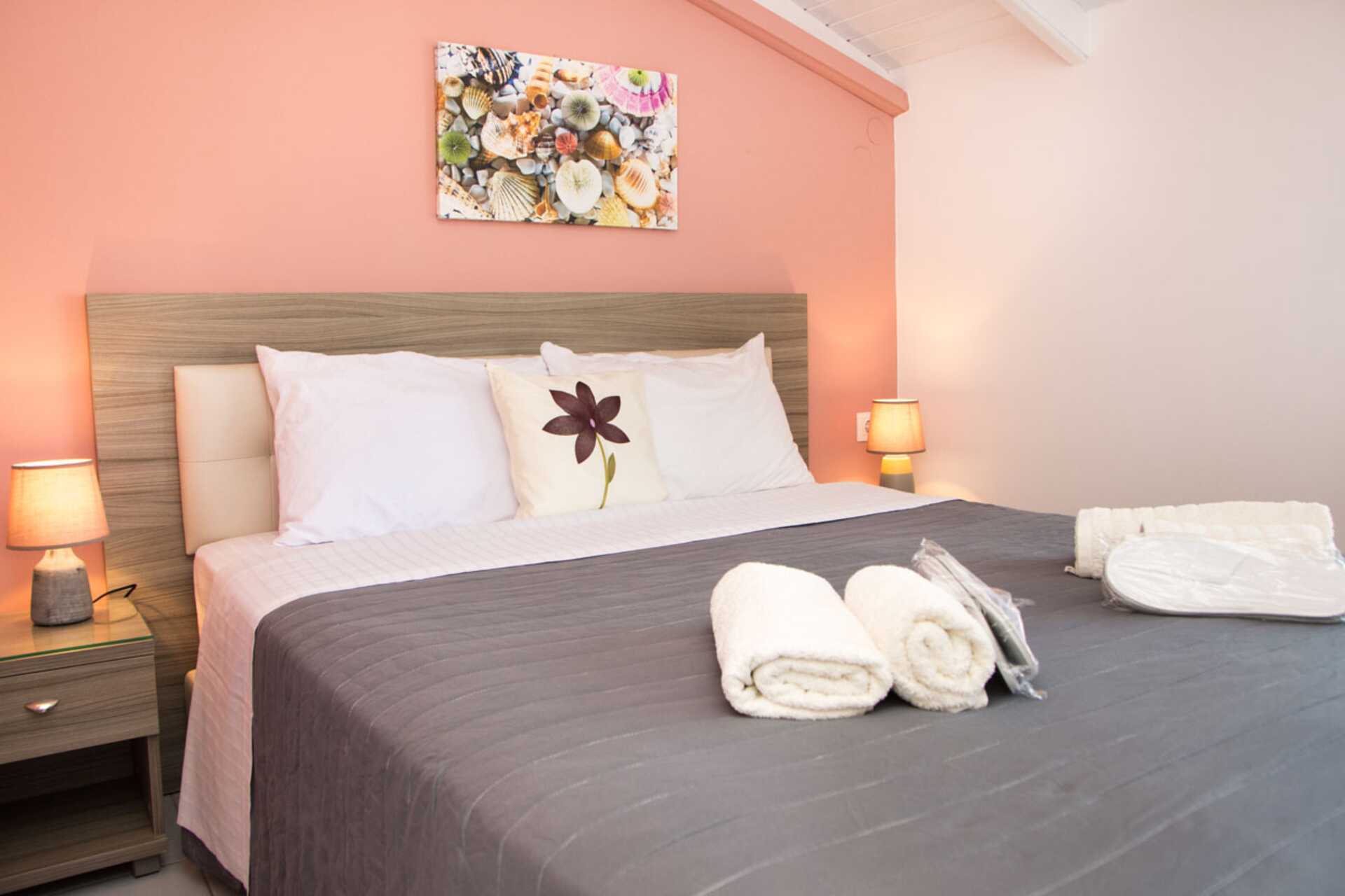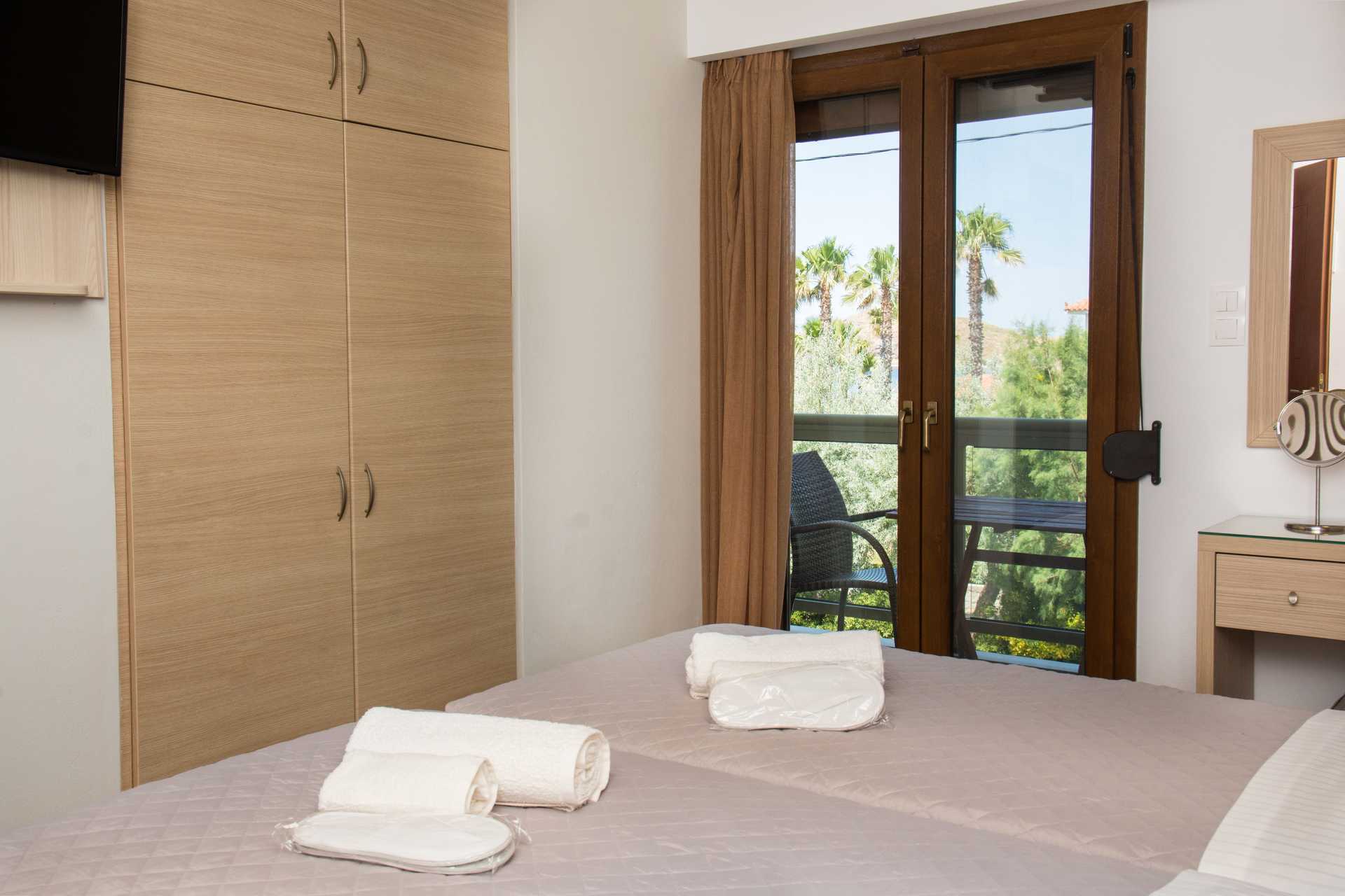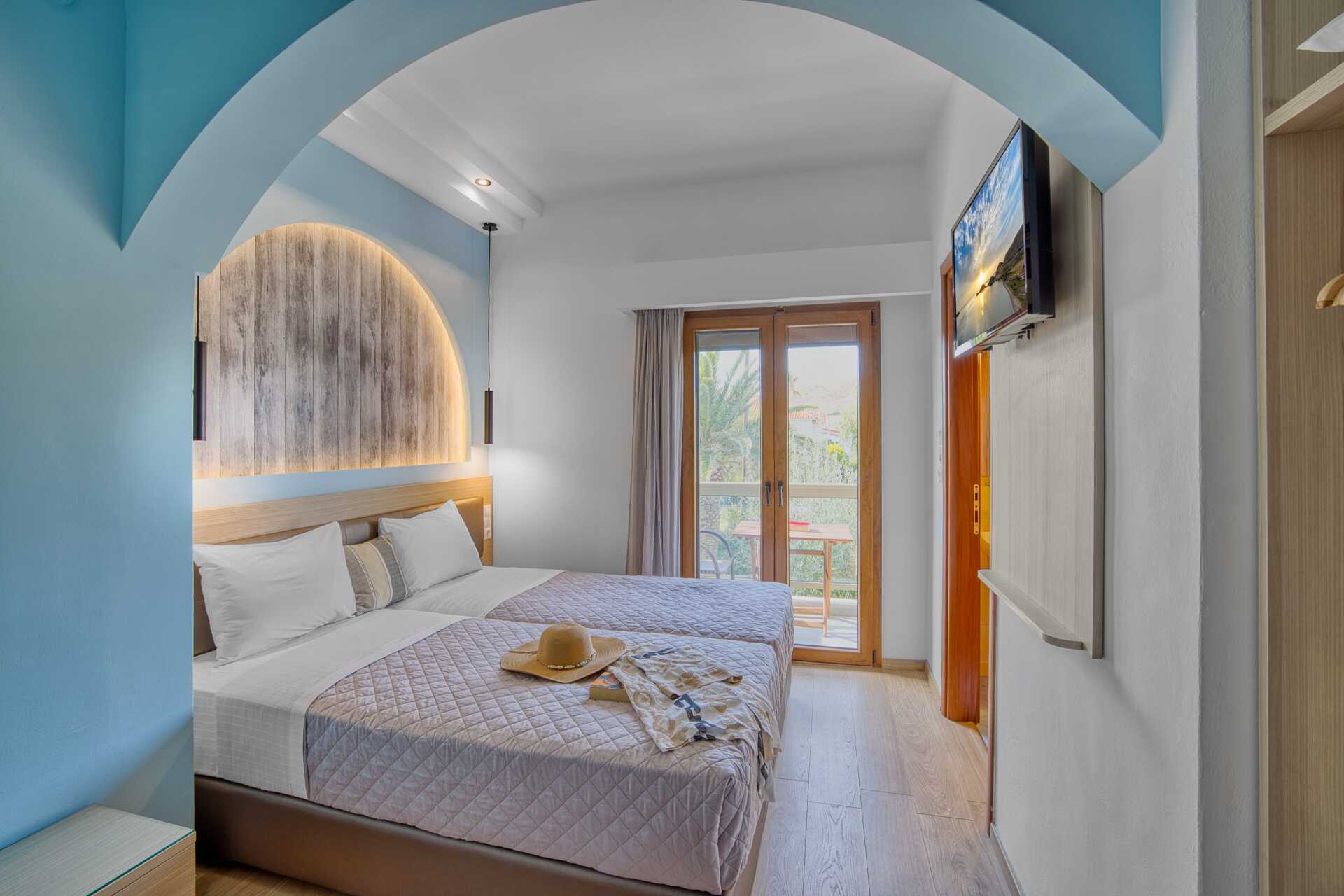 Dobbeltrom med balkong, noen med begrenset havutsikt eller markterrasse. To enkeltsenger. Mulig med ekstraseng for en tredje person i rom med markterrasse. Wifi, luftkondisjonering og safe er inkludert. Kjøleskap. TV med lokale kanaler. Hårføner. Dusj og wc. Rengjøring 6 ggr/uke.