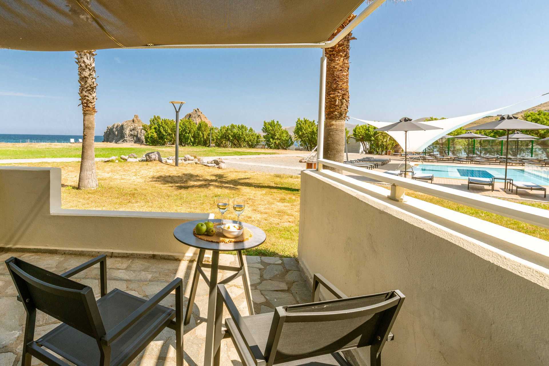 Juniorsuite med balkong og havutsikt. Ett soverom og en stue/oppholdsstue. En dobbeltseng. Mulig med en ekstraseng i sovesofa. Wifi, luftkondisjonering og safe inkludert. Kjøleskap. Vannkoker samt kaffe og te. TV. Hårføner. Badekar eller dusj samt wc. Rengjøring 7 ggr/uke.