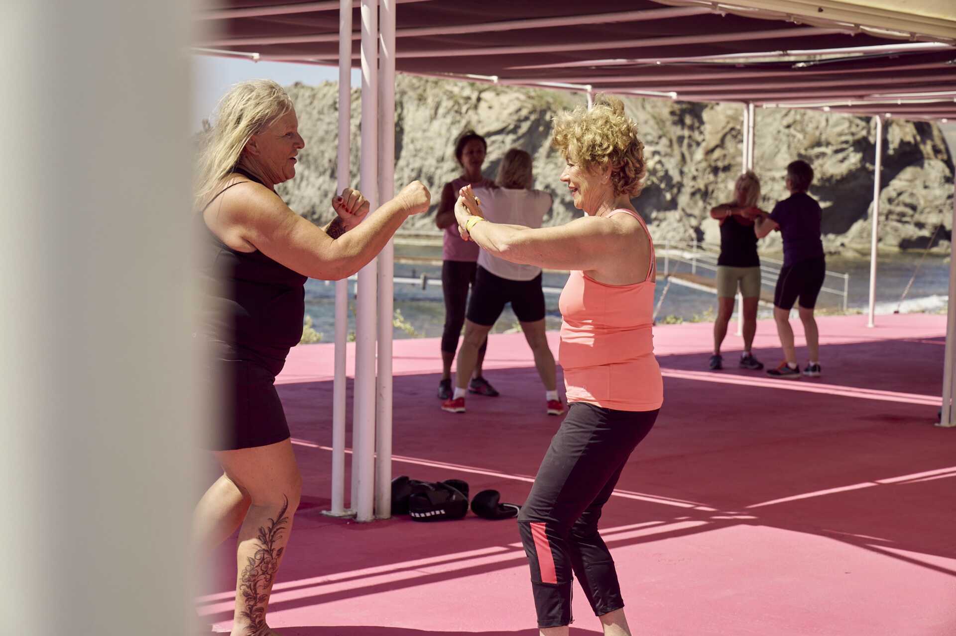 På Porto Myrina er det flere områder for gruppetrening. En stor rosa utendørsplattform samt en utendørs multibane for gruppetrening/treningsøkter under åpen himmel. På den rosa plattformen, som har havutsikt, kjører vi lederledede gruppetreningsøkter til musikk, samt morgenyoga. Underlaget er utstyrt med en scene slik at du kan se våre instruktører tydelig. Også på multibanen er det noen ganger lederledede gruppetreninger til musikk, og fotball og basketball spilles mellom rundene. Multicourten kan bestilles av grupper på ikke-skjemalagte tider. Bestillingen gjøres i sportsbookingen. For de dagene det er for varmt å trene ute eller hvis det regner, er det et innendørs treningsstudio for gruppetrening. Vi har også et mindre gruppetreningsområde for den lille gruppen eller bedriften.
