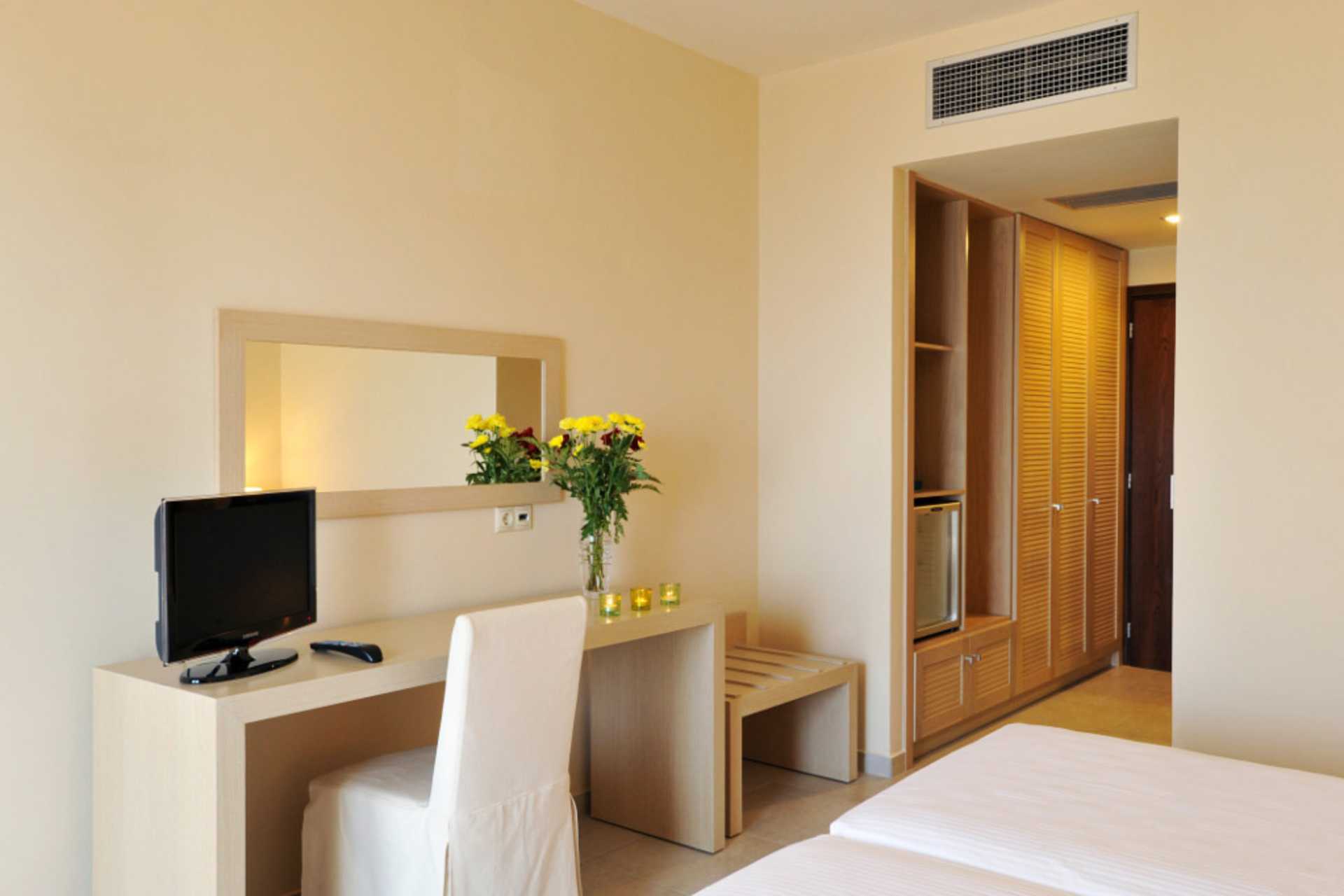 Større dobbeltrom med balkong med havutsikt eller begrenset havutsikt. En dobbeltseng eller to enkeltsenger. Mulig med ekstraseng i enkeltseng. Wifi, luftkondisjonering og safe inkludert. Kjøleskap - en flaske vann er inkludert ved ankomst. Vannkoker samt kaffe og te. TV. Hårføner. Bad med badekar/dusj og wc. Rengjøring 7 ggr/uke.