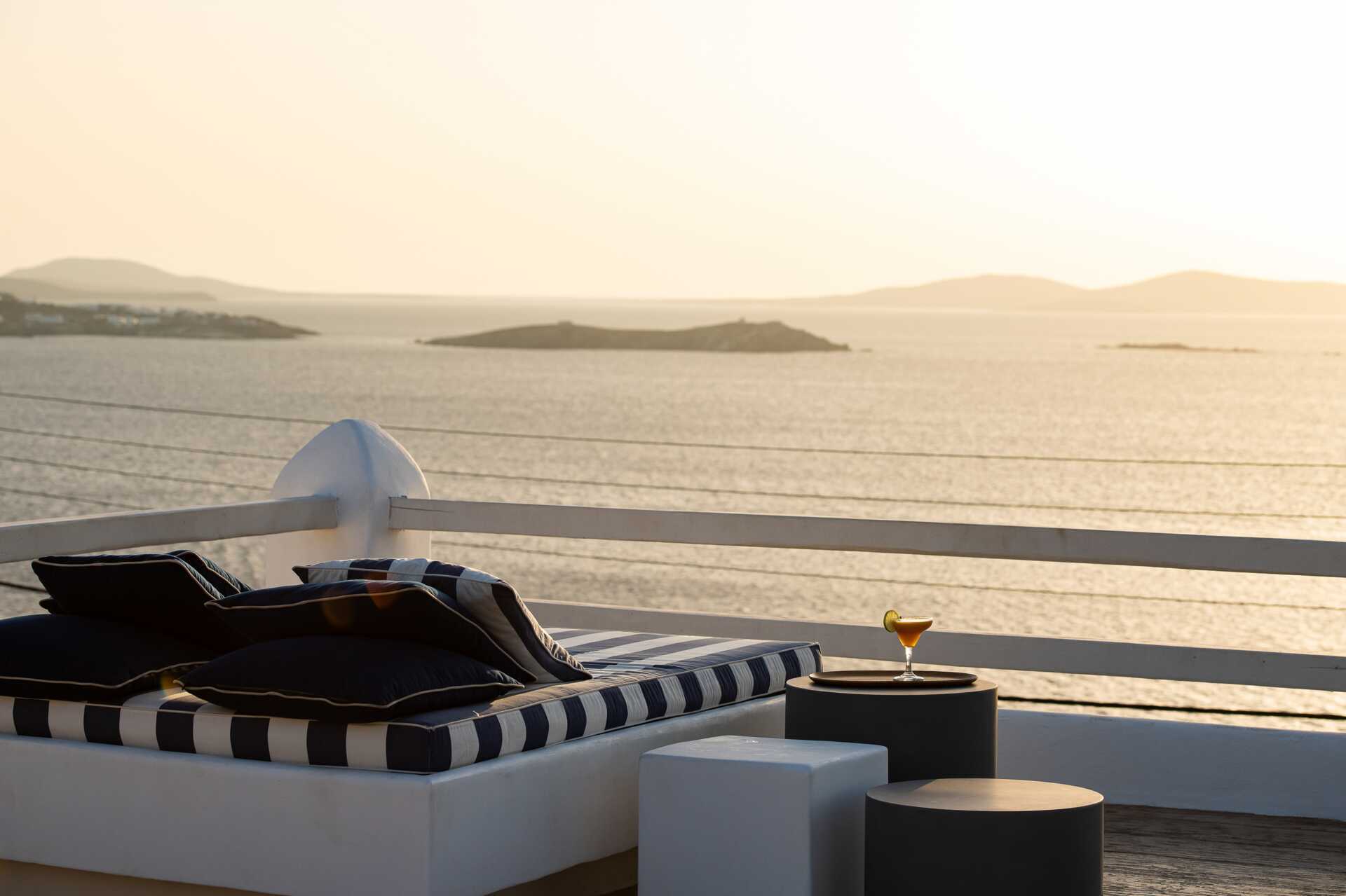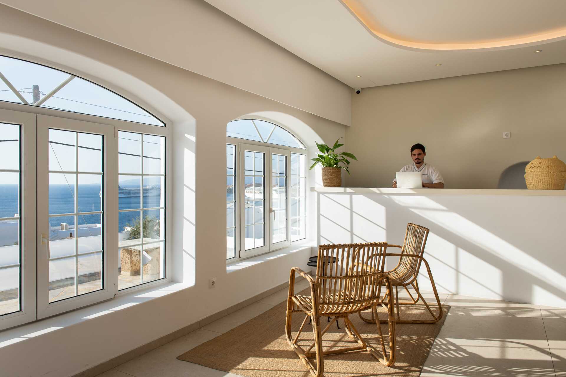 Med hvitkalkede vegger og rene, moderne interiørdetaljer byr hotellet på en kykladisk arkitektur som skaper en harmonisk og avslappet atmosfære.