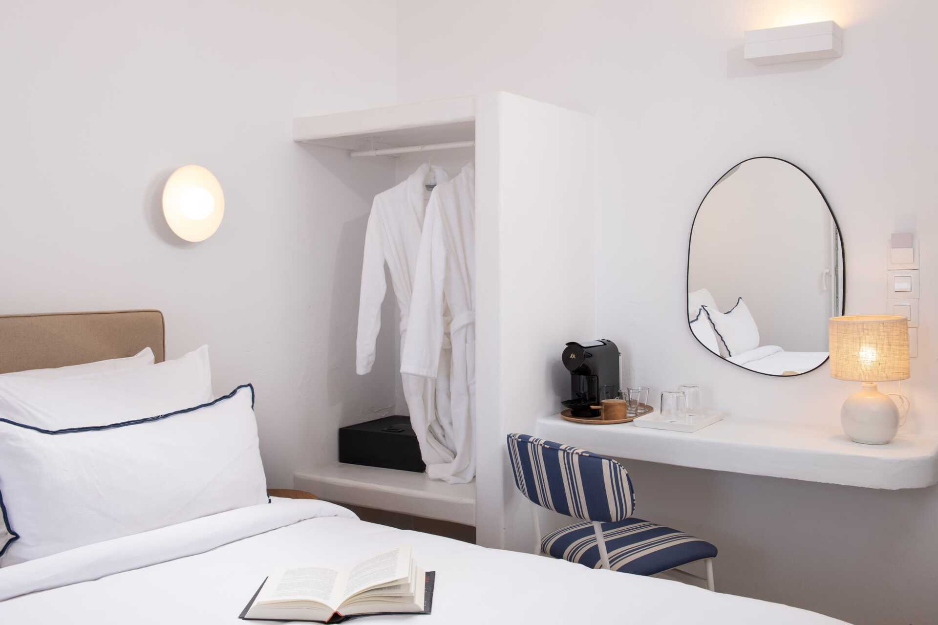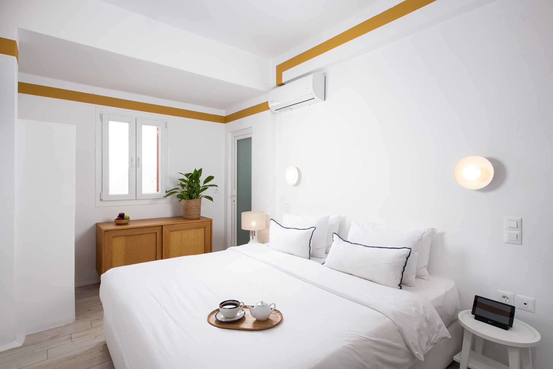 Dobbeltrom med balkong eller terrasse, noen med begrenset havutsikt. En dobbeltseng. Wifi, luftkondisjonering og safe er inkludert. Kjøleskap. Espressomaskin. TV. Badekåper og tøfler. Hårføner. Dusj og wc. Rengjøring 7 ggr/uke.
