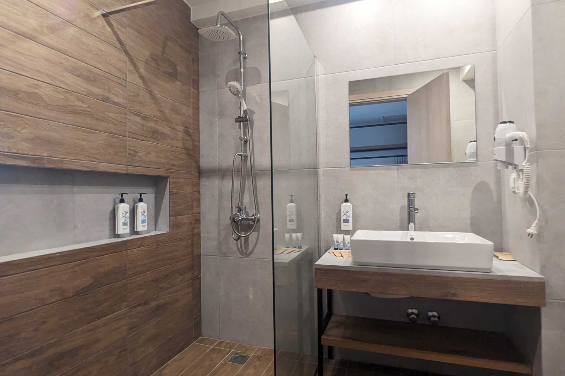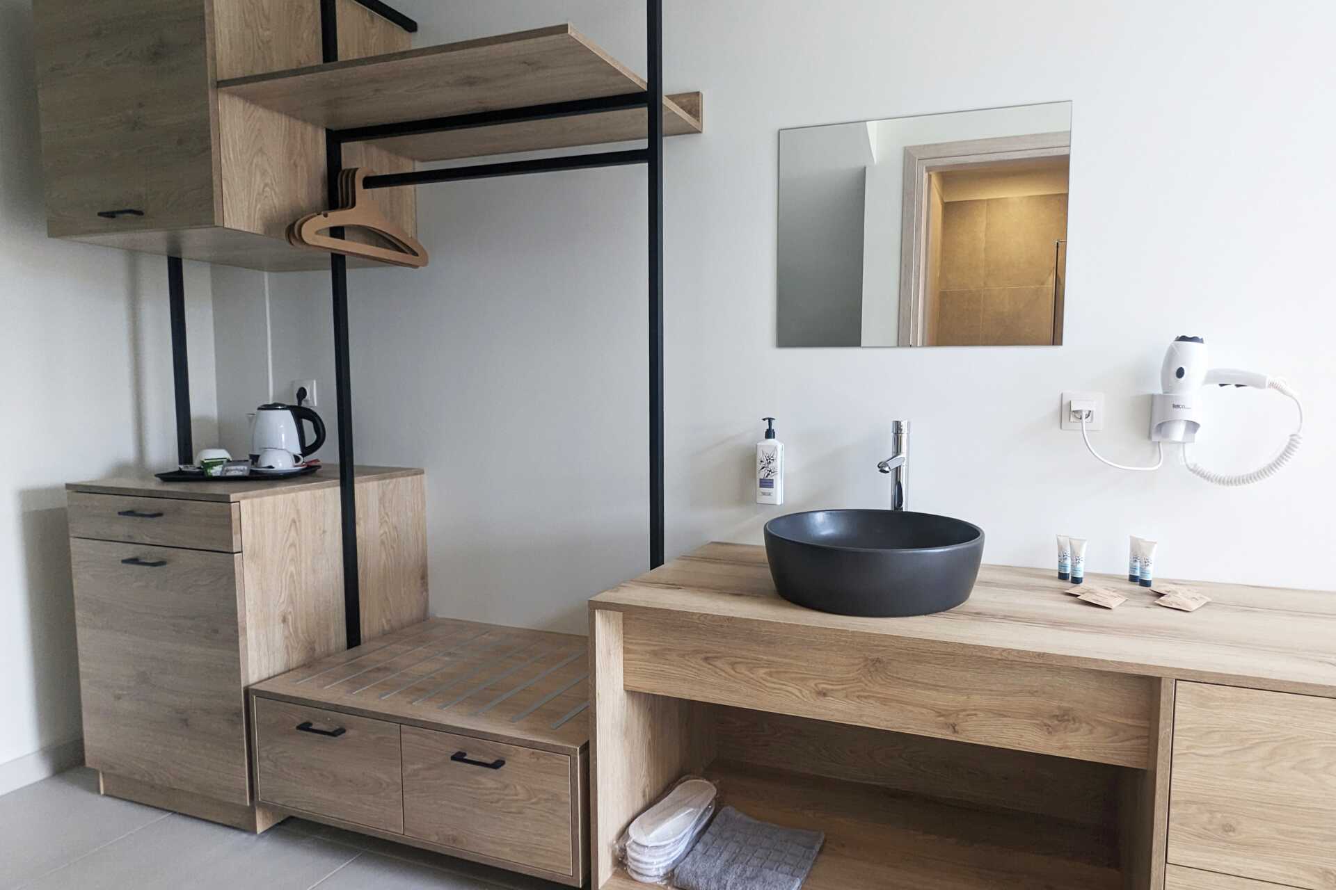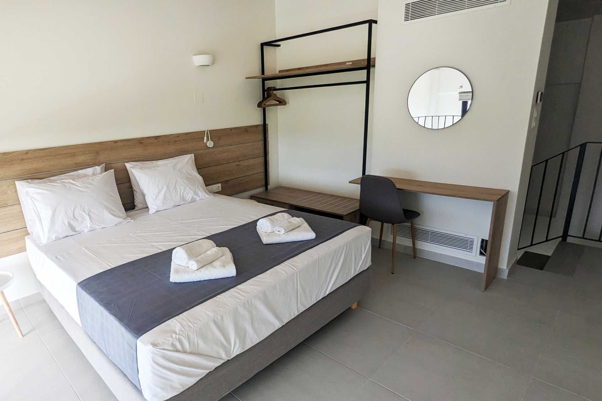 Dobbeltrom i etasje med balkong. I inngangsetasjen er det en dobbeltseng eller to enkeltsenger. En trapp opp er det sovehems med en dobbeltseng. Wifi og luftkondisjonering er inkludert. Kjøleskap. Vannkoker samt kaffe og te. TV. Tøfler. Hårføner. Dusj og wc. Rengjøring 6 ggr/uke. Barn under 2 år regnes inn i maksantallet i rommet.