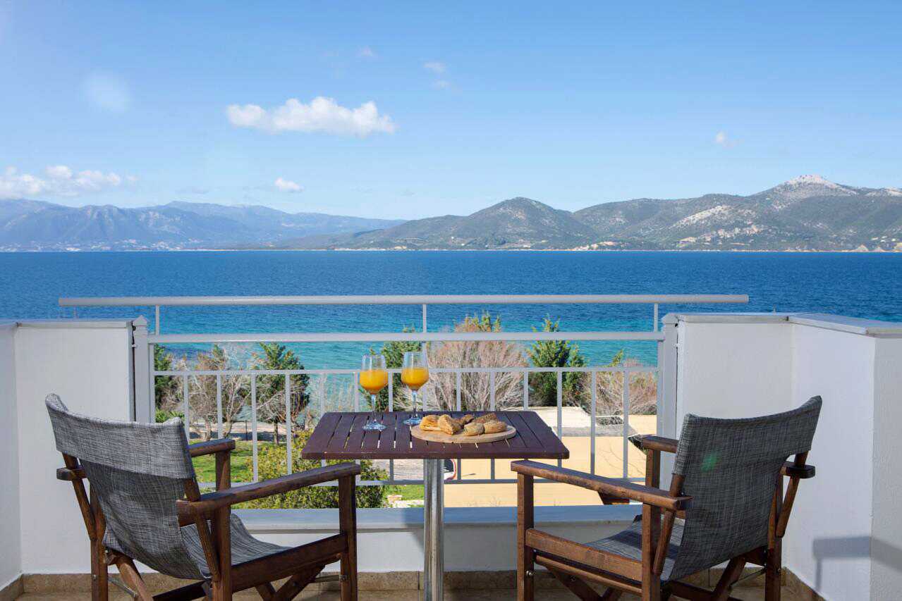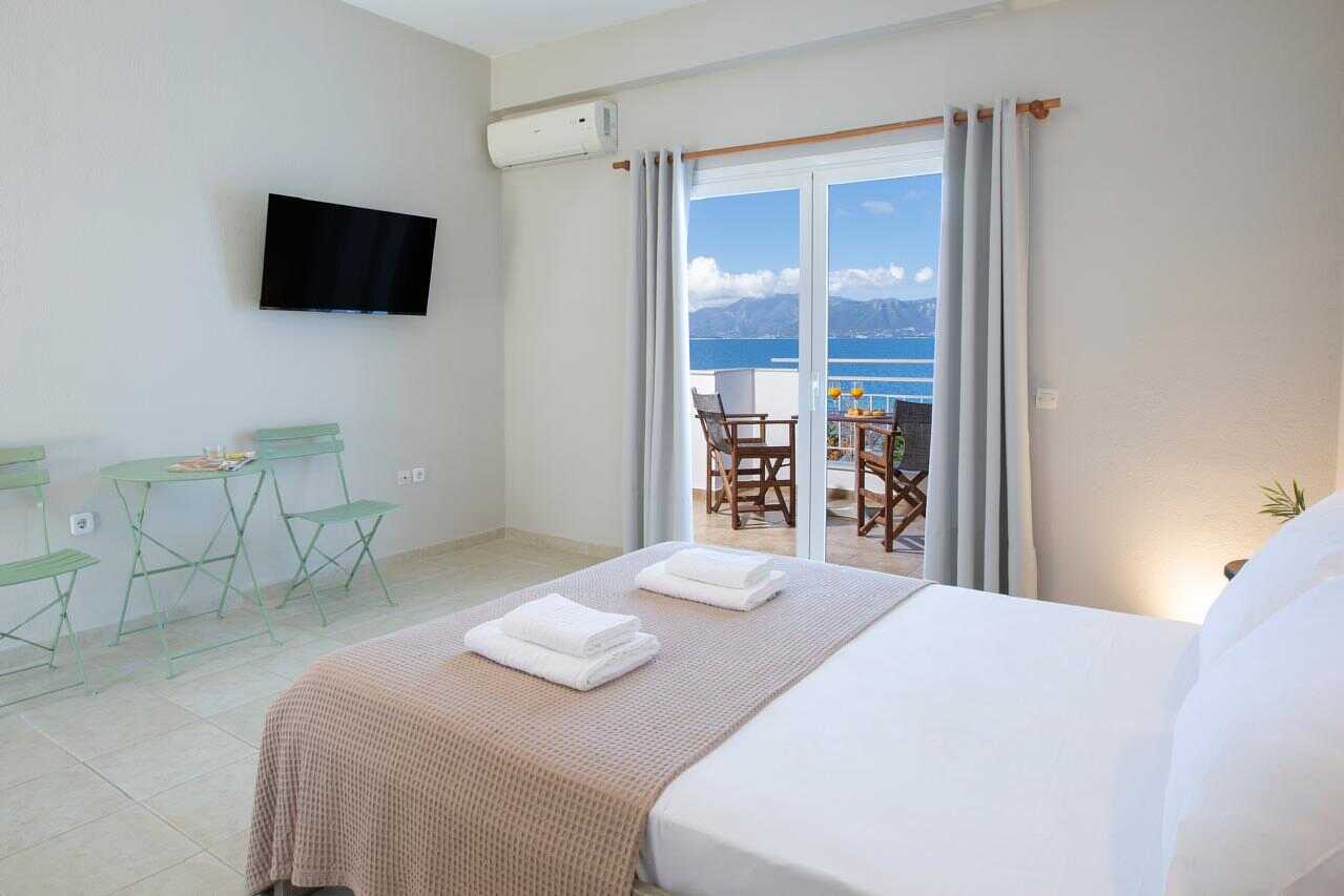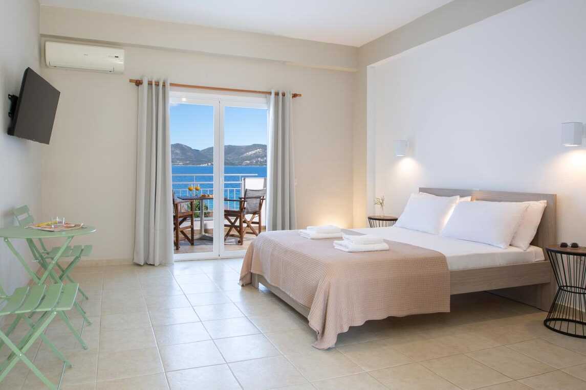 Dobbeltrom med markterrasse og begrenset havutsikt eller med balkong og havutsikt. En dobbeltseng. Mulig med ekstraseng i enkeltseng. Wifi, luftkondisjonering og safe inkludert. Lite kjøleskap. Vannkoker samt kaffe og te. TV. Dusj og wc. Rengjøring 6 ggr/uke.