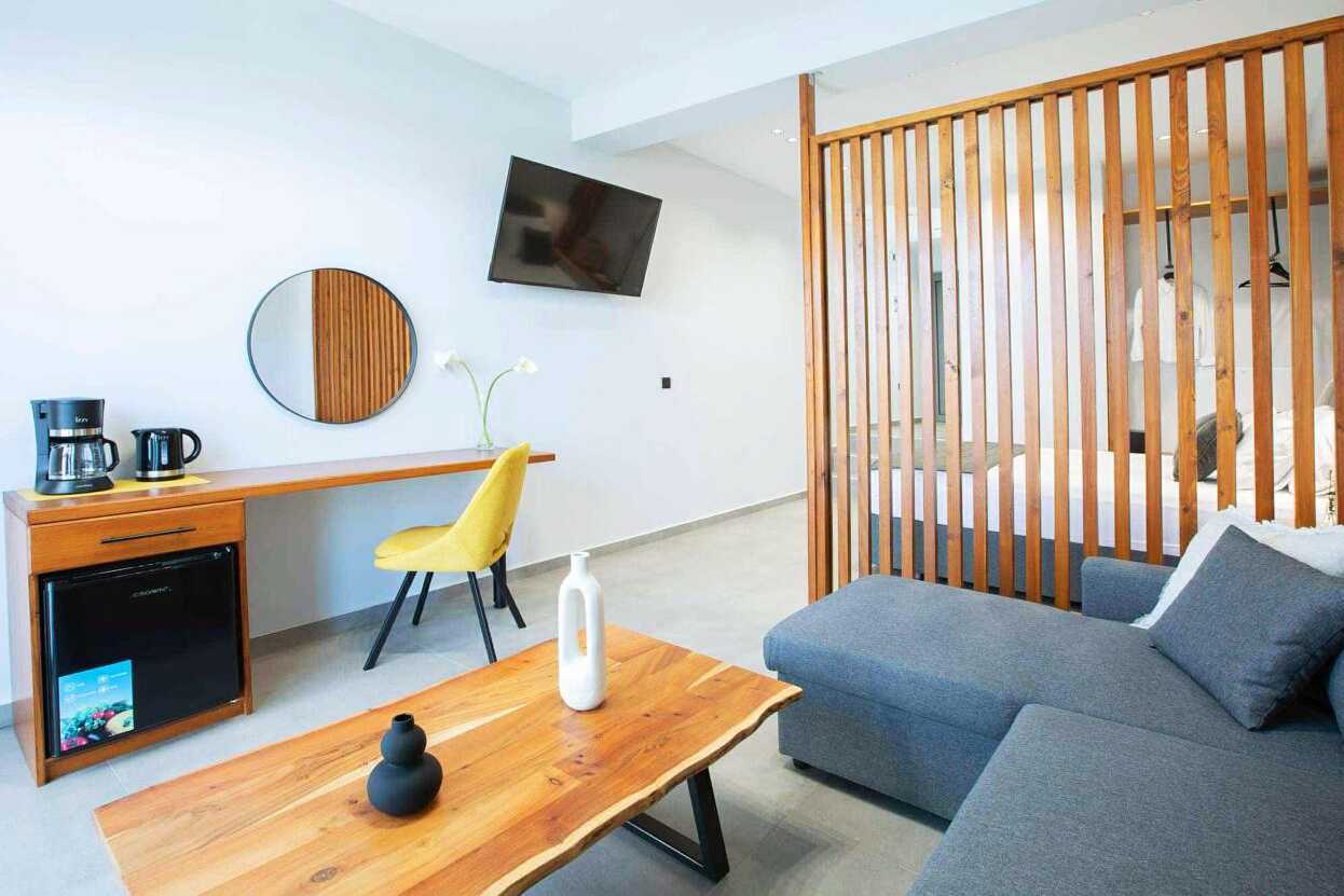 Deluxesuite med direkte utgang til et delt basseng. Markterrasse med utsikt mot bassenget. En dobbeltseng eller to enkeltsenger. Wifi, luftkondisjonering og safe inkludert. TV med lokale kanaler. Lite kjøleskap. Hårføner. Dusj og wc. Rengjøring 5 ggr/uke.