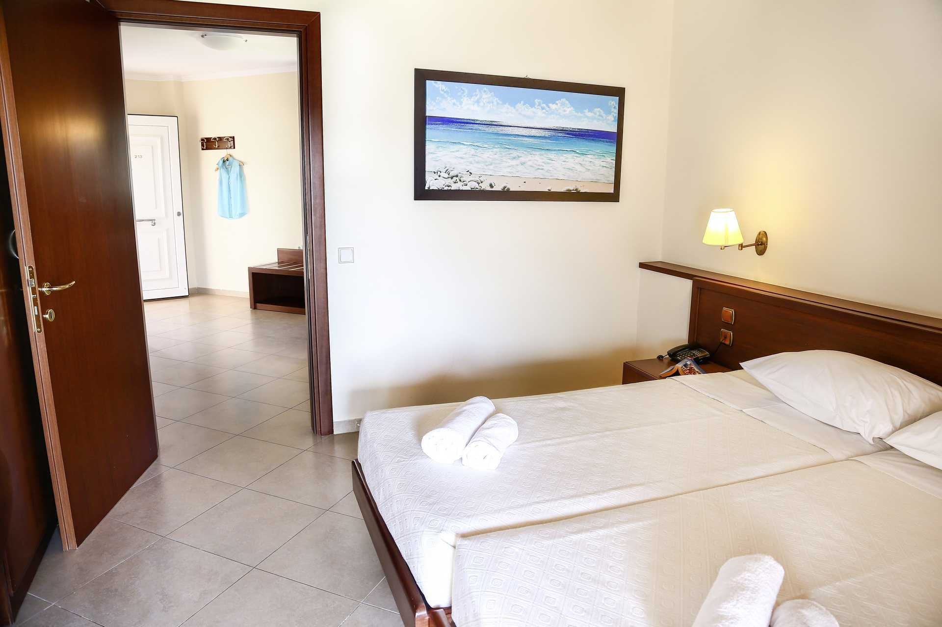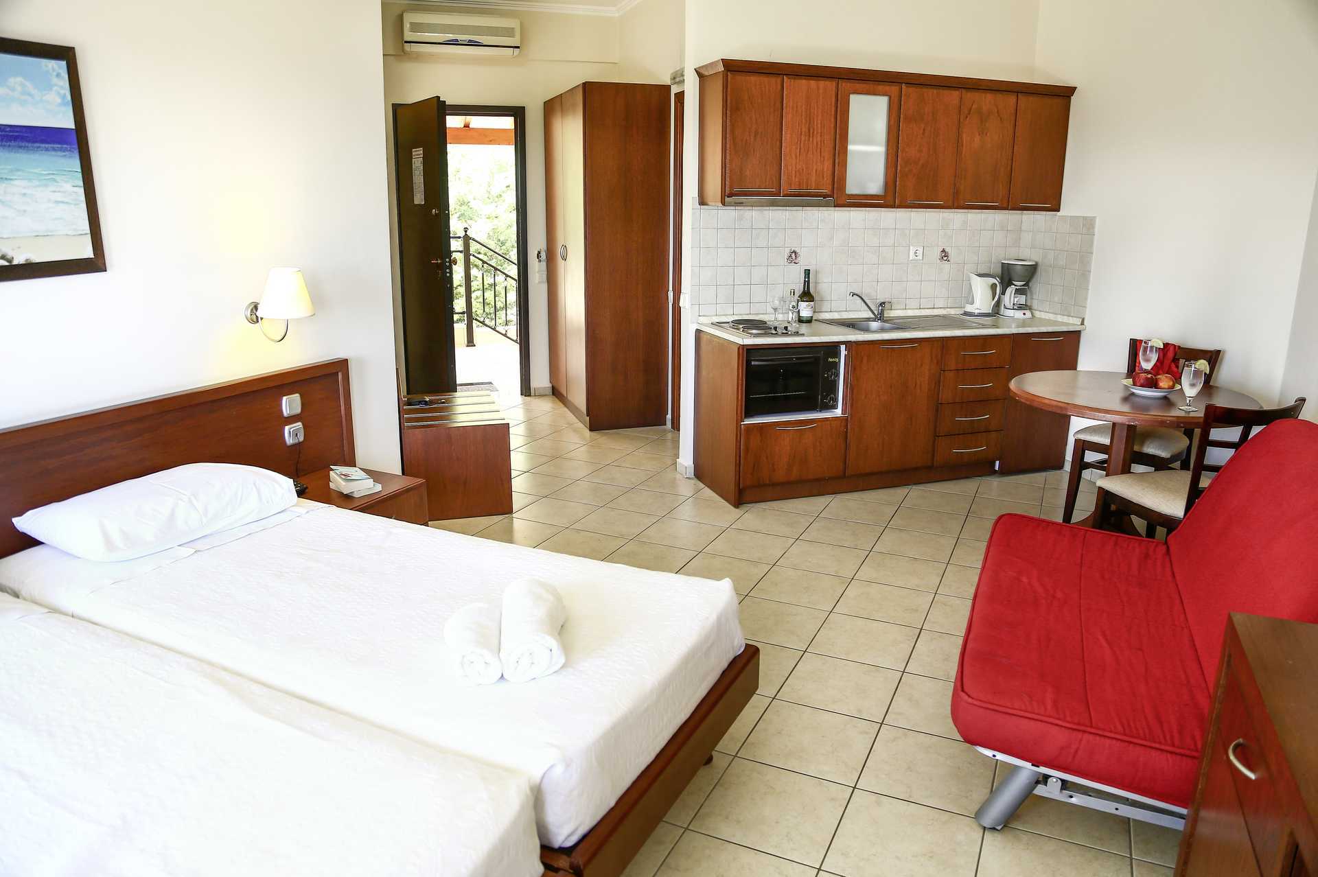 Ettromsleilighet med balkong eller terrasse. Soverom kombinert med minikjøkken. To enkeltsenger. Mulig med ekstrasenger i sovesofa. Minikjøkken med kjøleskap, kokeplater, liten stekeovn, kaffetrakter, vannkoker og enkelt kjøkkenutstyr. Wifi og safe inkludert. Luftkondisjonering mot avgift. TV. Hårføner. Dusj og wc. Rengjøring 7 ggr/uke.
