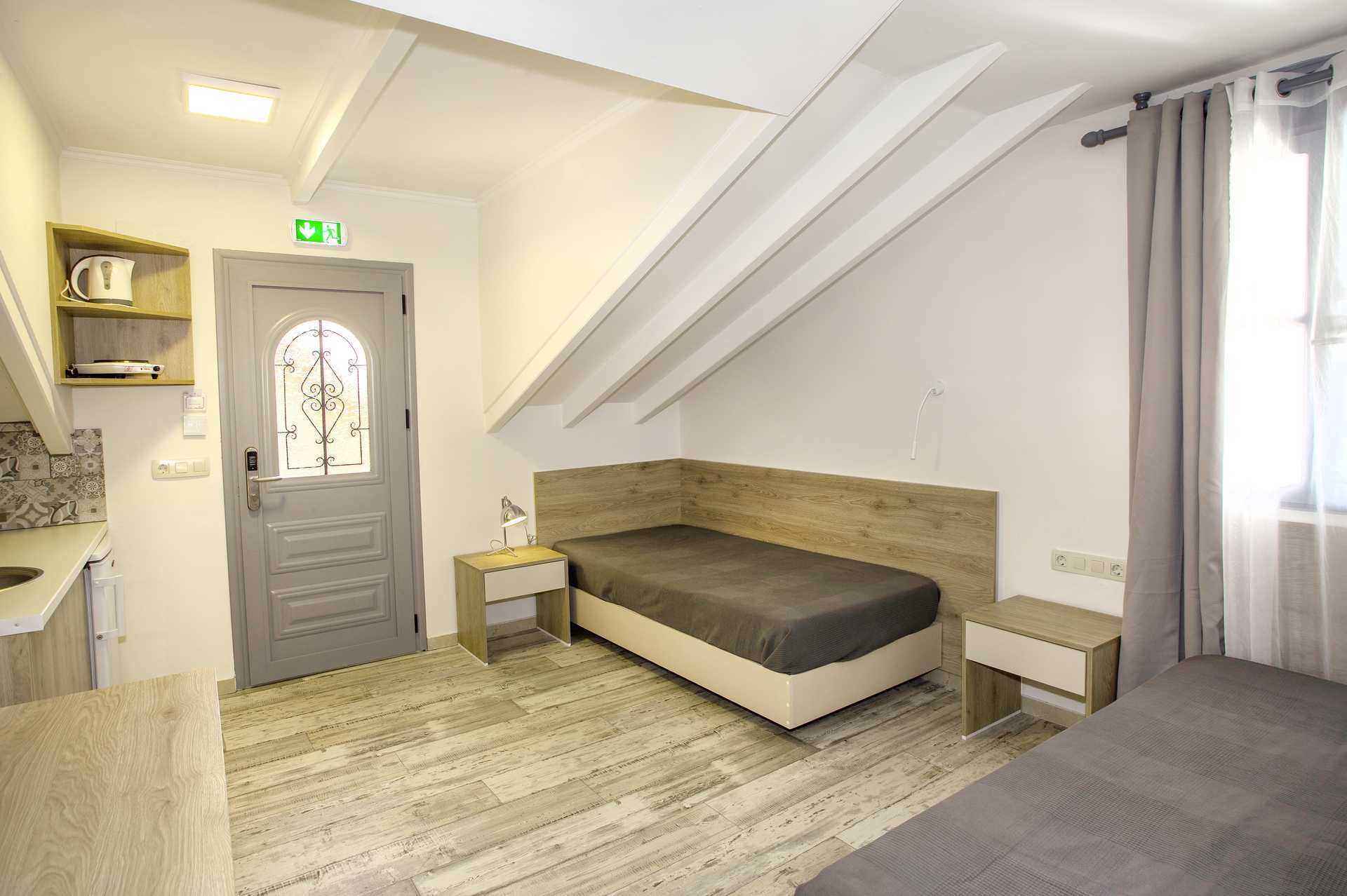 Ettromsleilighet i etasje med markterrasse eller delt uteplass. Leilighetene ligger i hotellets sidebygning. Nede er det en kombinert stue med minikjøkken og et bad med hårføner, dusj og wc. Minikjøkken med kjøleskap, kokeplate, vannkoker og grunnleggende kjøkkenutstyr. TV. Ovenpå er det en hems som nås via en smal trapp. En dobbeltseng eller to enkeltsenger. Wifi, luftkondisjonering og safe inkludert. Rengjøring 7 ggr/uke.