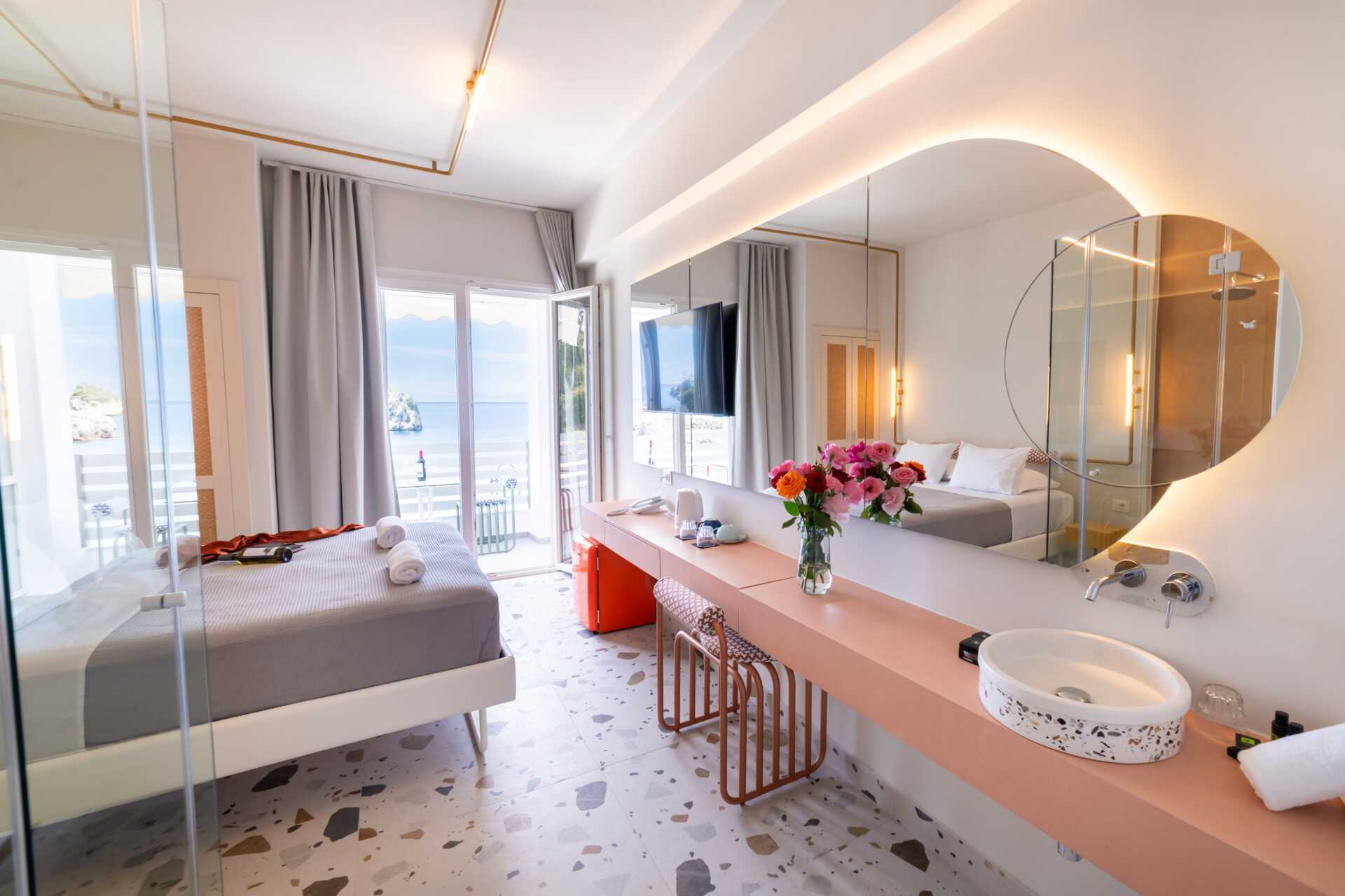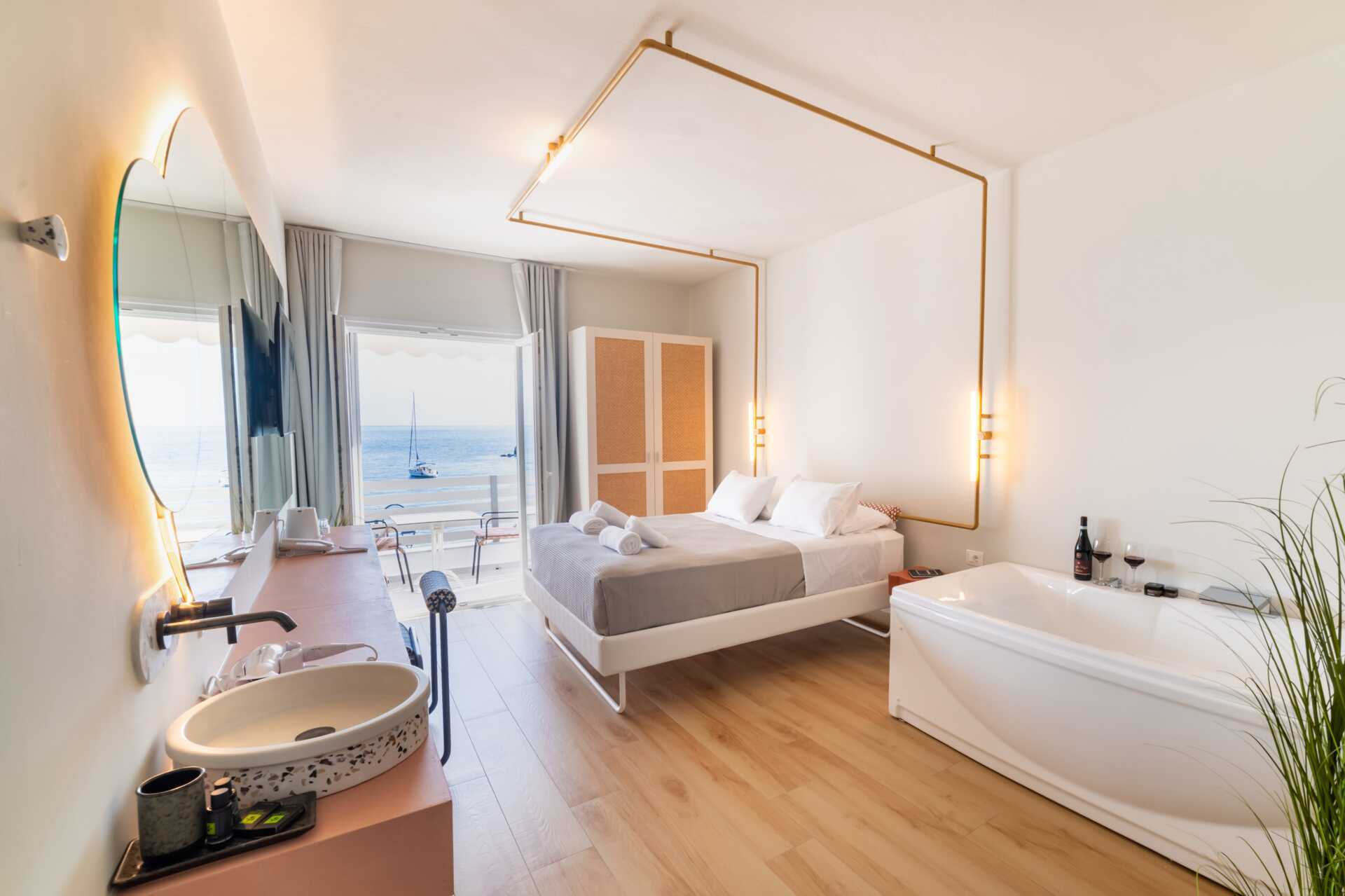 Juniorsuite med balkong og havutsikt. En dobbeltseng. Wifi, luftkondisjonering og safe inkludert. Lite kjøleskap. Vannkoker. TV. Hårføner. Badekåper og tøfler Badekar eller dusj samt wc. Rengjøring 7 ggr/uke.