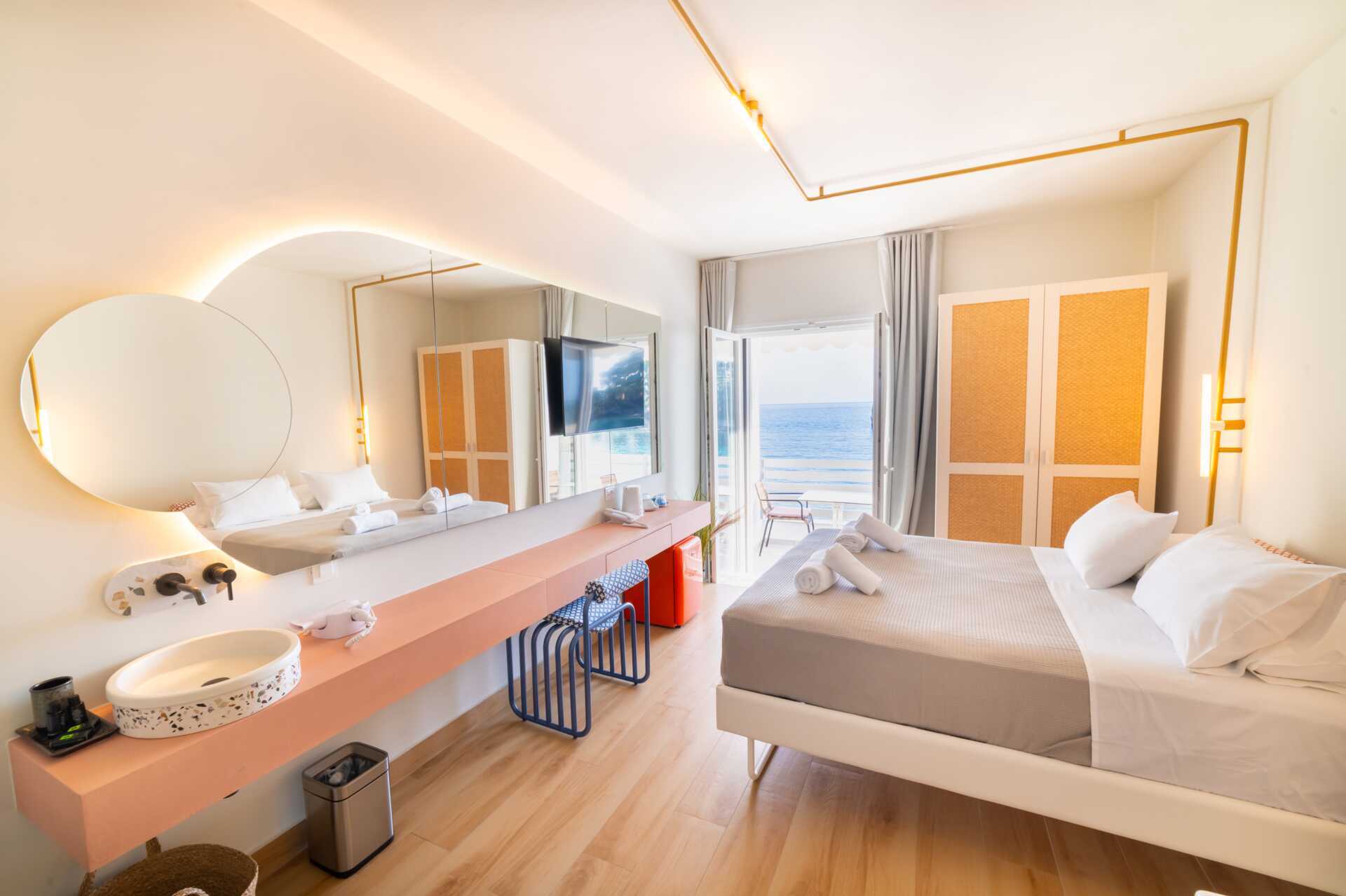 Deluxerom med balkong med havutsikt eller begrenset havutsikt. Alternativt deluxerom med markterrasse og bassengutsikt. En dobbeltseng. Wifi, luftkondisjonering og safe. Lite kjøleskap. Vannkoker. TV. Hårføner.Badekåper og tøfler. Dusj og wc. Rengjøring 7 ggr/uke.