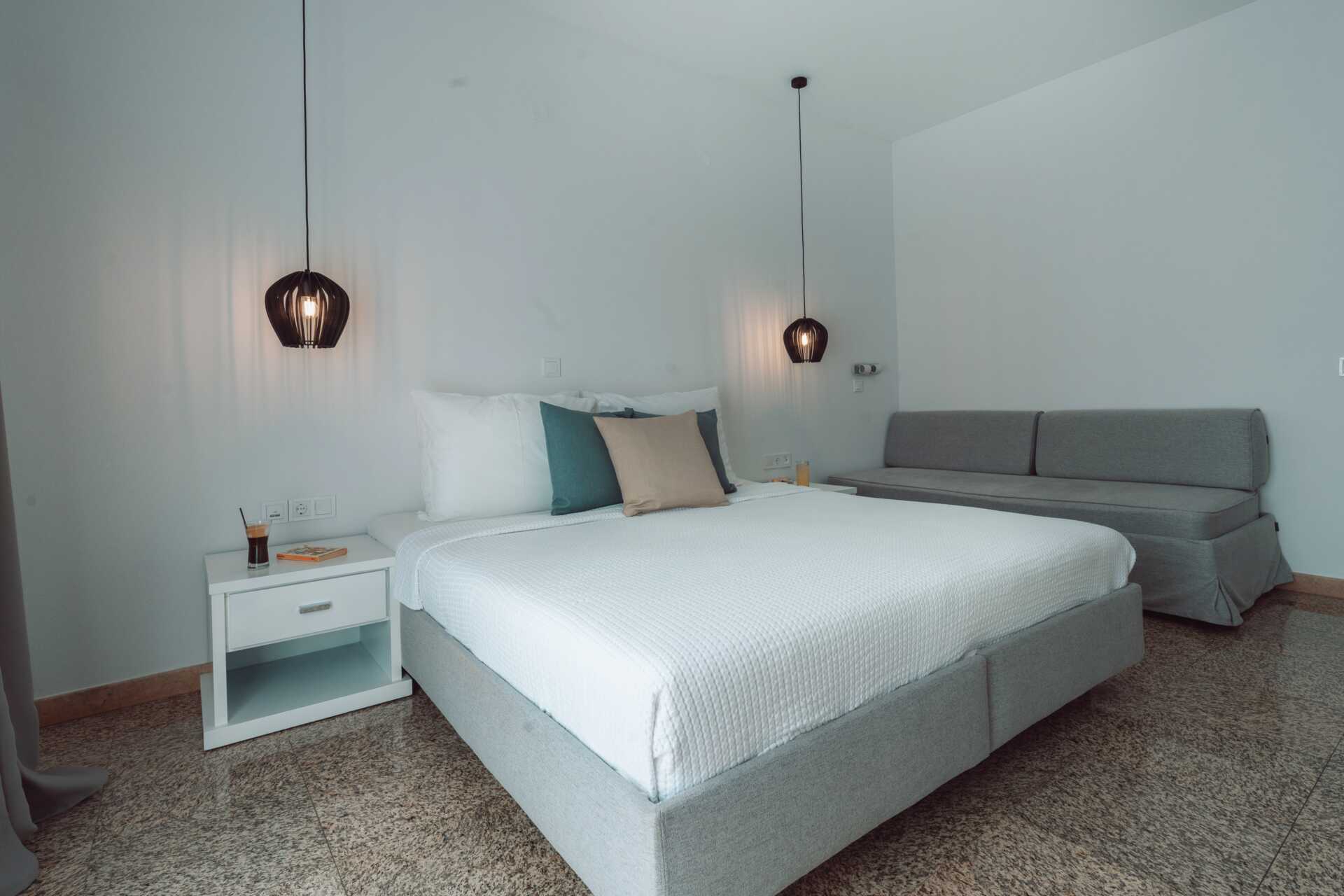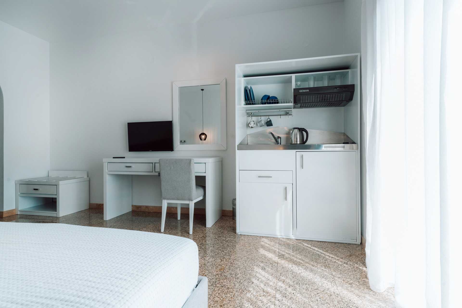 Toromsleilighet med balkong eller terrasse eller med markterrasse. Det er ingen dør mellom soverommet og stuen med minikjøkken. En dobbeltseng eller to enkeltsenger. Mulig med en ekstraseng i sovesofa. Minikjøkken med kokeplater, kjøleskap, vannkoker og enkelt kjøkkenutstyr. Wifi, safe og luftkondisjonering inkludert. TV. Hårføner. Dusj og wc. Rengjøring 7 ggr/uke.