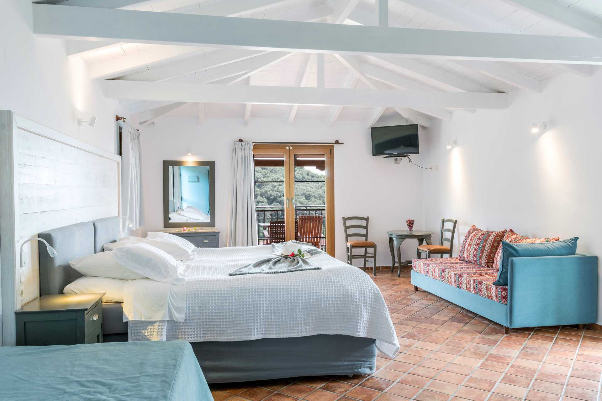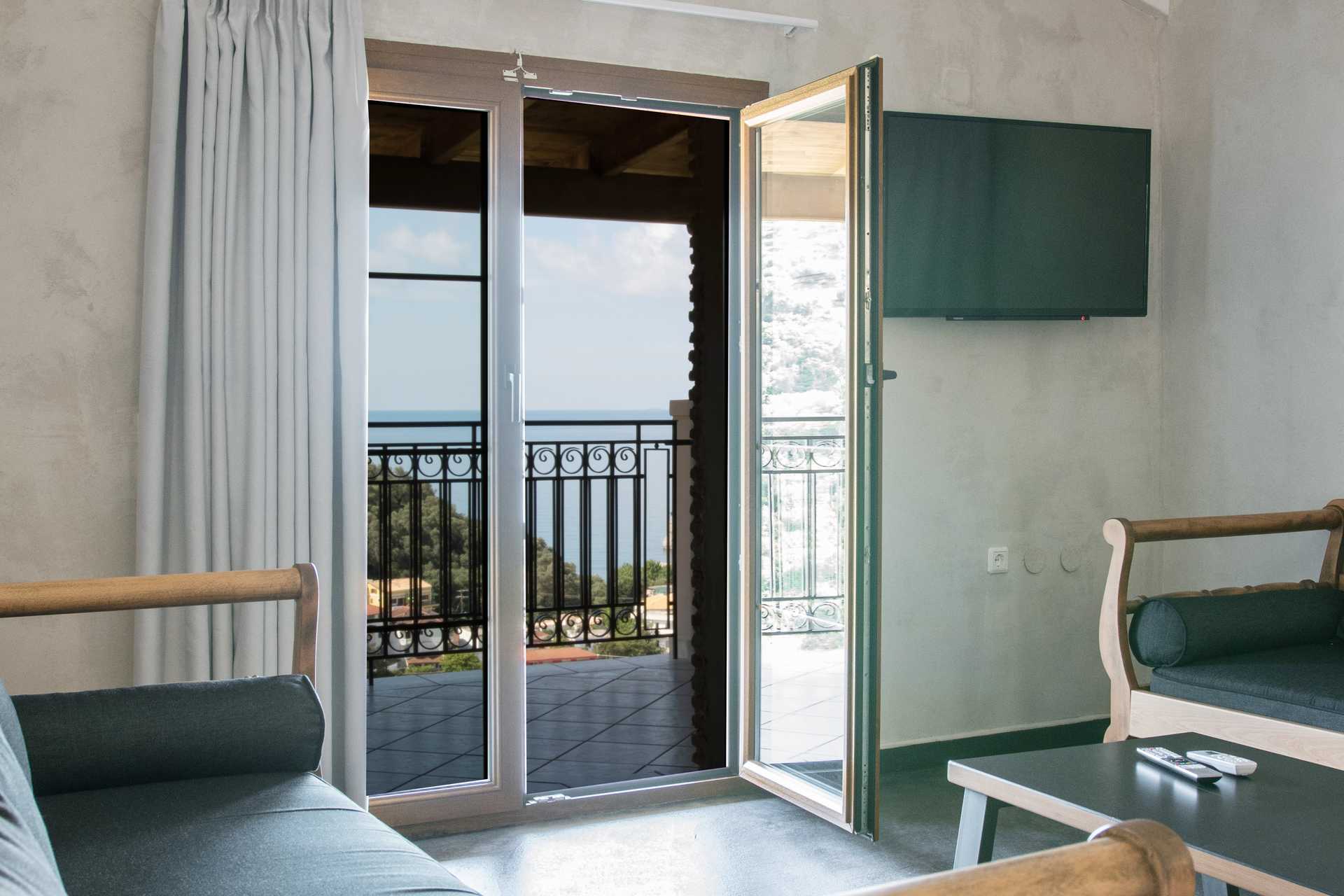 Juniorsuite med balkong og havutsikt. En dobbeltseng. Mulig med en ekstraseng i sovesofa. Wifi, luftkondisjonering og safe inkludert. Kjøleskap. En flaske vann venter på rommet ved ankomst. TV. Badekar eller dusj samt wc. Rengjøring 6 ggr/uke.