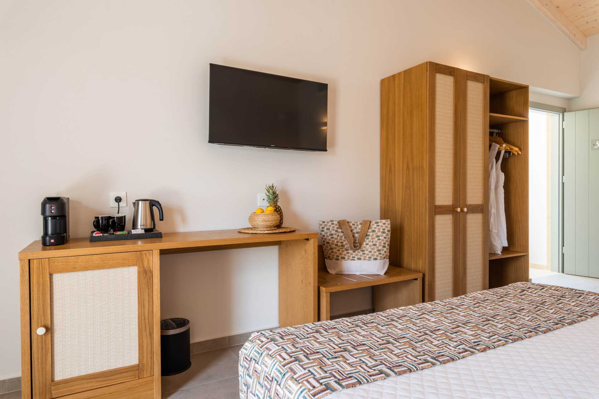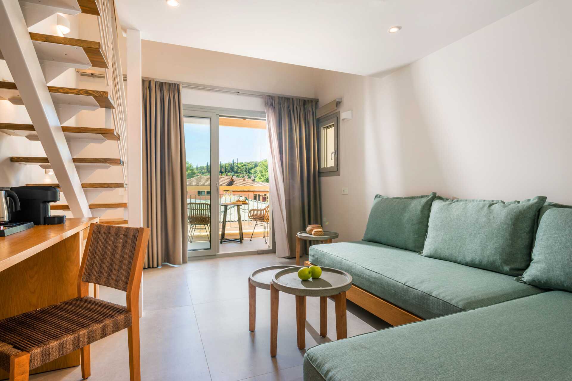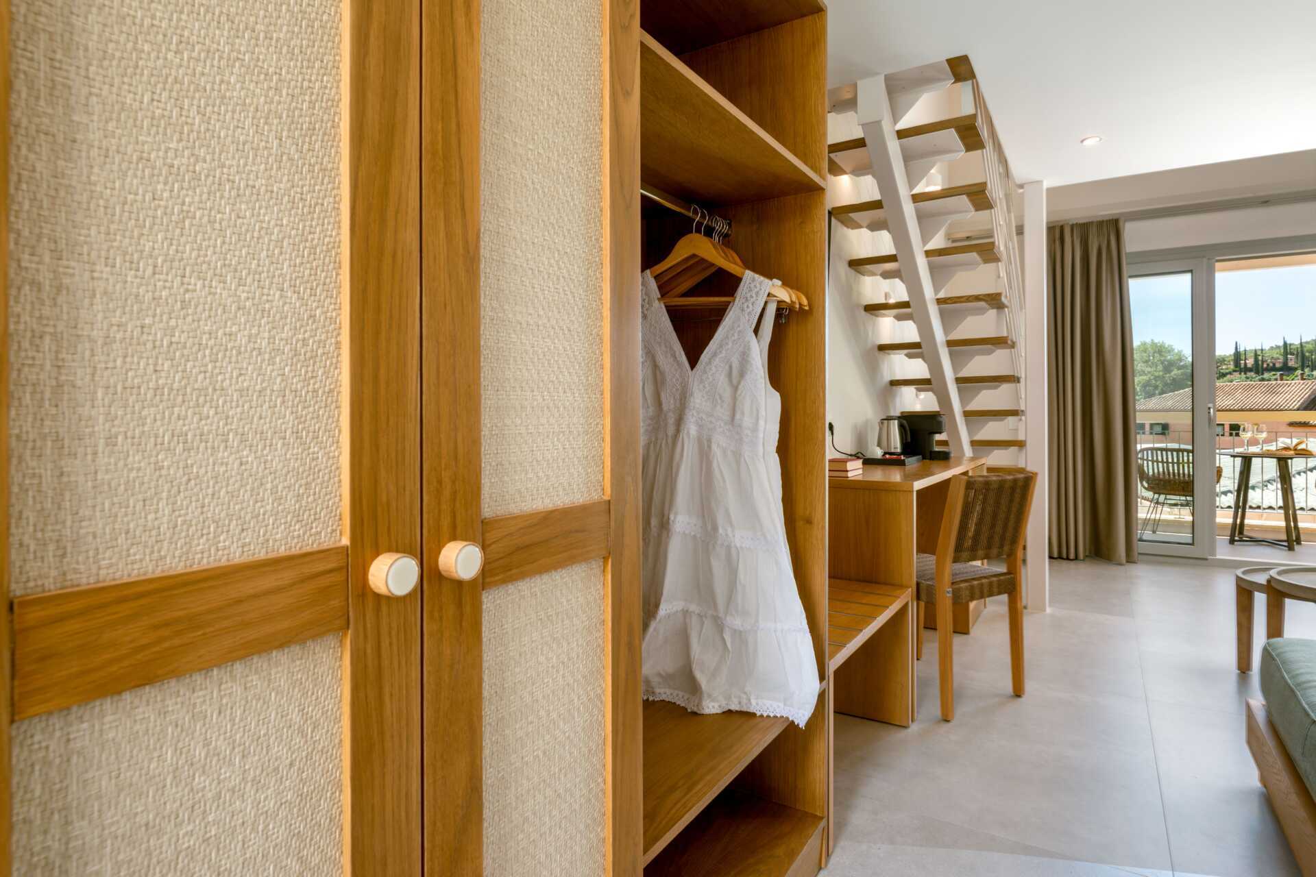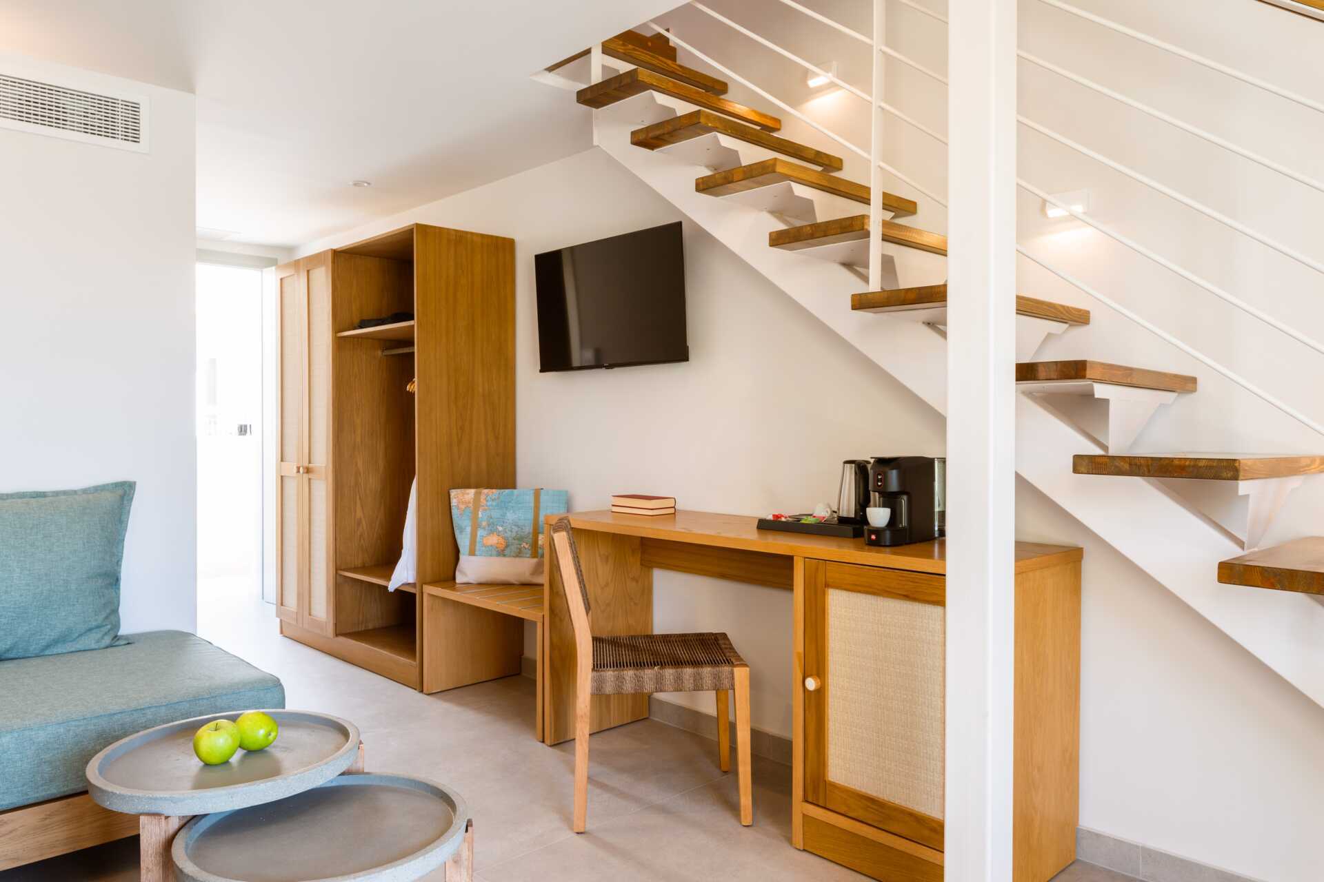 Dobbeltrom med balkong, noen med havutsikt. Stue med sovesofaer samt et bad med badekar og wc. En trapp opp er det soverom med dobbeltseng, balkong og bad med hårføner, dusj og wc. Wifi, luftkondisjonering og safe er inkludert. Kjøleskap. Vannkoker samt kaffe og te. Illy kaffemaskin, kapsler er inkludert ved ankomst og kan deretter kjøpes i resepsjonen. TV. Tøfler. Rengjøring 7 ggr/uke.
