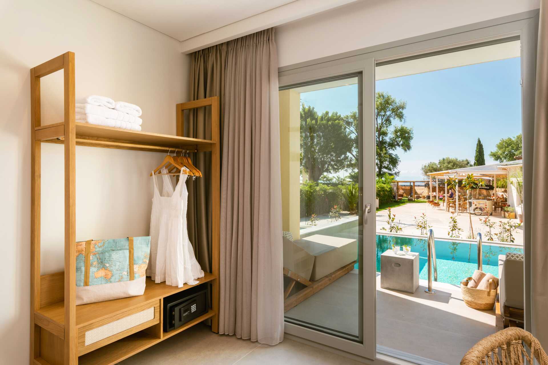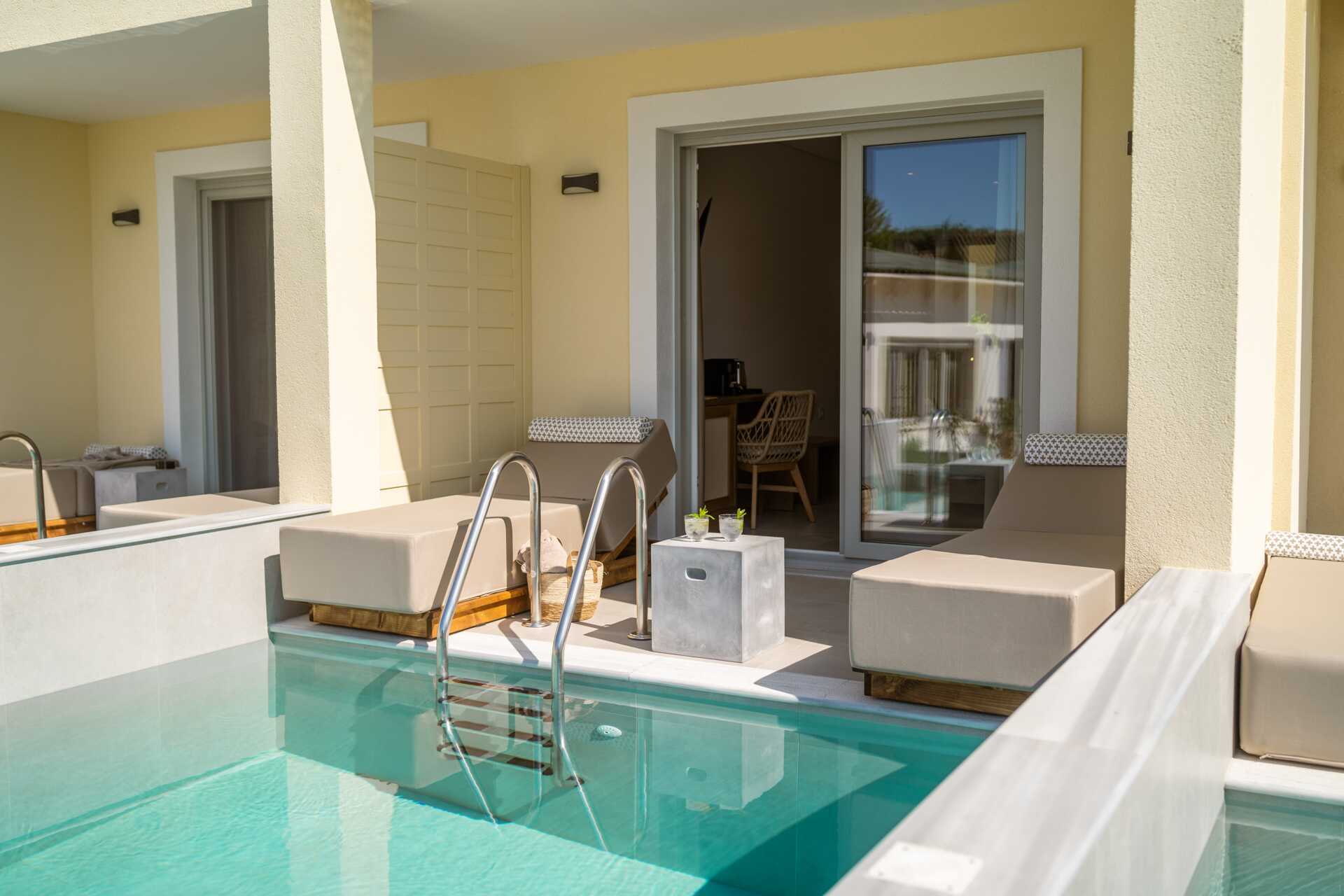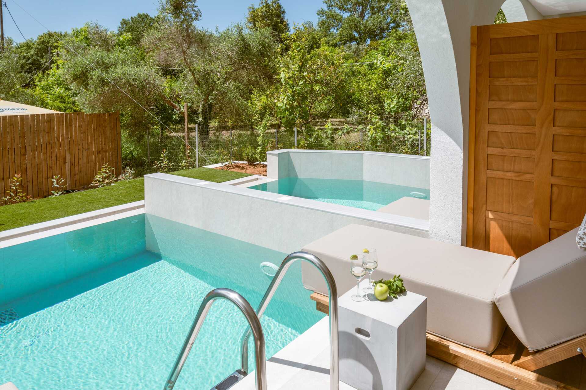 Dobbeltrom med privat basseng med markterrasse. På terrassen er det to solsenger og en stige ned i bassenget. En dobbeltseng. Wifi, luftkondisjonering og safe er inkludert. Kjøleskap. Vannkoker samt kaffe og te. Illy kaffemaskin, kapsler er inkludert ved ankomst og kan deretter kjøpes i resepsjonen. TV. Hårføner. Tøfler. Baderom med dusj og wc. Rengjøring 7 ggr/uke.