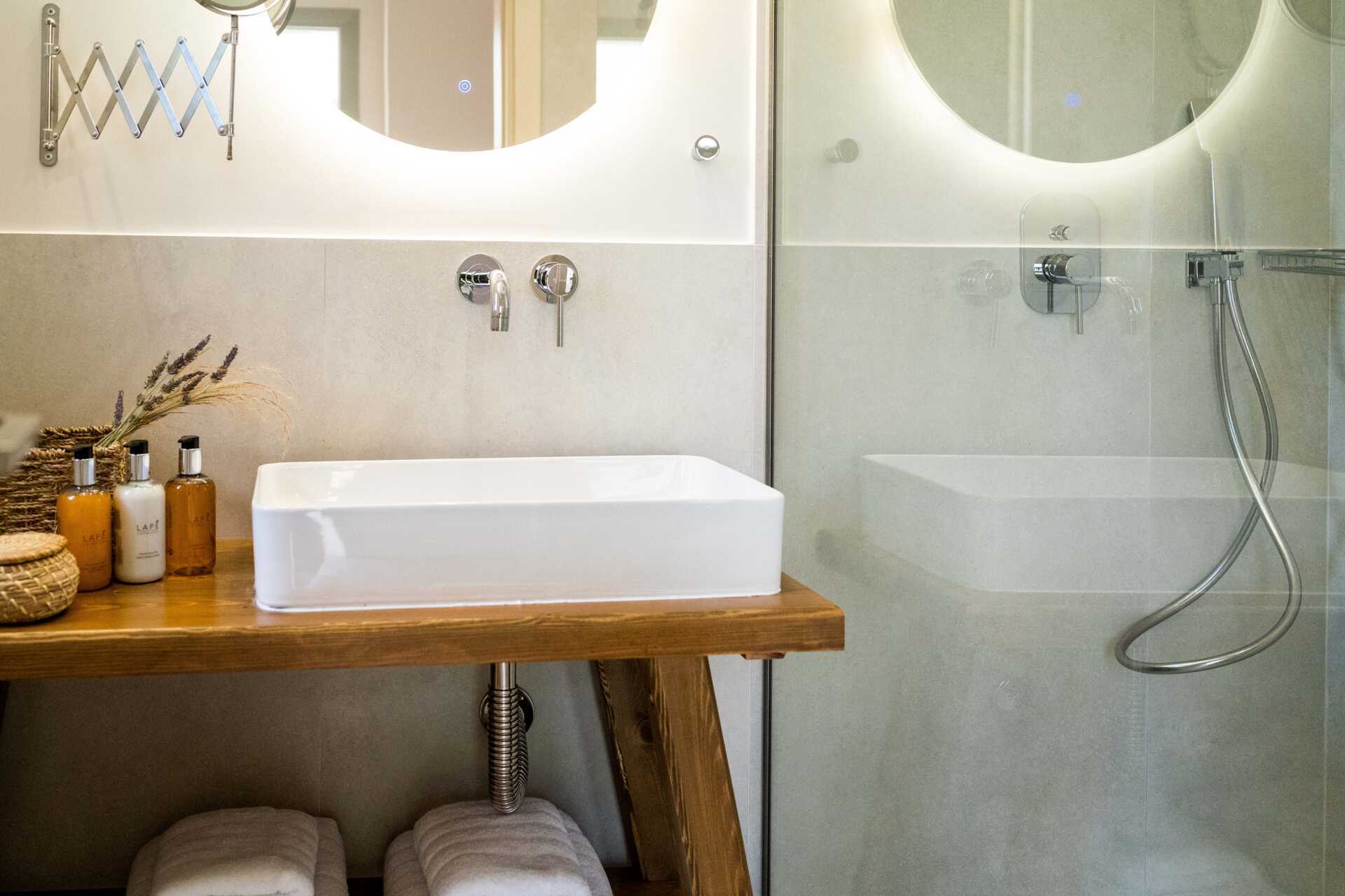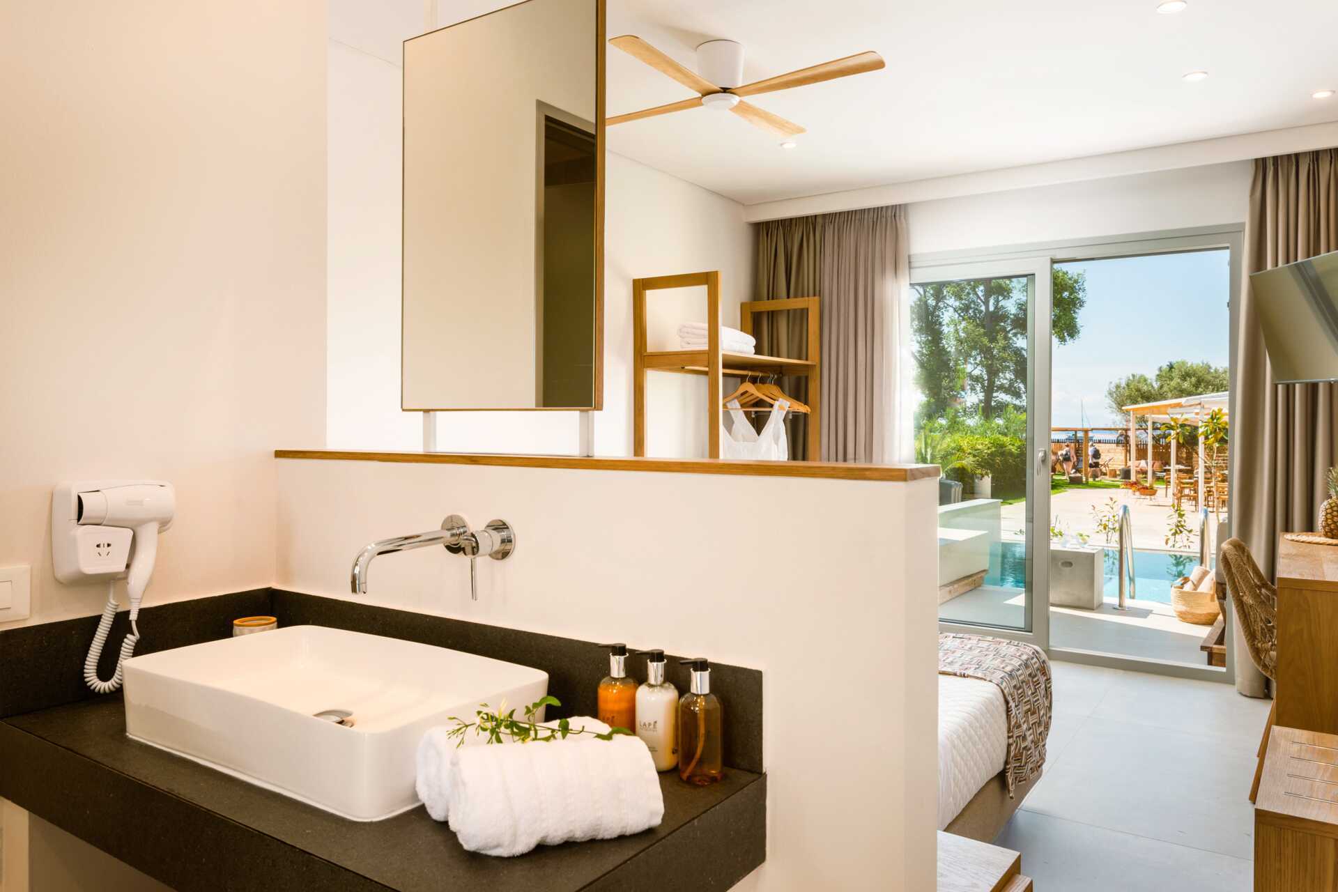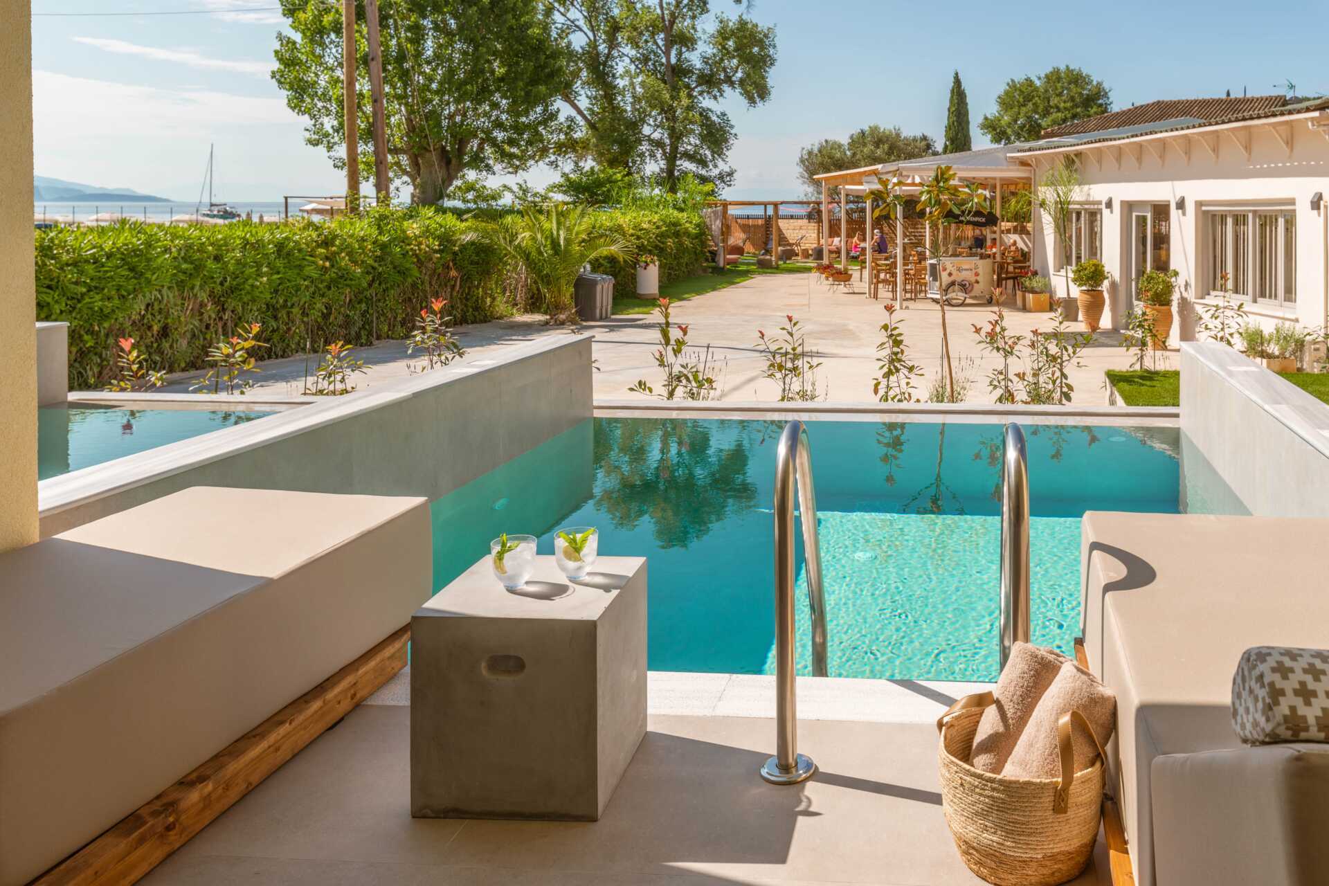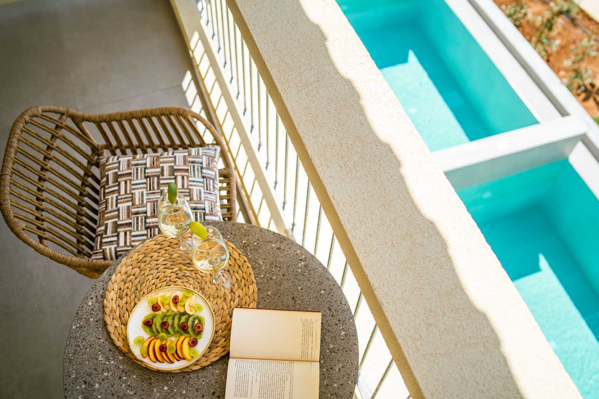 Dobbeltrom med privat basseng med markterrasse. På terrassen er det to solsenger og en stige ned i bassenget. En dobbeltseng. Wifi, luftkondisjonering og safe er inkludert. Kjøleskap. Vannkoker samt kaffe og te. Illy kaffemaskin, kapsler er inkludert ved ankomst og kan deretter kjøpes i resepsjonen. TV. Hårføner. Tøfler. Baderom med dusj og wc. Rengjøring 7 ggr/uke.
