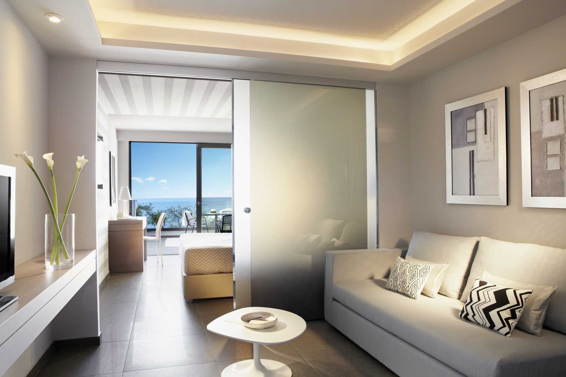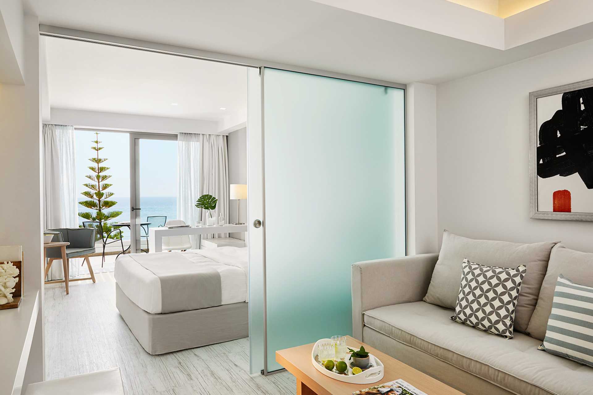 Juniorsuite superior med balkong eller terrasse og havutsikt. Rommene ligger i hovedbygningen ved bassenget og har to deler, et soverom og en stue som kan skilles med en skyvedør i glass. En dobbeltseng eller to enkeltsenger. Mulig med ekstrasenger i sovesofa. Wifi, luftkondisjonering og safe inkludert. Kjøleskap. TV. Tøfler. Hårføner. Baderom med dusj og wc. Rengjøring 7 ggr/uke.