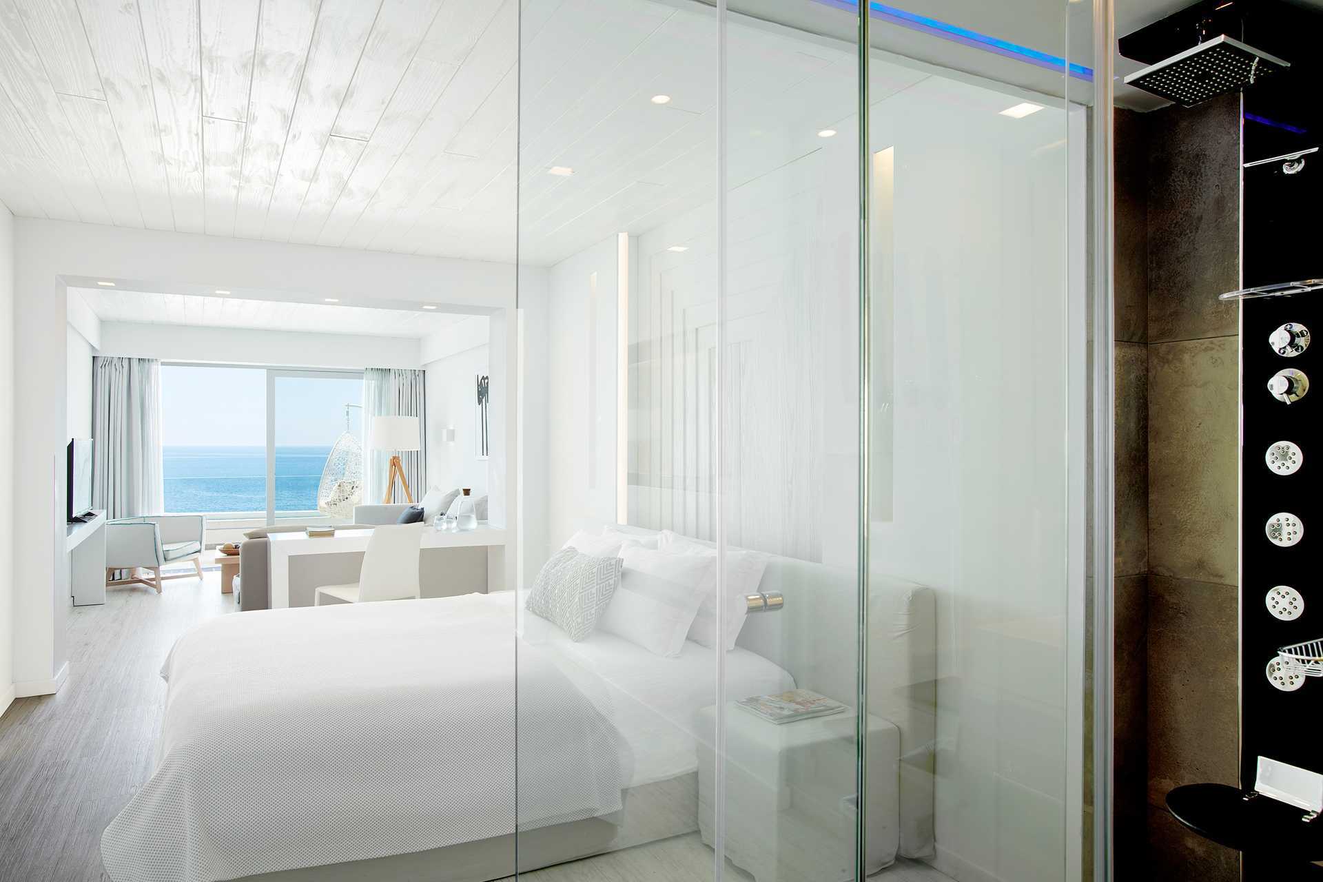Deluxerom med balkong eller terrasse samt jacuzzi og havutsikt. Rommene ligger i bygningen nærmest sjøen og har to deler, et soverom og en stue som kan skilles med en skyvedør i glass. En dobbeltseng eller to enkeltsenger. Mulig med en ekstraseng i sovesofa. Wifi, luftkondisjonering og safe inkludert. Kjøleskap. TV. Tøfler. Hårføner. Baderom med dusj og wc. Rengjøring 7 ggr/uke.