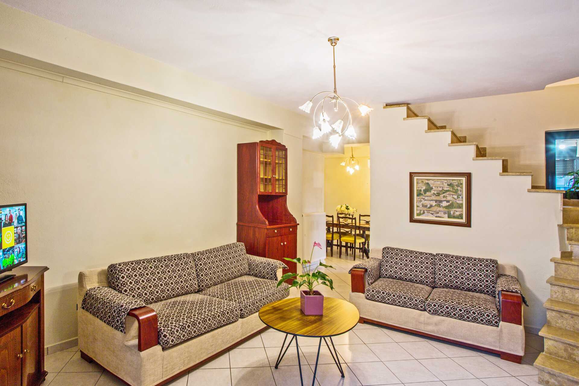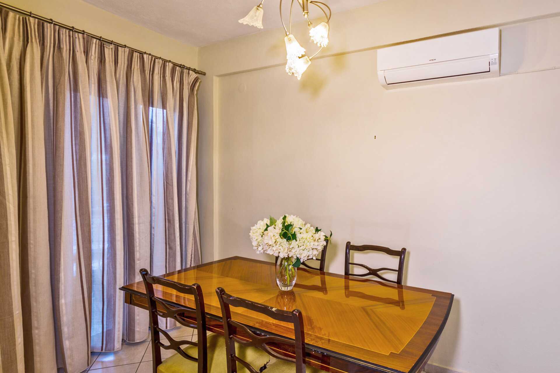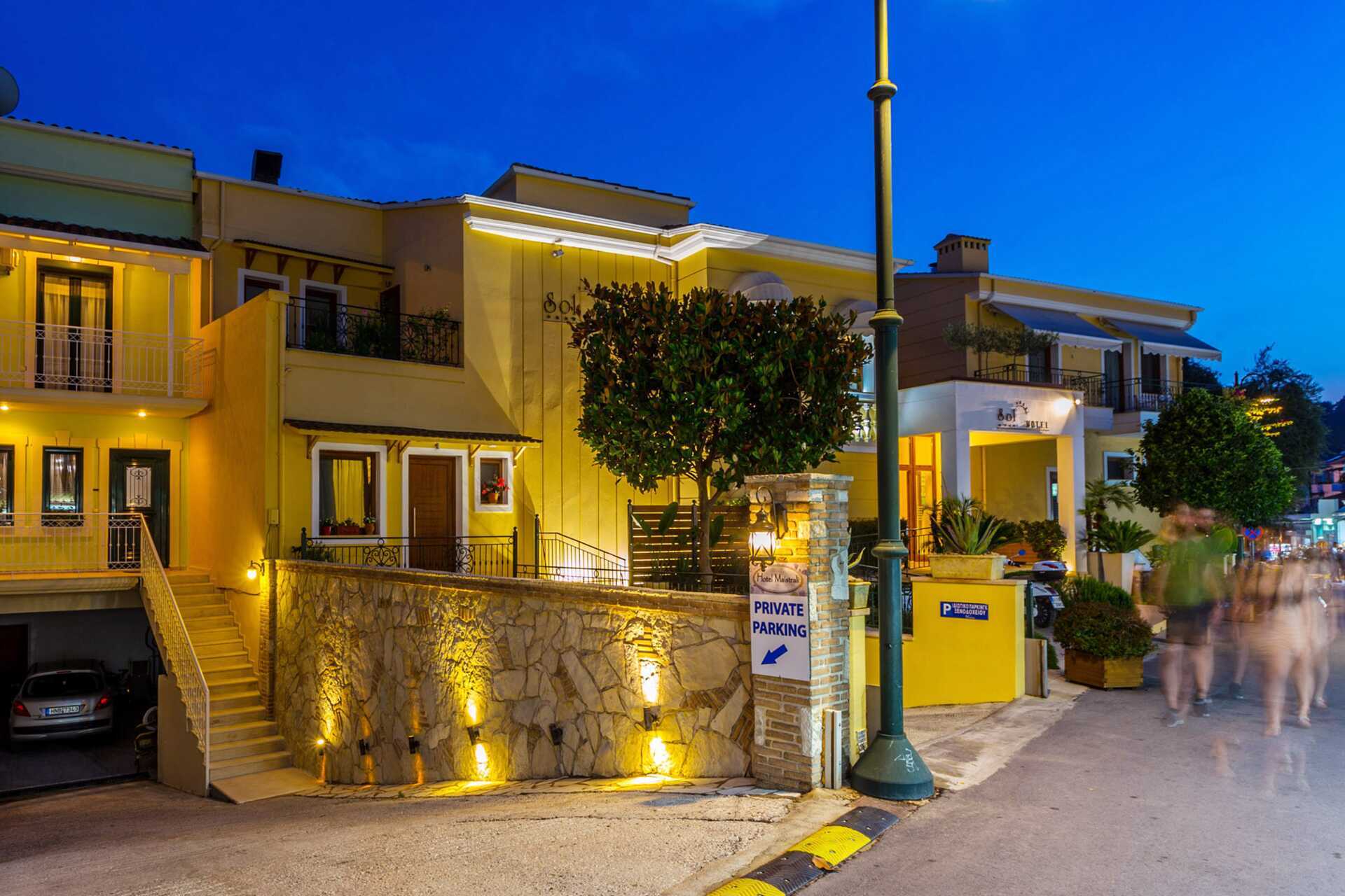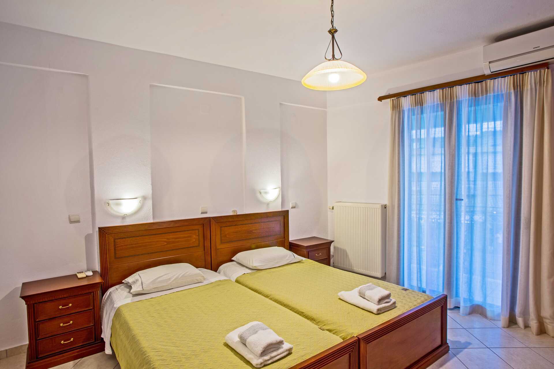 Familierom i etasje med balkong og havutsikt, ligger rett ved siden av hotell Maistrali. Nede er det en stue med to sofaer, et minikjøkken og et lite bad med badekar og wc. En trapp opp er det et soverom med to enkeltsenger, et bad med dusj og to balkonger, der den ene har havutsikt. Wifi, luftkondisjonering og safe inkludert. TV. Hårføner. Rengjøring 7 ggr/uke.