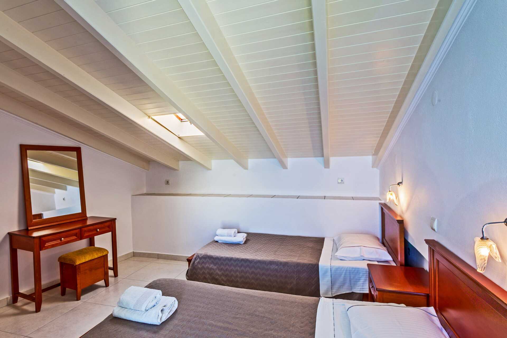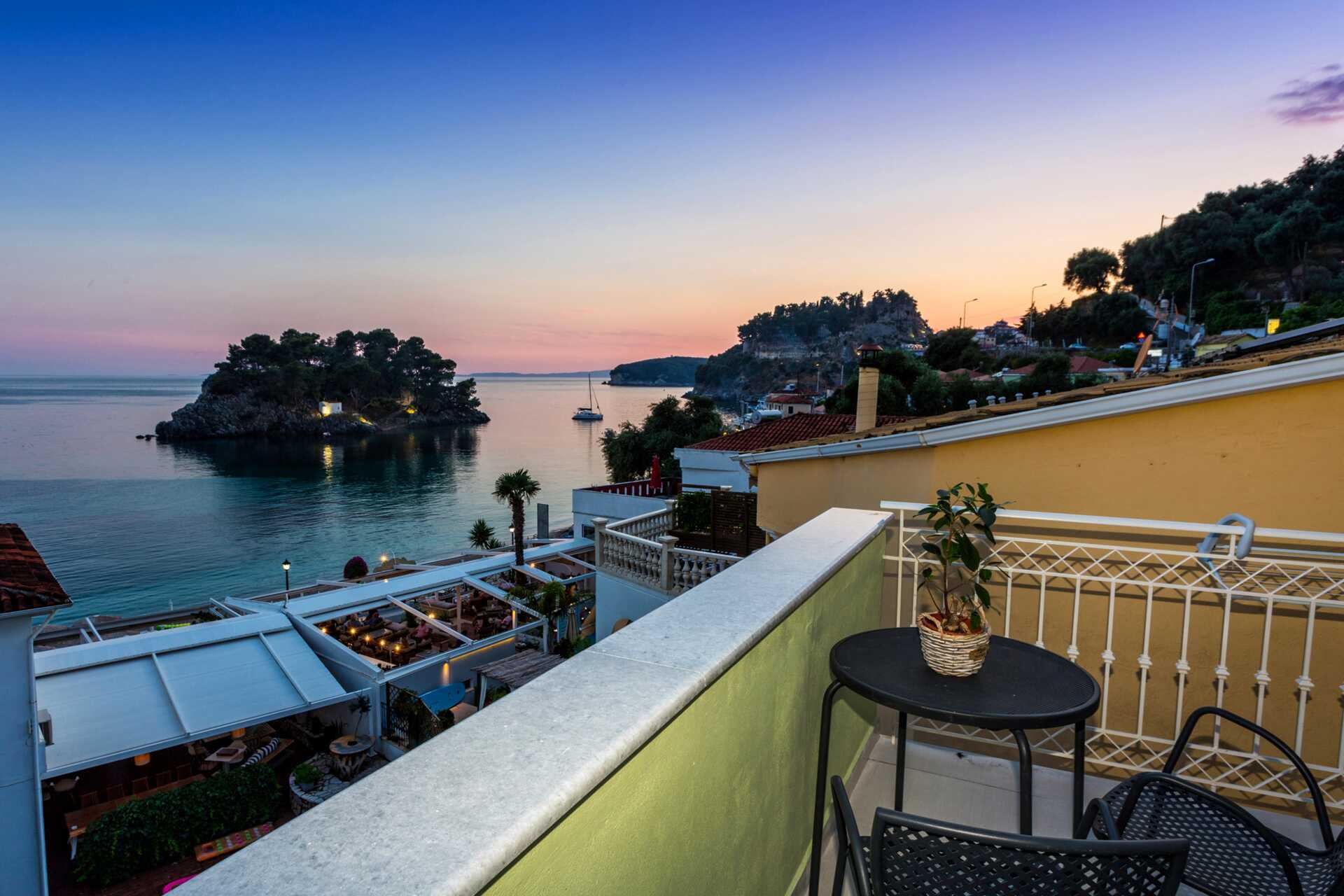 Deluxerom med balkong og havutsikt. Deluxerommene som ligger øverst i huset har skråtak. En dobbeltseng eller to enkeltsenger. Mulig med ekstraseng for et barn i noen rom. Vær oppmerksom på at rommet blir trangt når ekstrasengen brukes. Wifi, luftkondisjonering og safe inkludert. Kjøleskap. TV. Hårføner. Baderom med dusj og wc. Rengjøring 7 ggr/uke.