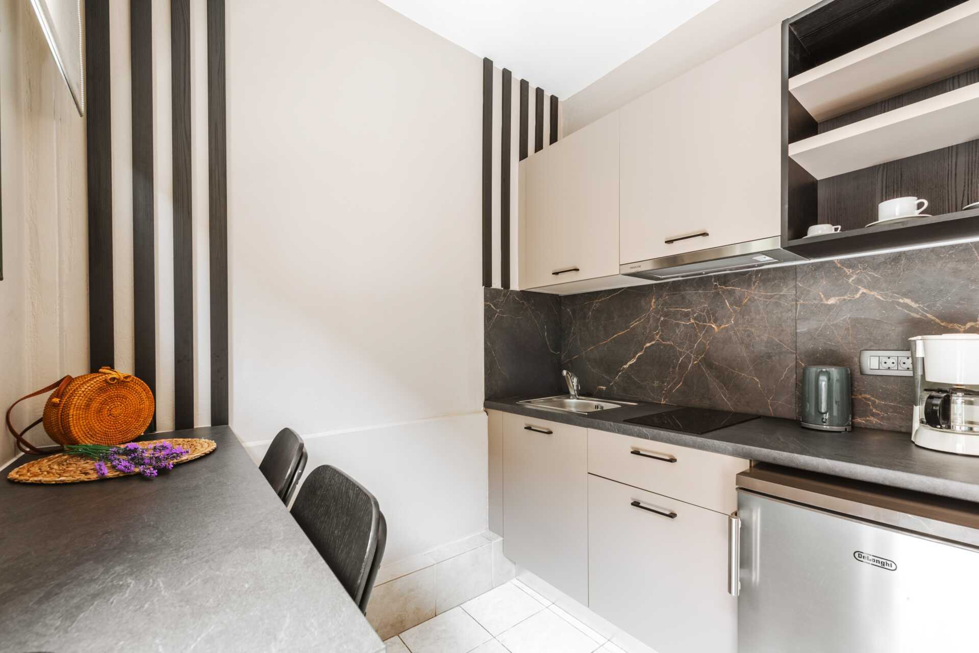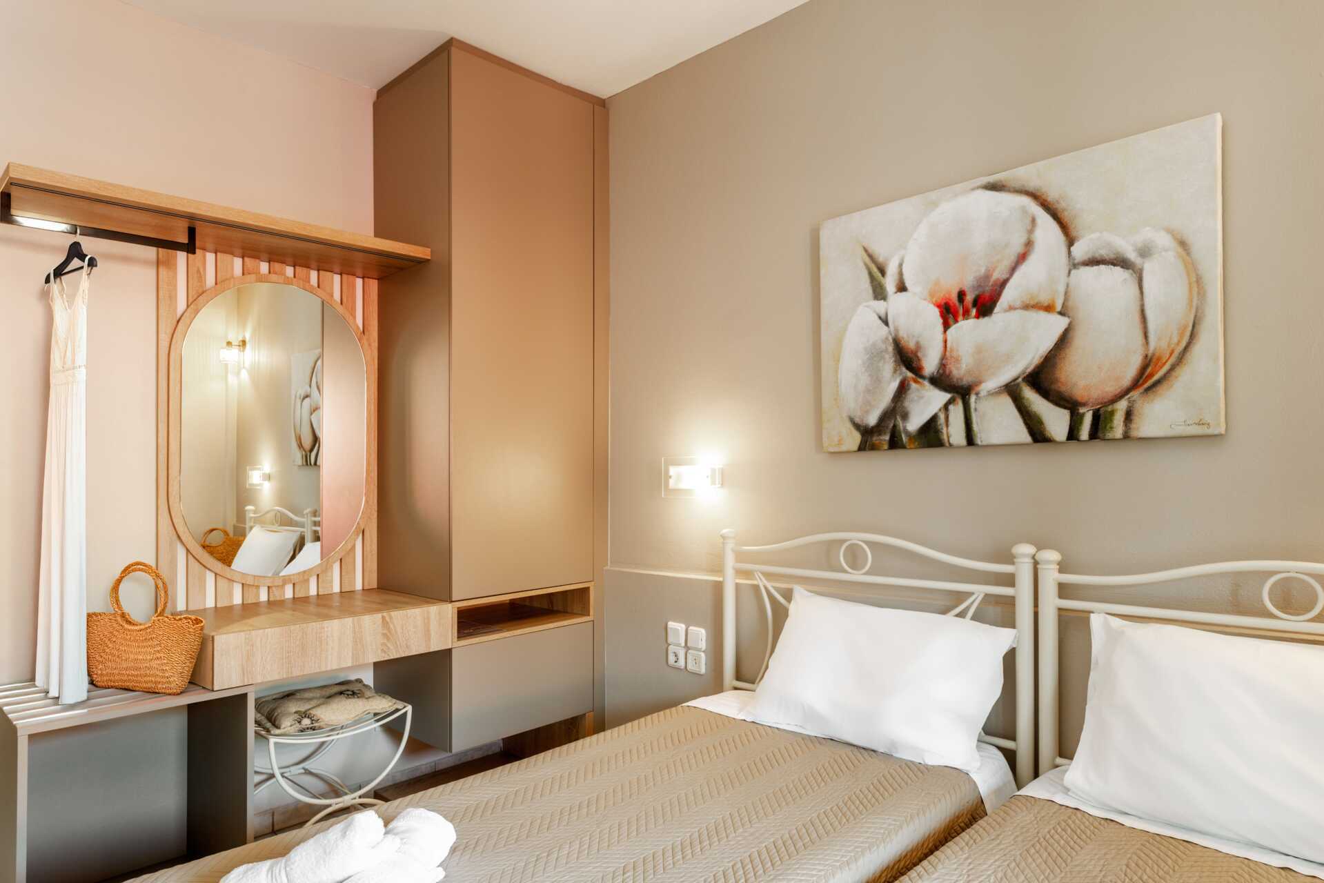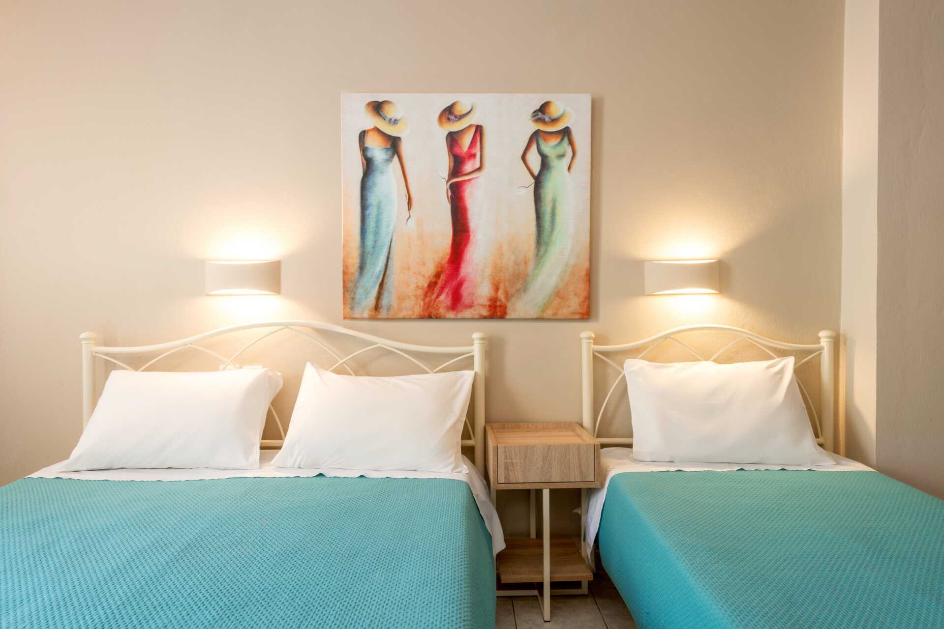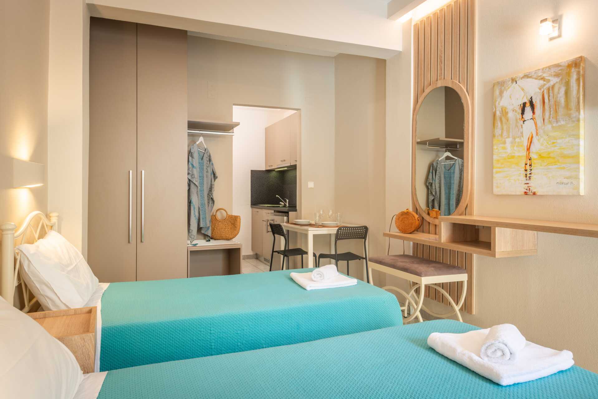Ettromsleilighet med balkong eller markterrasse. Minikjøkken. To enkeltsenger eller, i en leilighet, en mindre dobbeltseng. Minikjøkken med kokeplater, kjøleskap, vannkoker, kaffetrakter og enkelt kjøkkenutstyr. Stekeovn er tilgjengelig i noen leiligheter. Wifi inkludert. Luftkondisjonering og safe mot avgift. TV. Baderom med dusj og wc. Rengjøring 6 ggr/uke.