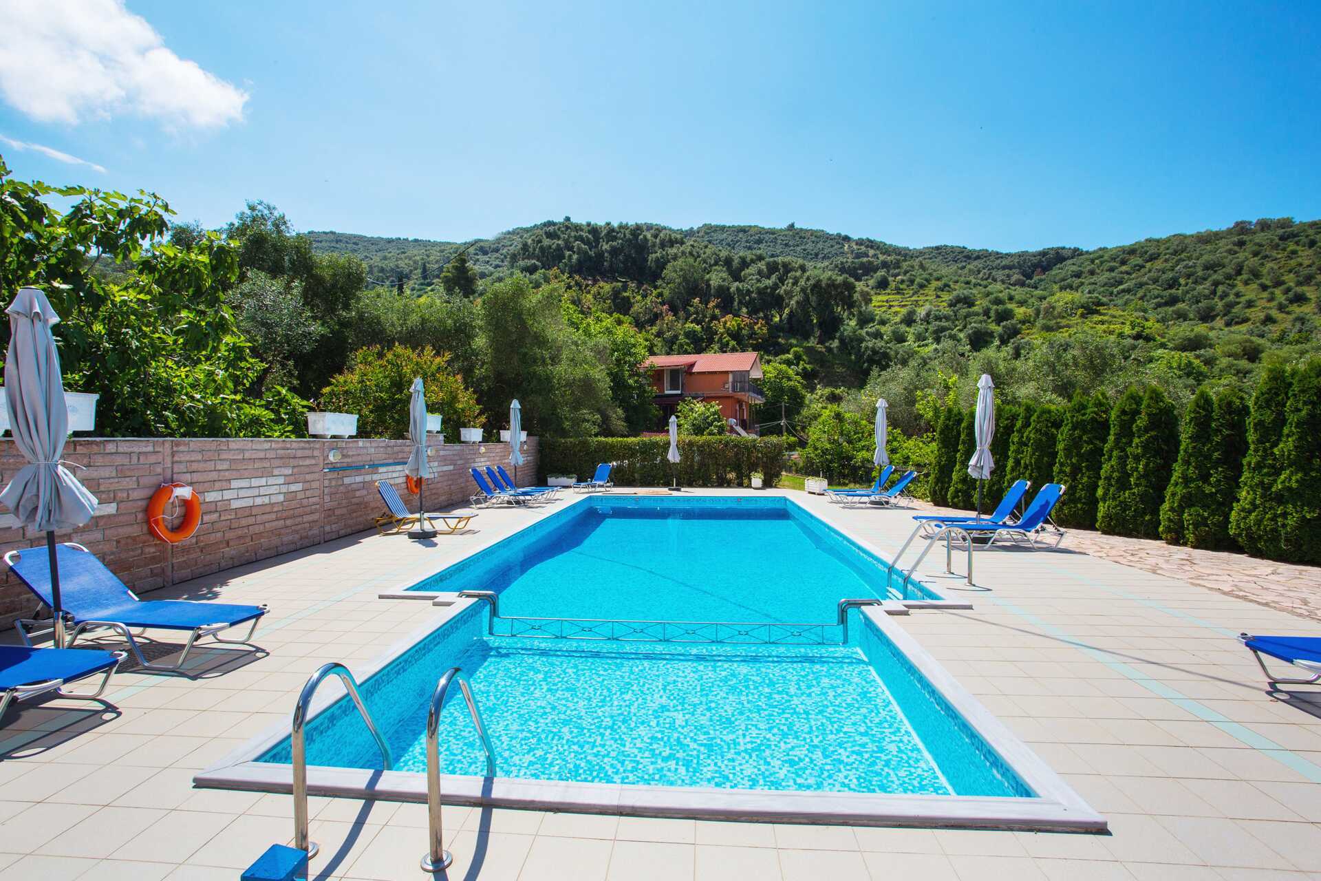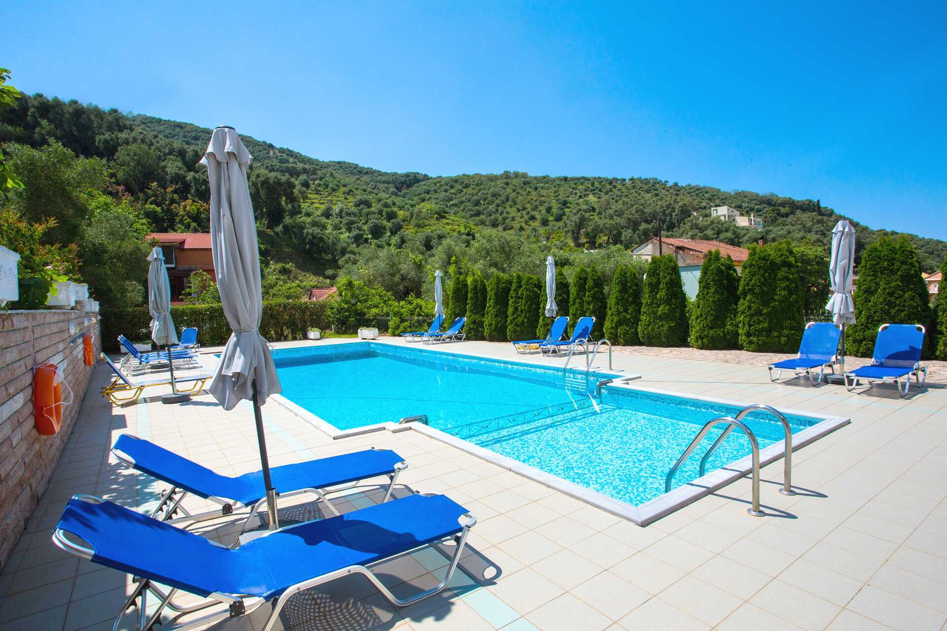 Parga Oliva har et bassengområde med svømmebasseng hvor det også er en grunnere del for barn. Solsenger og parasoller. Det er et kjøleskap for drinker ved bassengområdet.