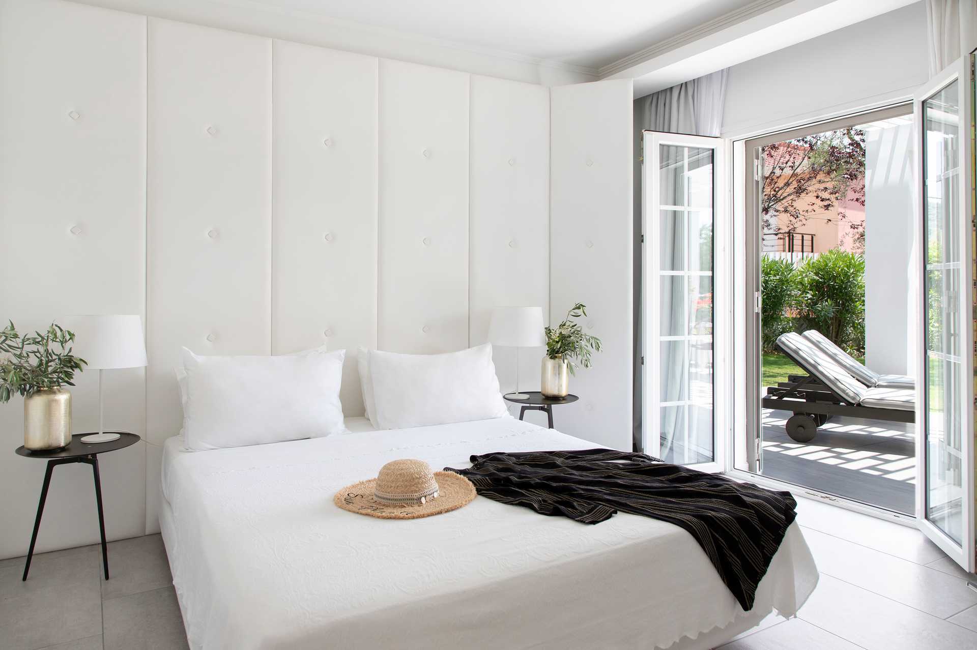 Suite med delt uteplass med solseng. Et soverom og en stue. En dobbeltseng. Mulig med ekstraseng i sovesofa. Wifi, luftkondisjonering og safe inkludert. Minibar. Kaffemaskin. TV. Badekåper og tøfler Hårføner. Dusj og wc. Rengjøring 7 ggr/uke.