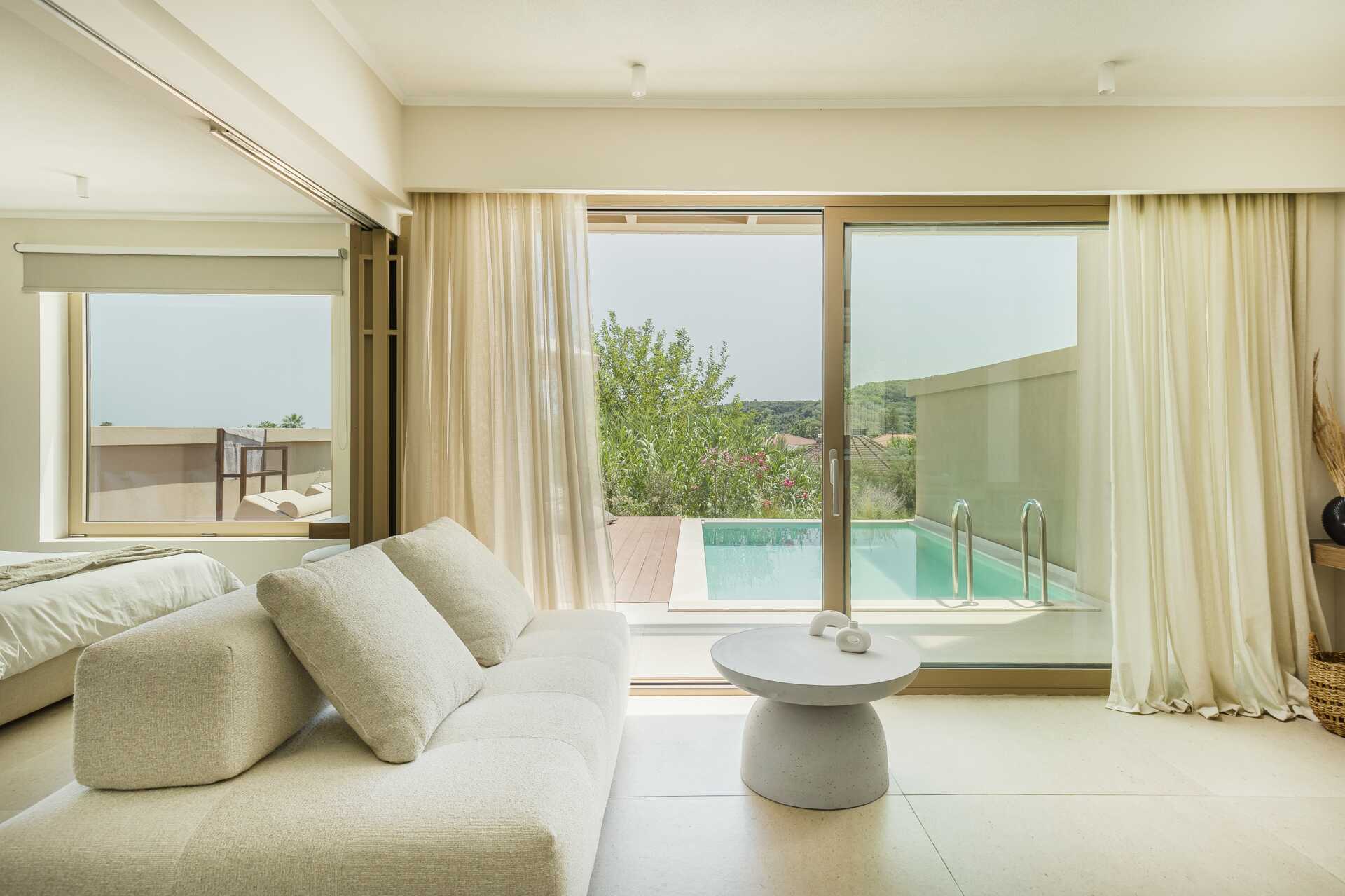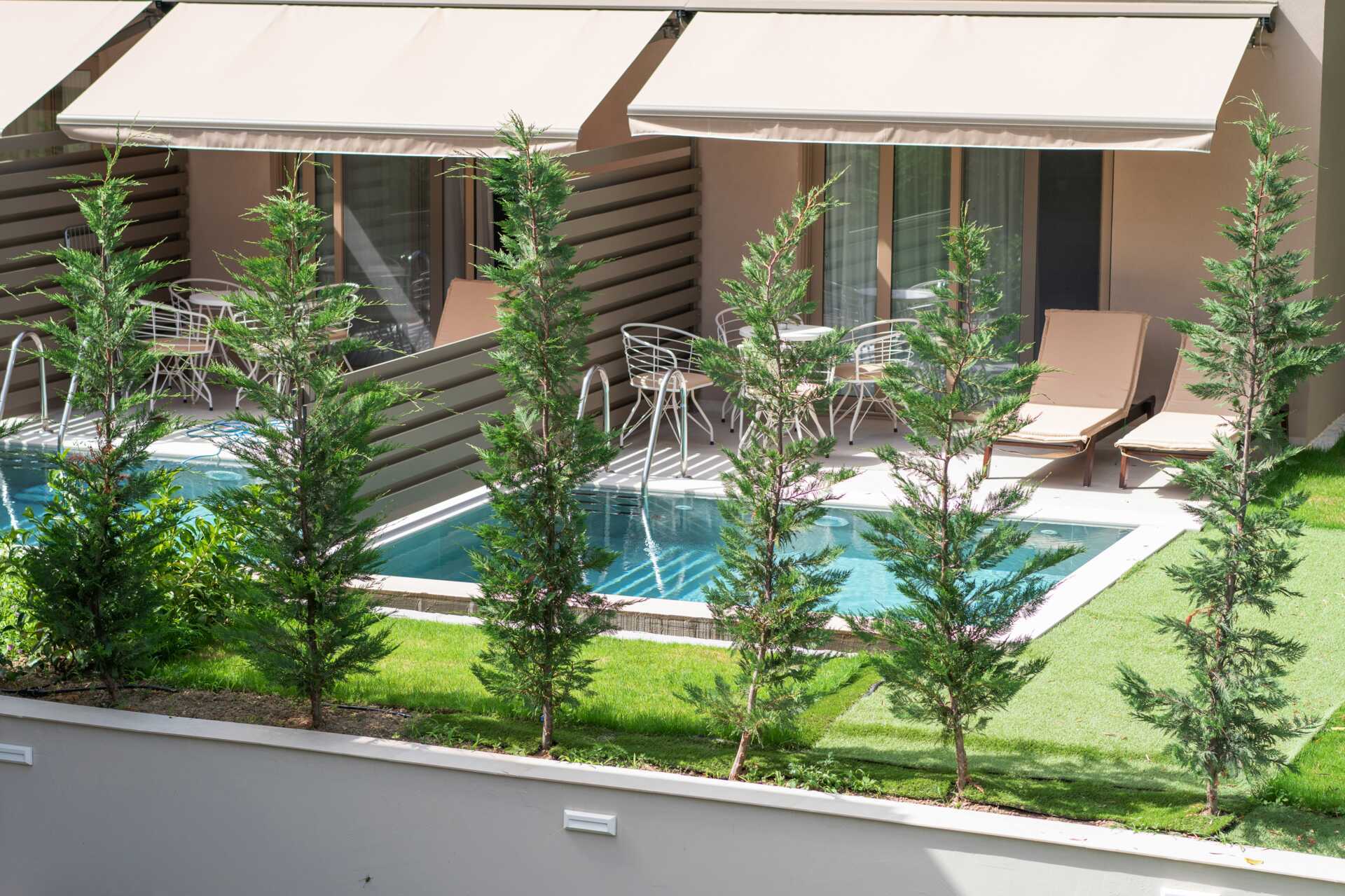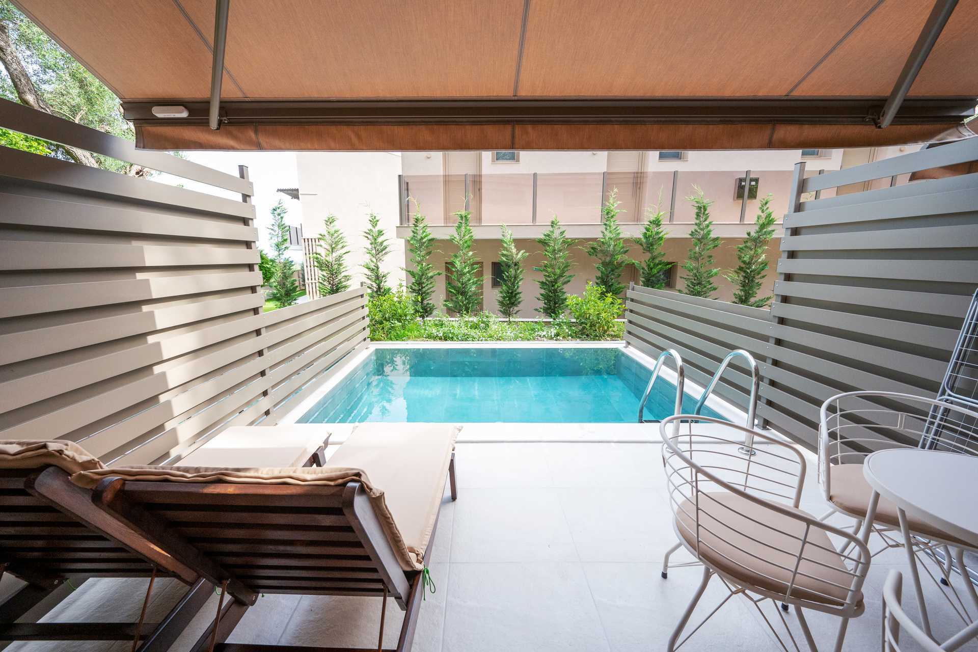 Hadde eget basseng ved rommet. Vannet var alt for kaldt.