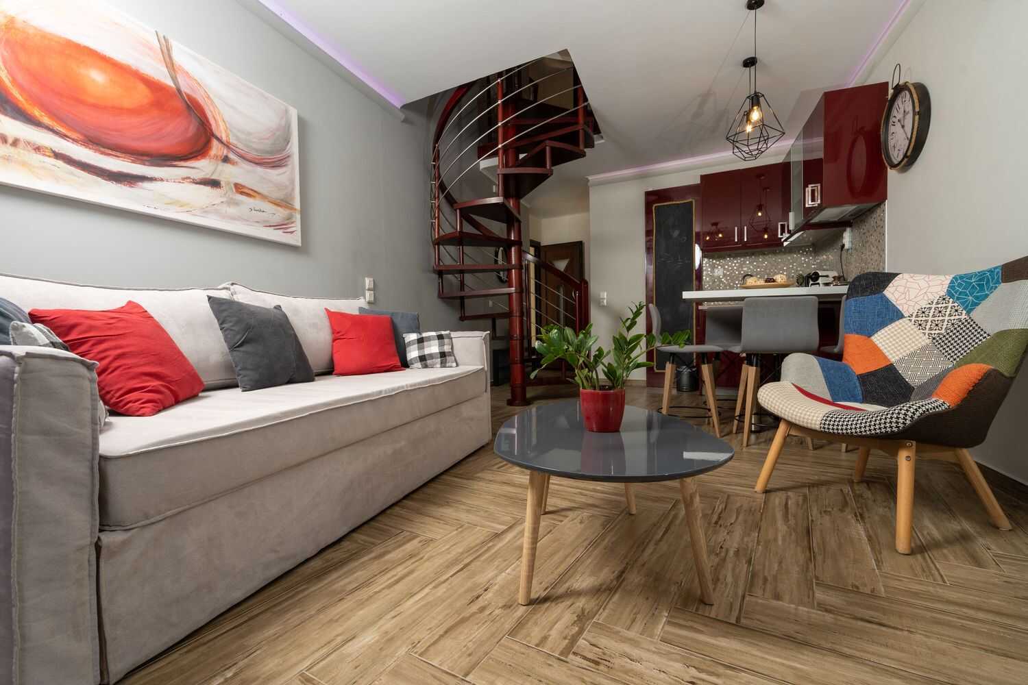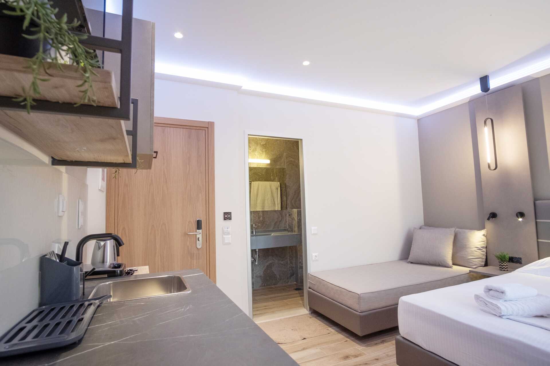 Ettromsleilighet i etasje med balkong. Nede er det en stue med minikjøkken, et bad samt mulighet for ekstrasenger i sovesofa. En trapp opp er det hems med bad og en dobbeltseng. Smal spiraltrapp mellom etasjene. Minikjøkken med kokeplater, kjøleskap, vannkoker, kaffetrakter, sandwichgrill, brødrister og enkel kjøkkenutstyr. Wifi og luftkondisjonering inkludert. TV. Hårføner. To bad med dusj og wc. Rengjøring 7 ggr/uke.