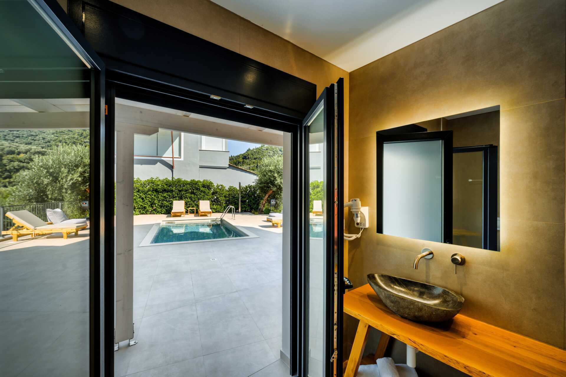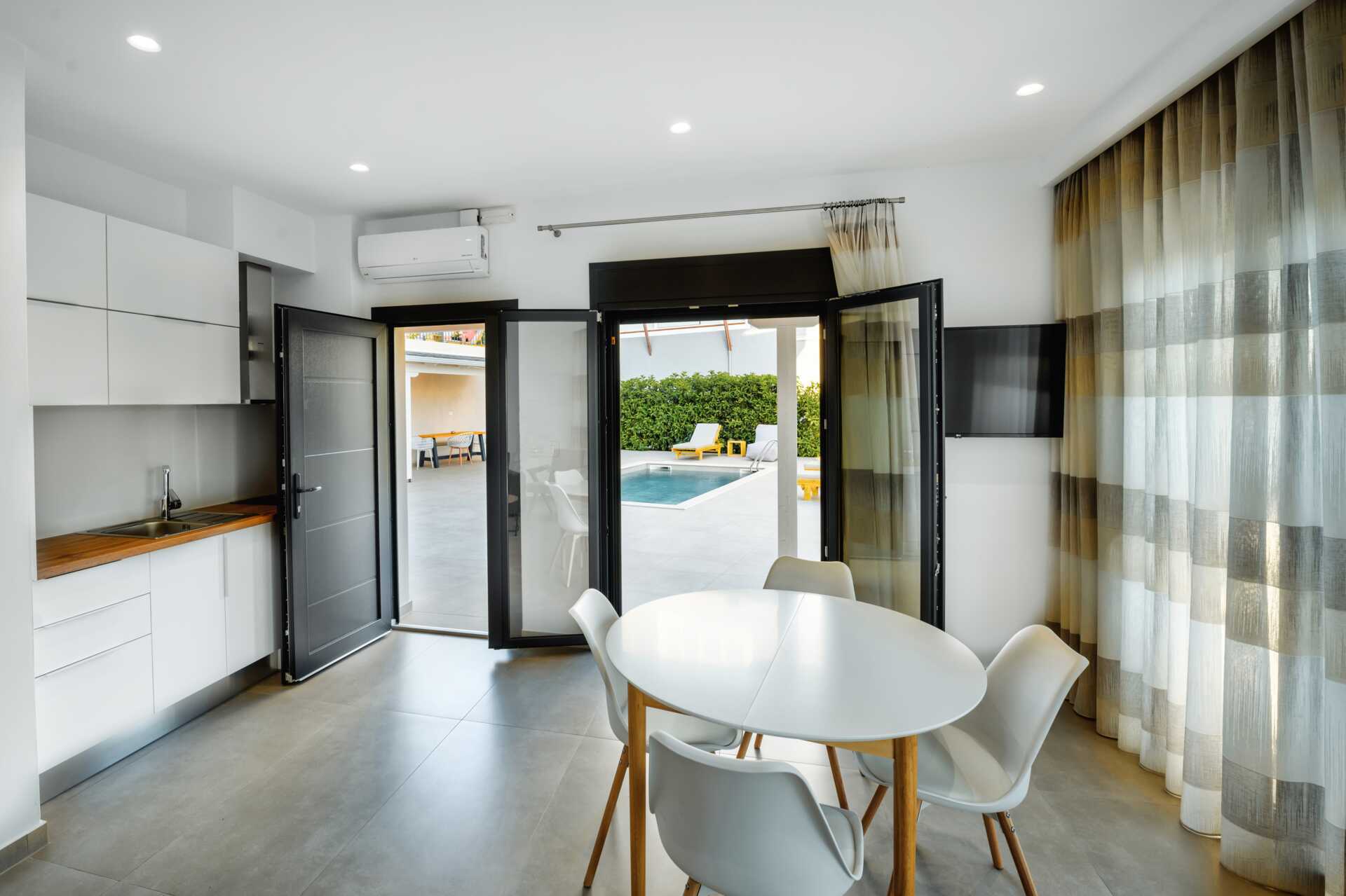 Ettromsleilighet med privat basseng på markterrassen. Rundt bassenget er det solsenger og et spisebord under tak. Bassenget har saltvann. Soverom kombinert med minikjøkken i åpen planløsning. En dobbeltseng. Mulig med en ekstraseng i sovesofa. Minikjøkken med kokeplater, stekeovn, kjøleskap, espresso kaffemaskin - kapsler inkludert og enkelt kjøkkenutstyr. Wifi, luftkondisjonering og safe inkludert. TV. Badekåper og tøfler. Hårføner. Dusj og wc. Rengjøring 6 ggr/uke.
