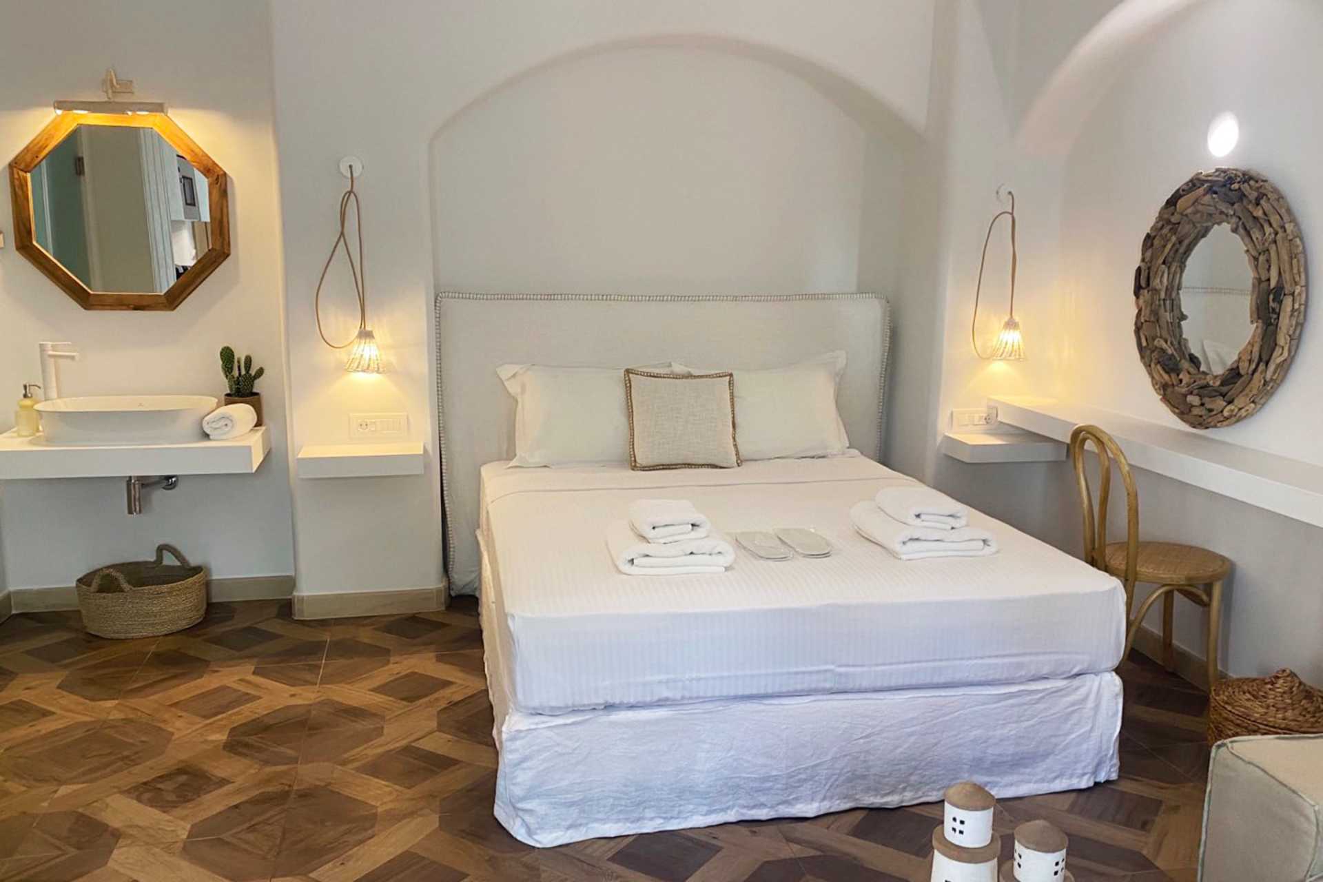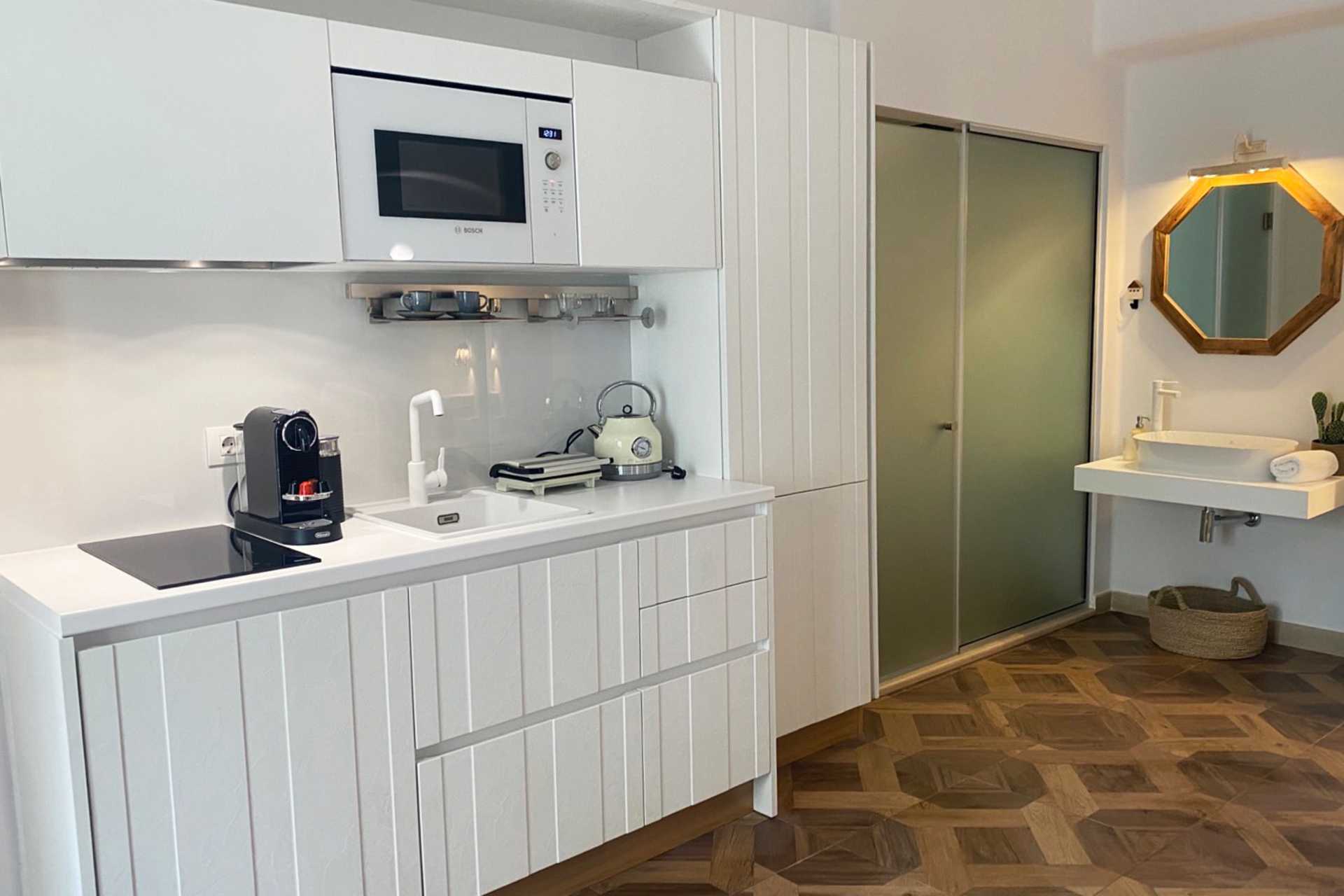 Suite med balkong eller terrasse. Kombinert soverom og minikjøkken. En dobbeltseng. Wifi, luftkondisjonering og safe inkludert. Minikjøkken med kjøleskap, vannkoker, kaffe og te, Nespresso kaffemaskin, kaffetrakter, kokeplate og mikrobølgeovn. TV. Strykejern og strykebrett. Badekåper og tøfler Hårføner. Dusj og wc. Rengjøring 5 ggr/uke.