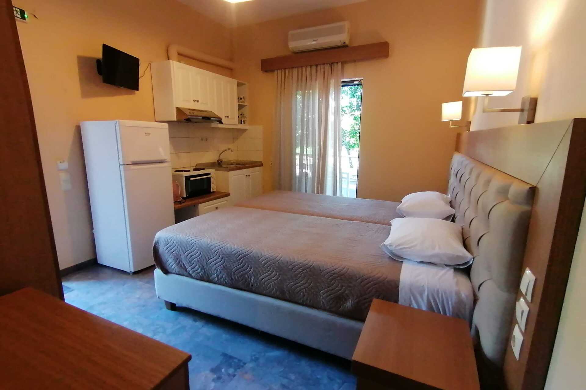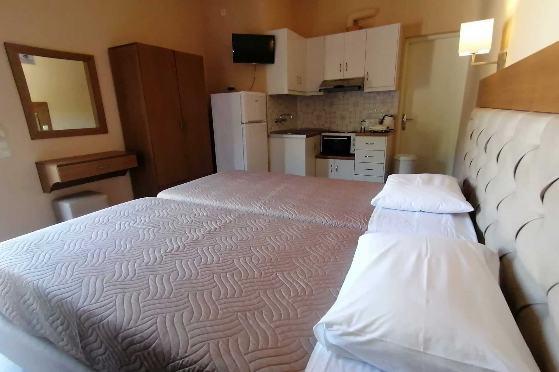 Ettromsleilighet med balkong. Minikjøkken. En dobbeltseng eller to enkeltsenger. Mulig med ekstraseng i sovesofa. Minikjøkken med kokeplater, kjøleskap med fryser, brødrister, sandwichgrill, vannkoker og enkelt kjøkkenutstyr. Wifi og safe inkludert. Luftkondisjonering mot avgift. TV. Hårføner. Dusj og wc. Rengjøring 5 ggr/uke.