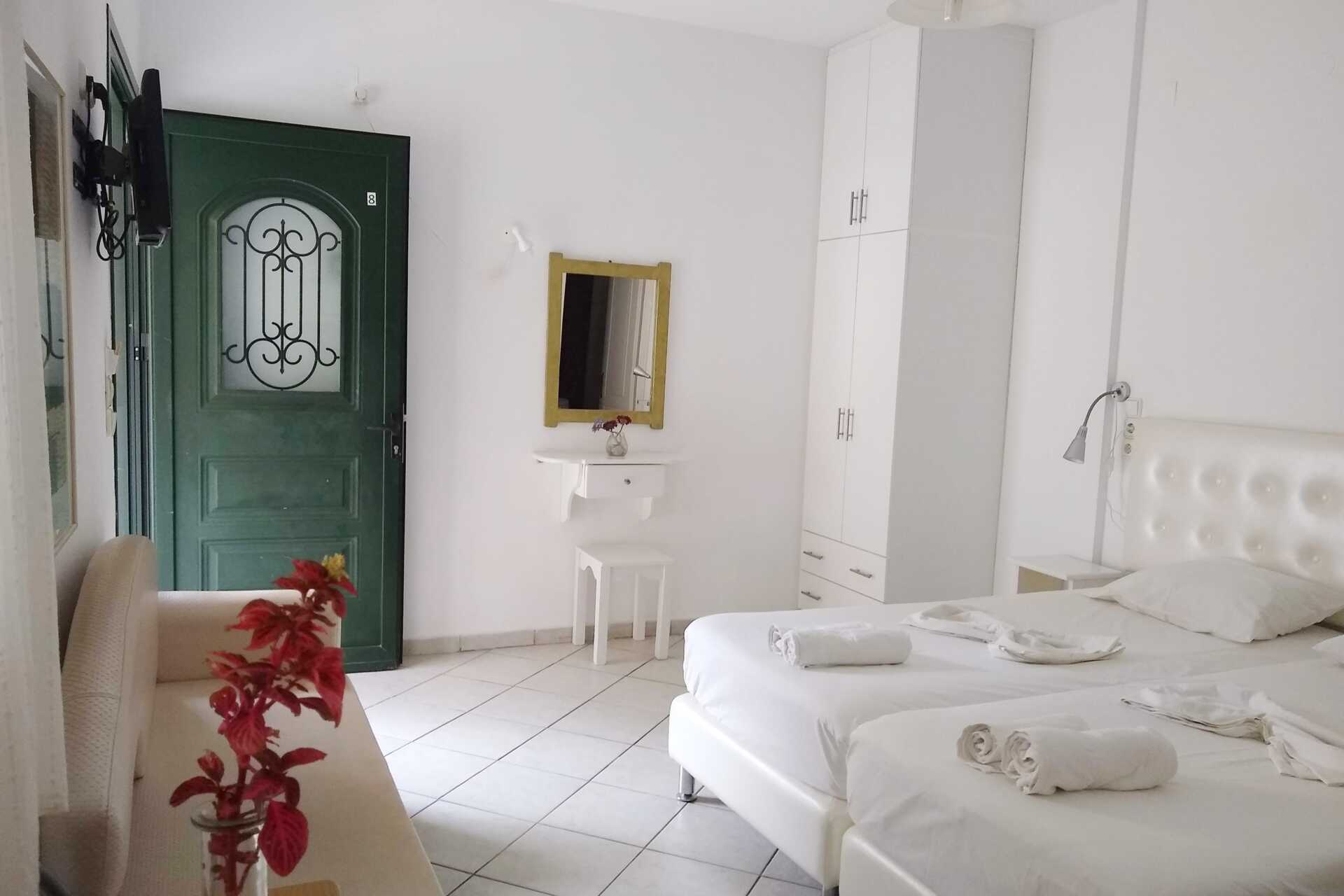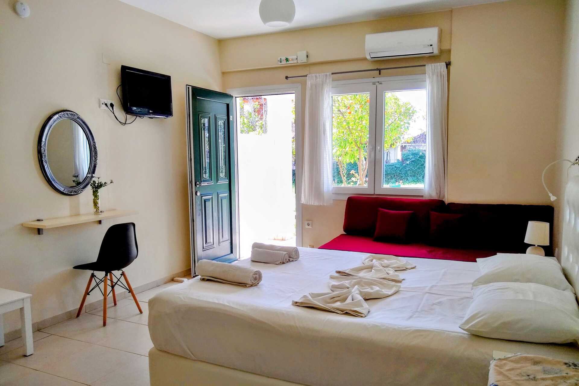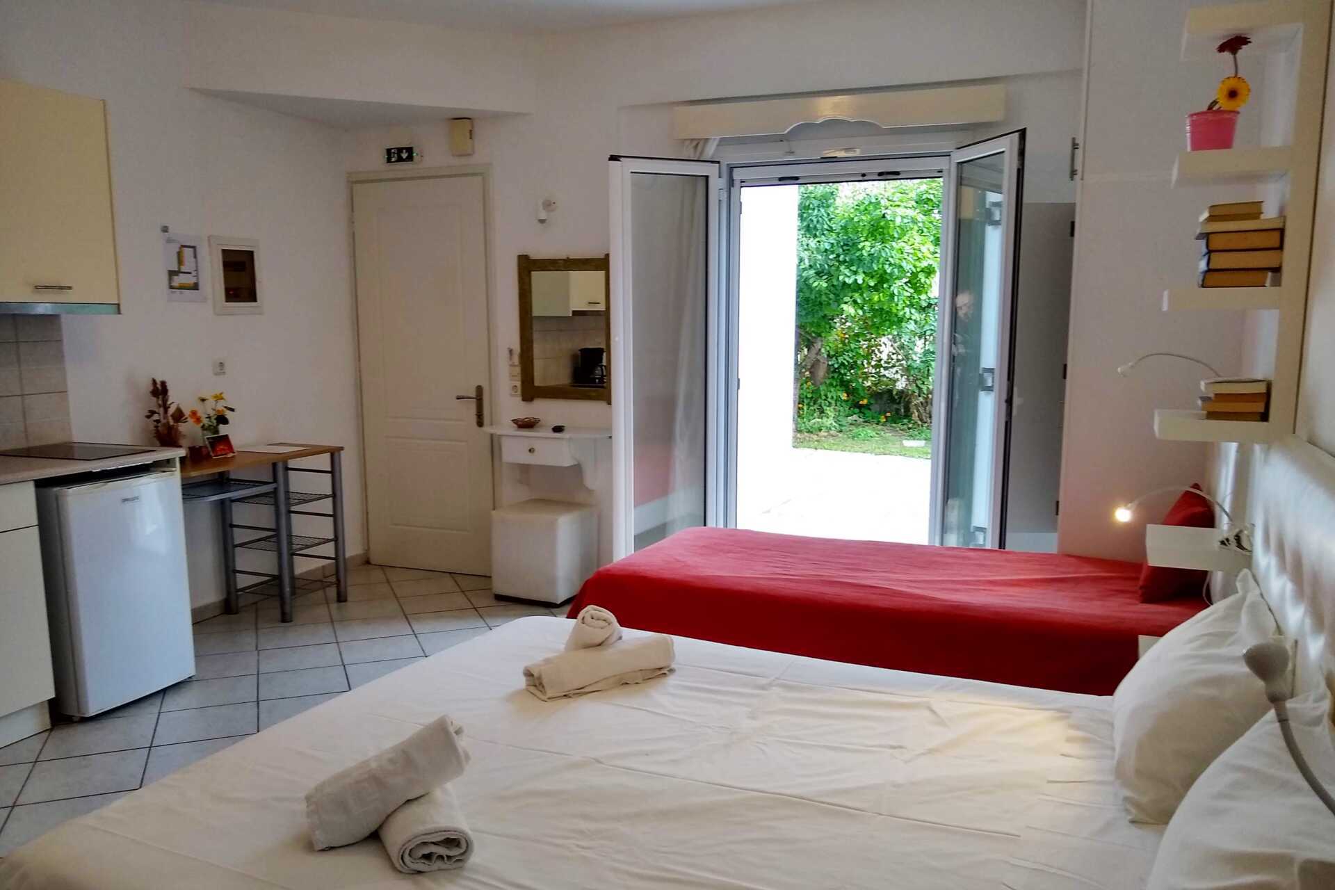 Toromsleilighet med markterrasse. Et soverom og en stue med minikjøkken. En dobbeltseng og to enkeltsenger. Minikjøkken med kokeplater, kjøleskap, brødrister og enkelt kjøkkenutstyr. Wifi inkludert. Luftkondisjonering og safe mot avgift. TV. Dusj og wc. Rengjøring 6 ggr/uke. Barn under 2 år regnes inn i maksantallet i rommet.