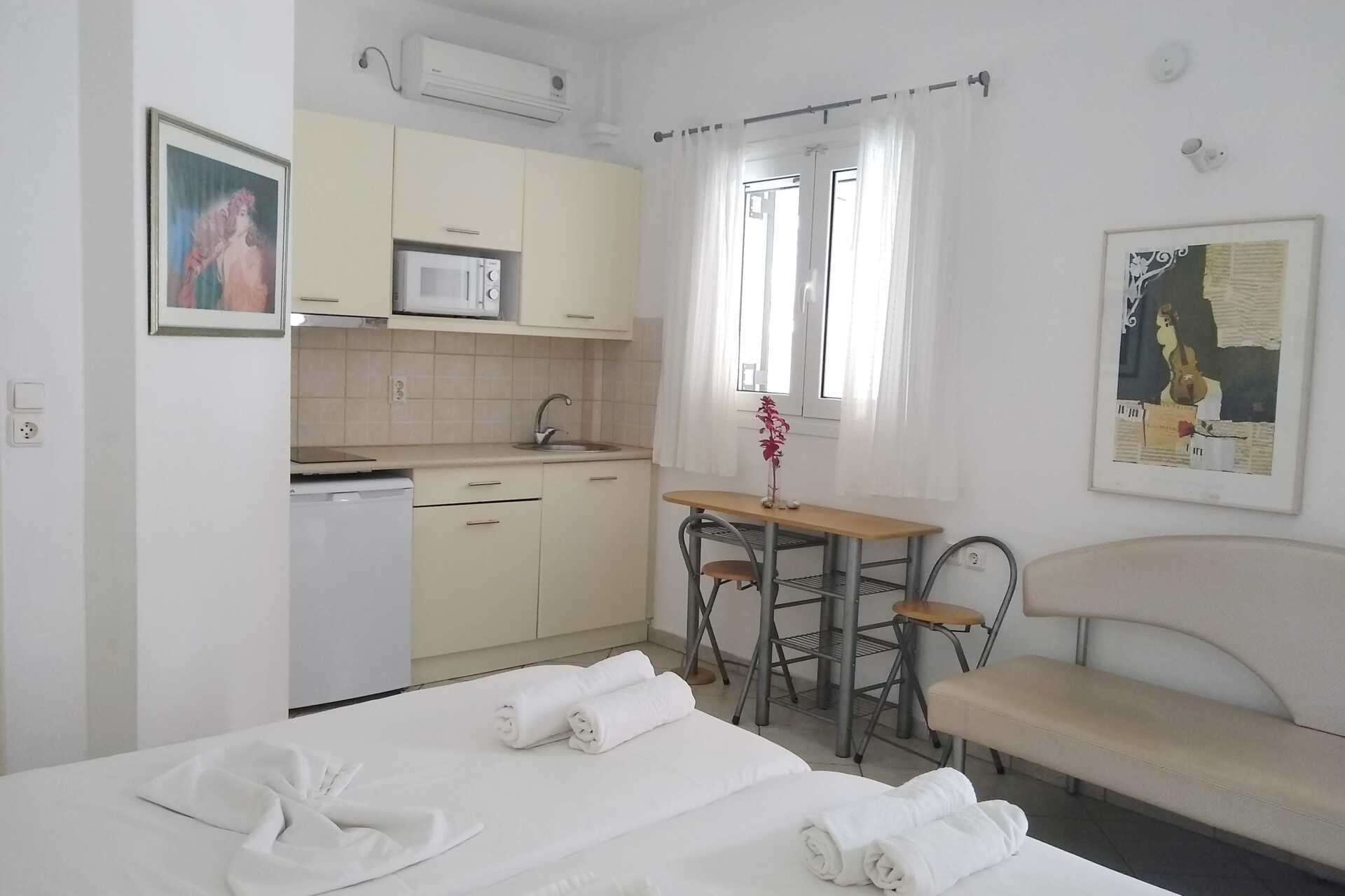 Ettromsleilighet med balkong eller markterrasse. Minikjøkken. En dobbeltseng eller to enkeltsenger. Mulig med ekstraseng i enkeltseng. Minikjøkken med kokeplater, stekeovn eller mikrobølgeovn, kjøleskap og enkel kjøkkenutstyr. Wifi inkludert. Luftkondisjonering og safe mot avgift. TV. Dusj og wc. Rengjøring 6 ggr/uke. Barn under 2 år regnes inn i maksantallet i rommet.