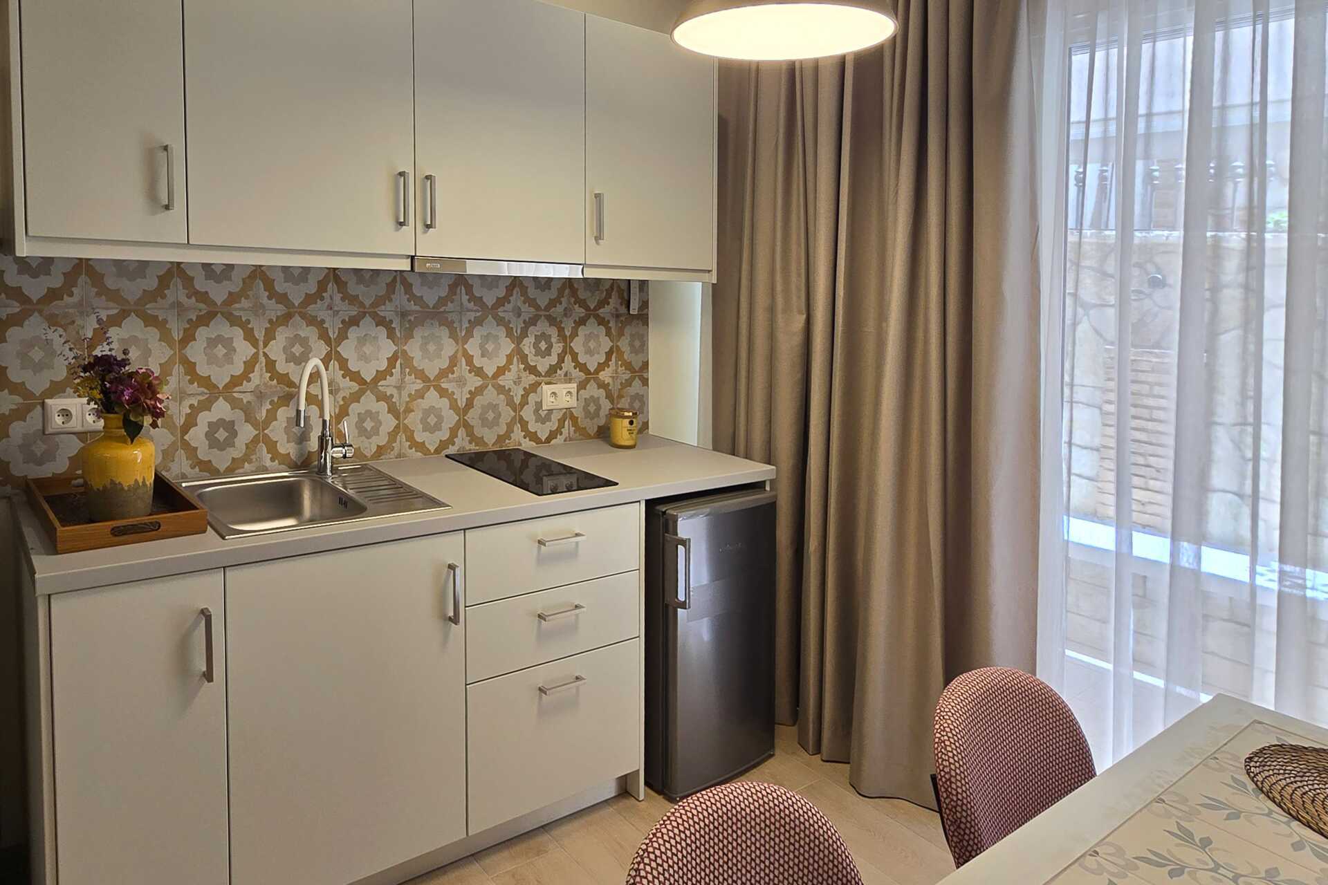 Ettromsleilighet med balkong. Soverom kombinert med minikjøkken. En dobbeltseng. I noen leiligheter er det mulighet for ekstraseng i sovesofa. Minikjøkken med kjøleskap, kokeplater, mikrobølgeovn og enkelt kjøkkenutstyr. Wifi, luftkondisjonering og safe inkludert. TV. Dusj og wc. Rengjøring 6 ggr/uke.