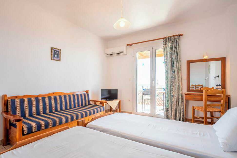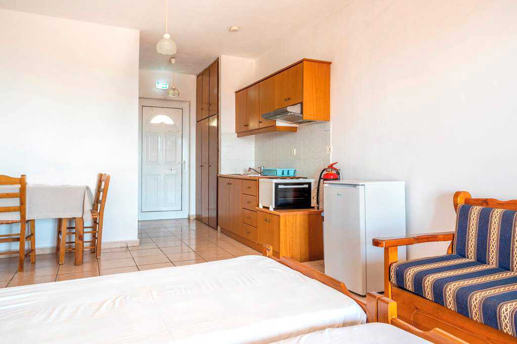 Ettromsleilighet med balkong eller terrasse. Stue med minikjøkken. To enkeltsenger. Minikjøkken med kokeplater, kjøleskap, vannkoker, kaffetrakter, brødrister og enkelt kjøkkenutstyr. Wifi og luftkondisjonering inkludert. Baderom med dusj og wc. Rengjøring 5 ggr/uke.