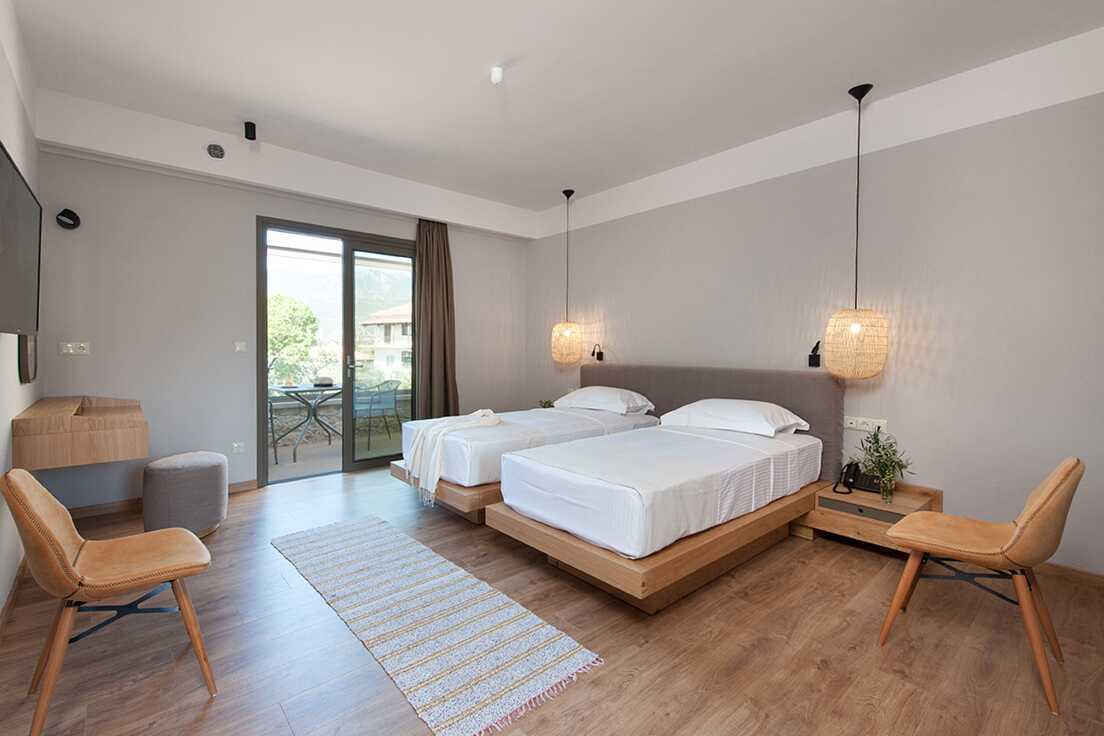 Dobbeltrom med balkong eller terrasse. En dobbeltseng eller to enkeltsenger. Mulig med en ekstraseng i sovesofa. Luftkondisjonering, safe og wifi inkludert. Kjøleskap. Vannkoker samt kaffe og te. TV. Hårføner. Badekåper og tøfler. Bad med dusj og wc. Rengjøring 7 ggr/uke.