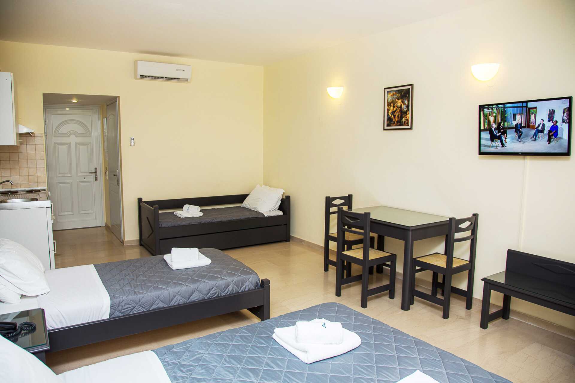 Dobbeltrom med balkong. En dobbeltseng eller to enkeltsenger. Mulig med ekstraseng i enkeltseng eller i sovesofa. Kjøleskap. Vannkoker. TV. Hårføner. Dusj og wc. Rengjøring 6 ggr/uke.