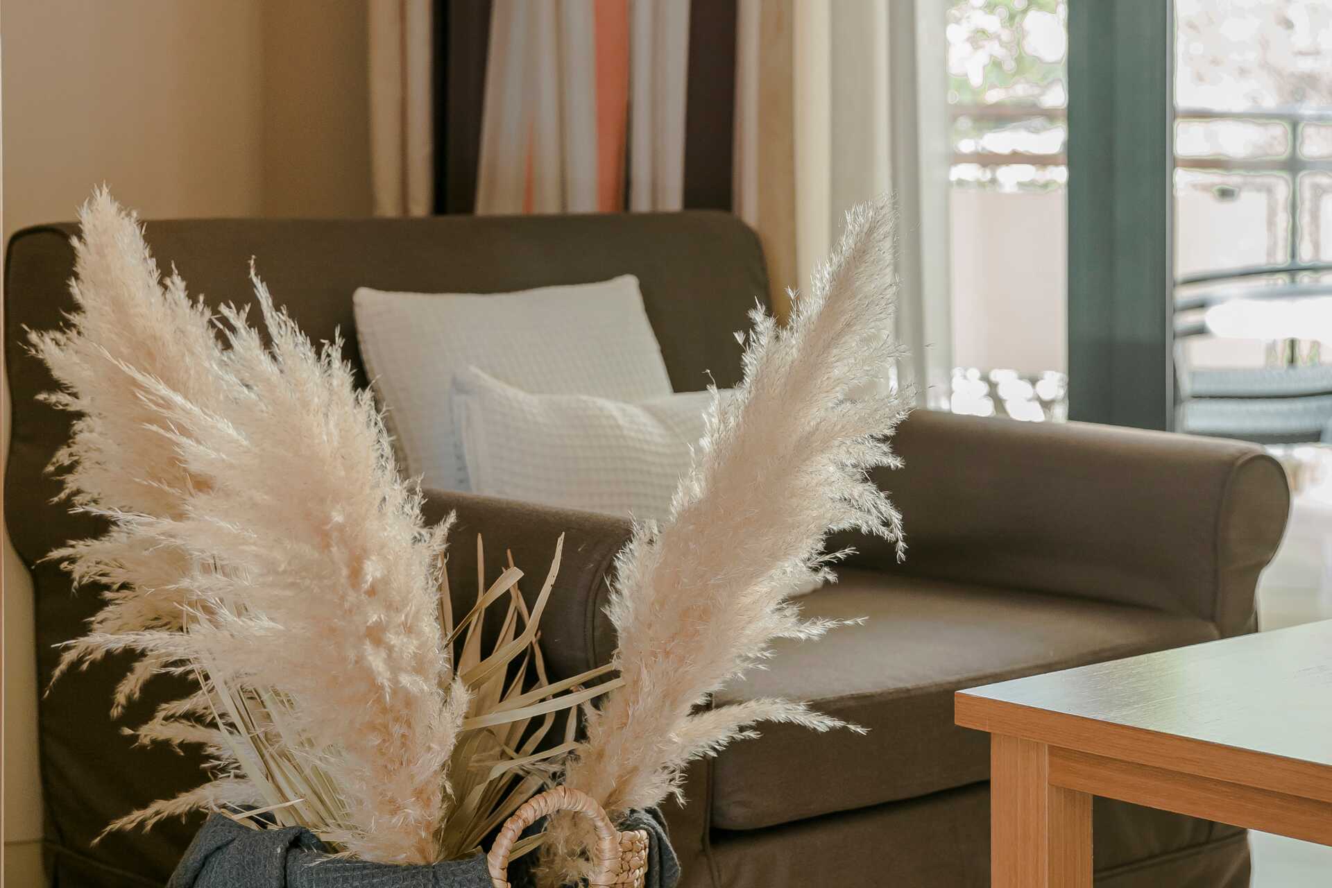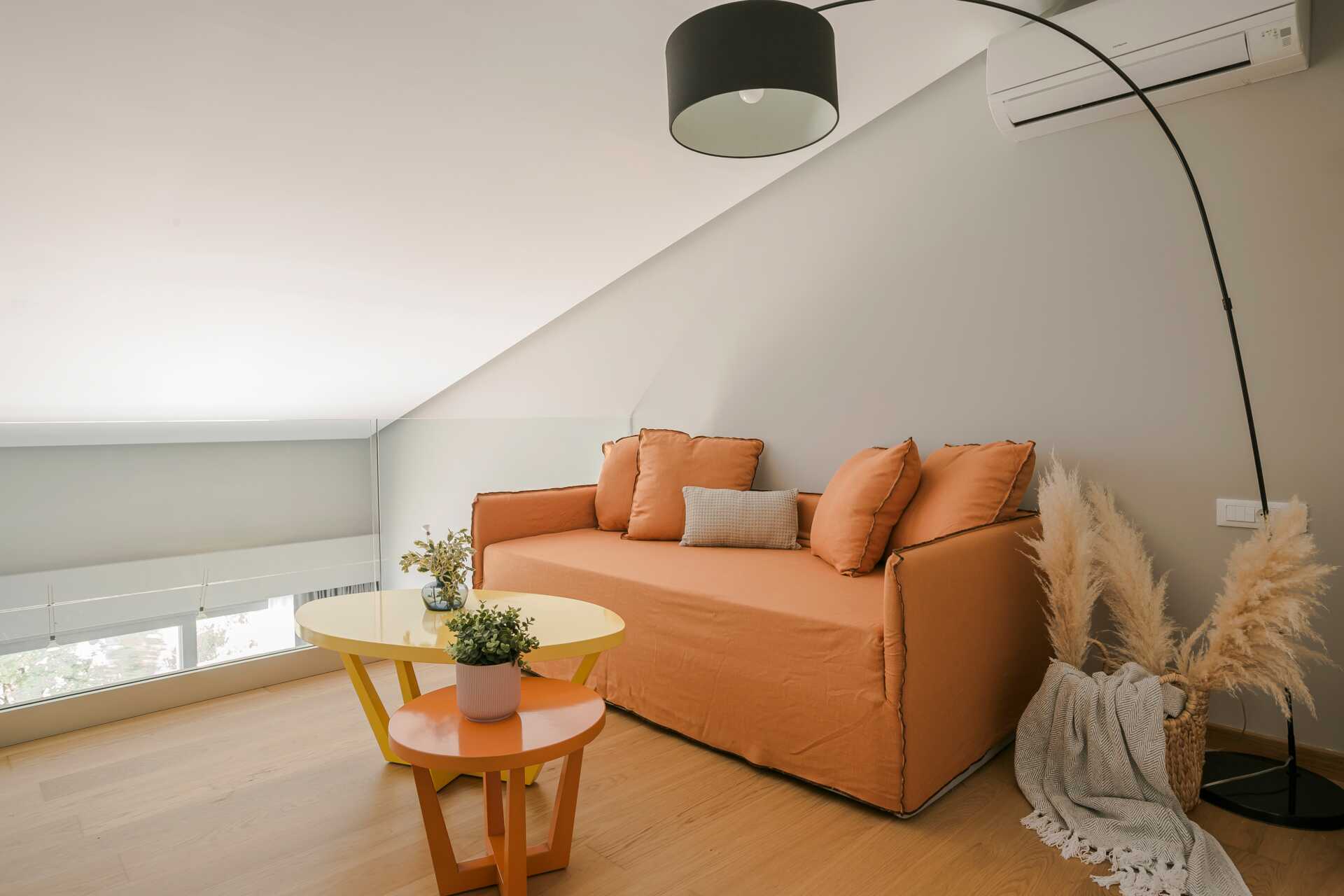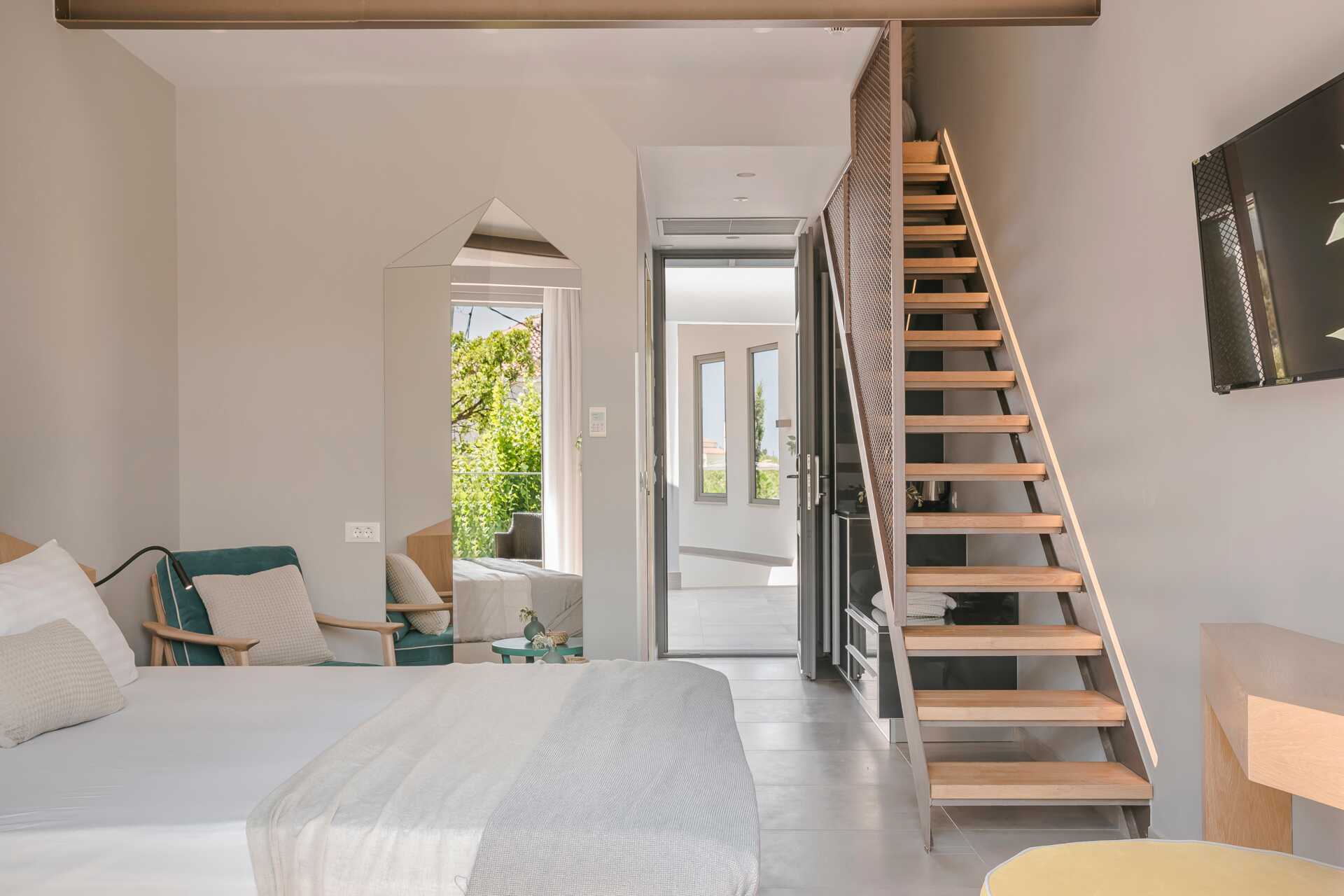 Familierom i etasje med balkong. Dobbeltseng i entréplan og trapp opp til hems med mulighet for ekstrasenger i sovesofa. Wifi, luftkondisjonering og safe. Kjøleskap. Vannkoker samt kaffe og te. TV. Badekåper og tøfler. Hårføner. Dusj og wc. Rengjøring 7 ggr/uke. Barn under 2 år regnes inn i maksantallet i rommet.