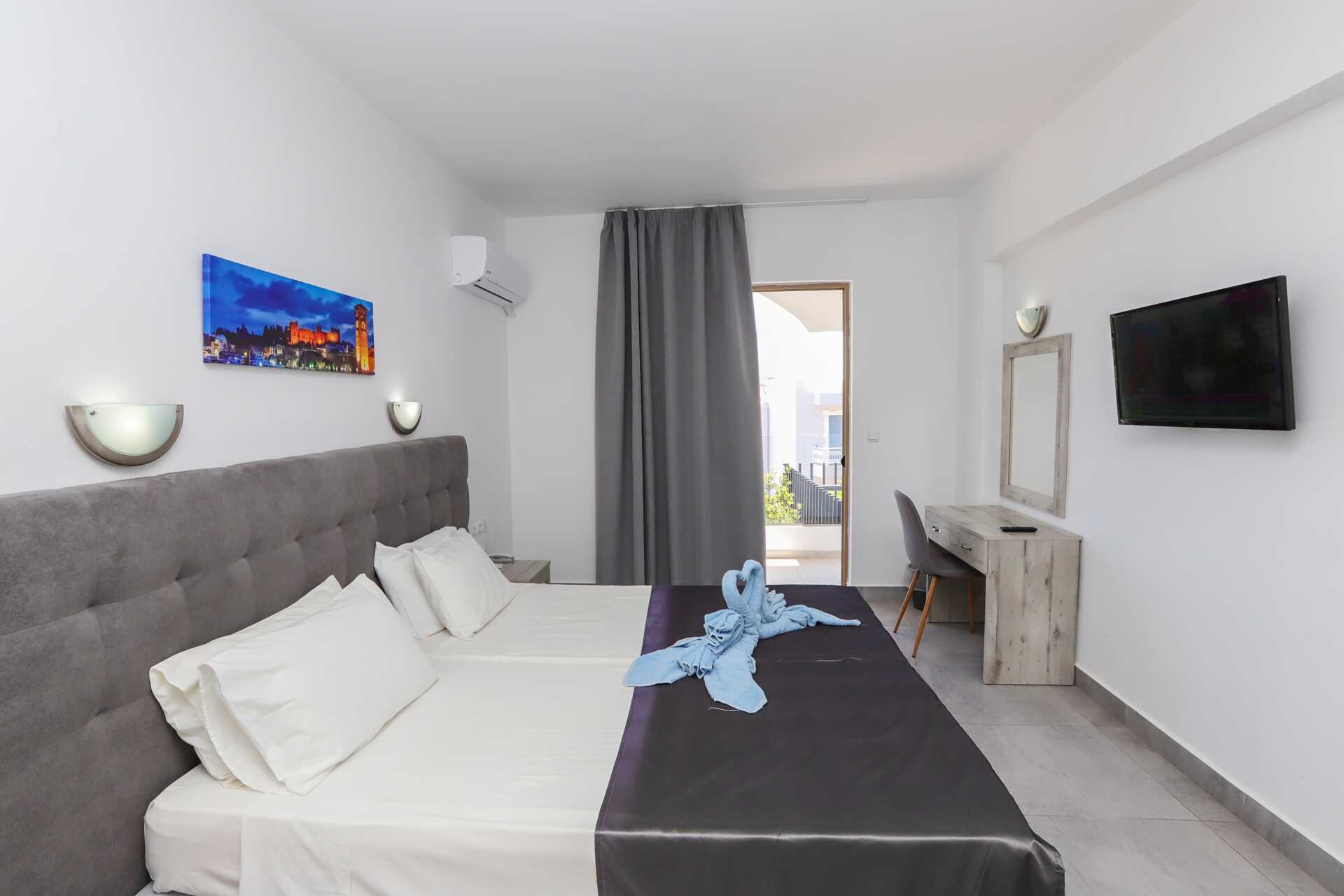 Dobbeltrom med balkong eller terrasse. En dobbeltseng eller to enkeltsenger. Mulig med en ekstraseng i sovesofa. Wifi, luftkondisjonering og safe inkludert. Kjøleskap og vannkoker. TV. Hårføner. Dusj og wc. Rengjøring 6 ggr/uke.