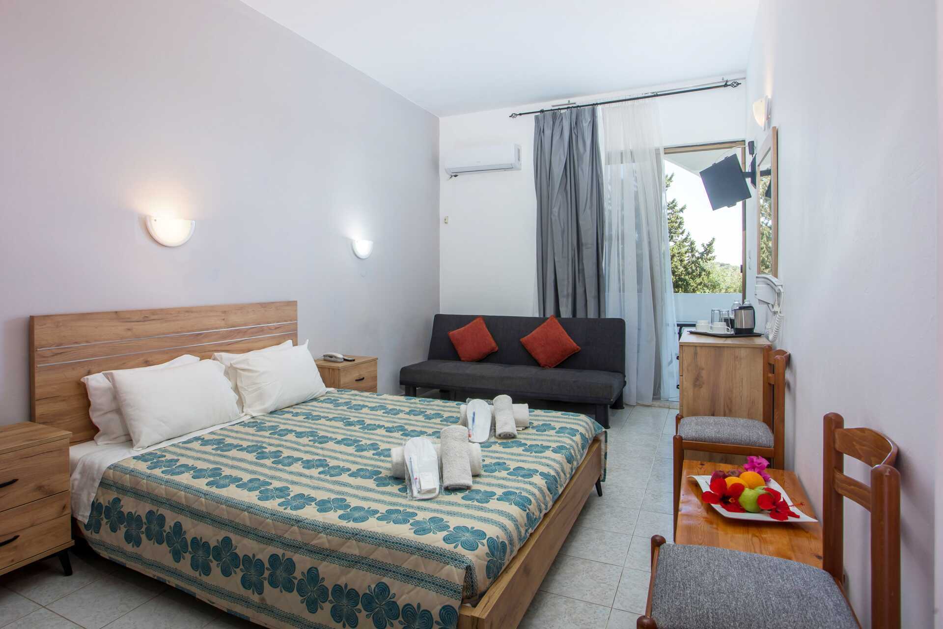 Familierom med balkong eller terrasse. En dobbeltseng eller to enkeltsenger. Mulig med en ekstrasenger i en køyeseng. Wifi, luftkondisjonering og safe inkludert. Kjøleskap og vannkoker. TV. Hårføner. Dusj og wc. Rengjøring 6 ggr/uke.