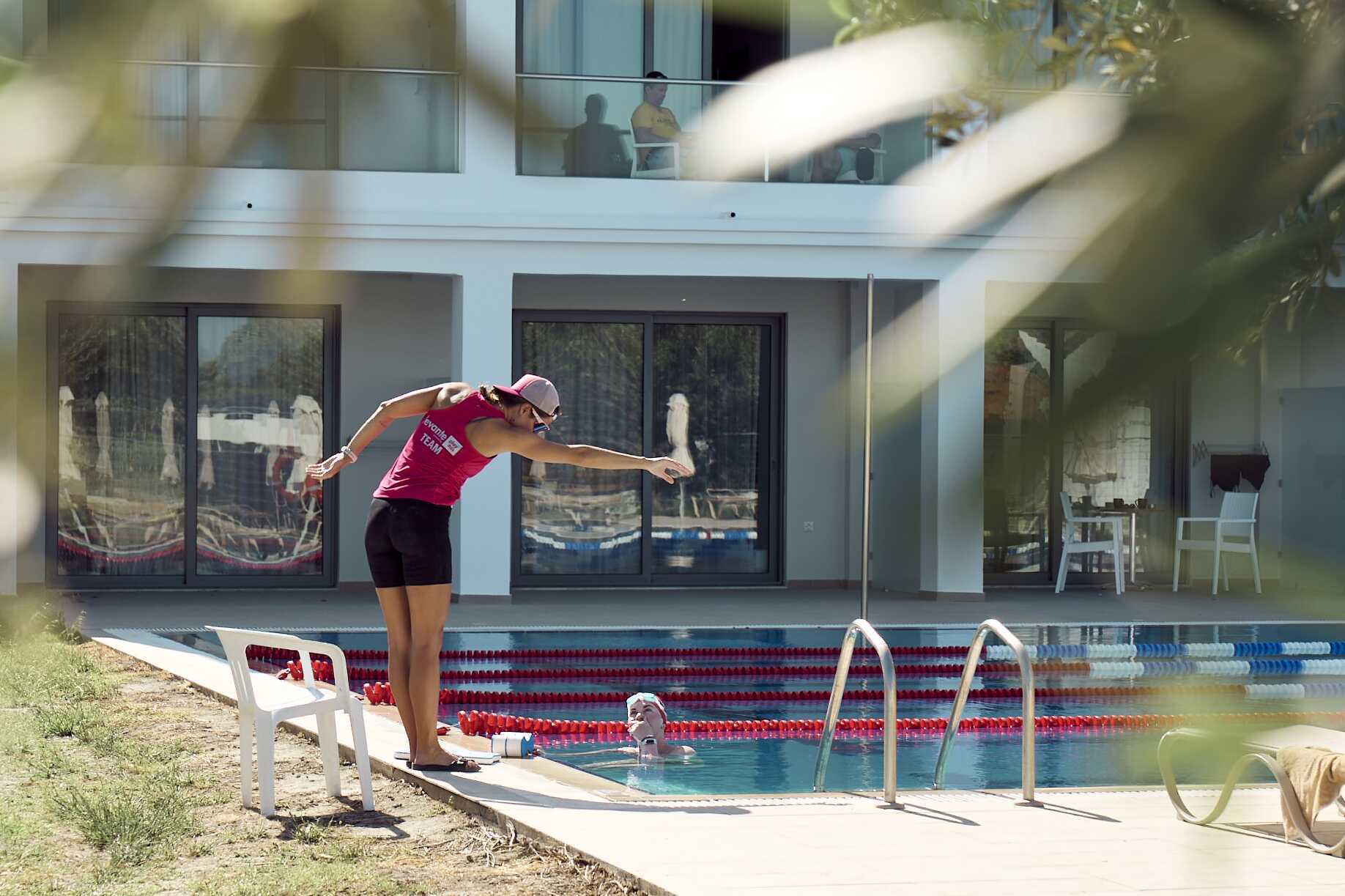 La barna lære å svømme i ferien! Det er lettere å slappe av og lære når solen skinner og vannet er varmere. Under trygg veiledning av utdannede, profesjonelle og skandinavisktalende svømmelærere lærer barna å svømme, og å øve litt hver dag gir som regel et godt resultat.
