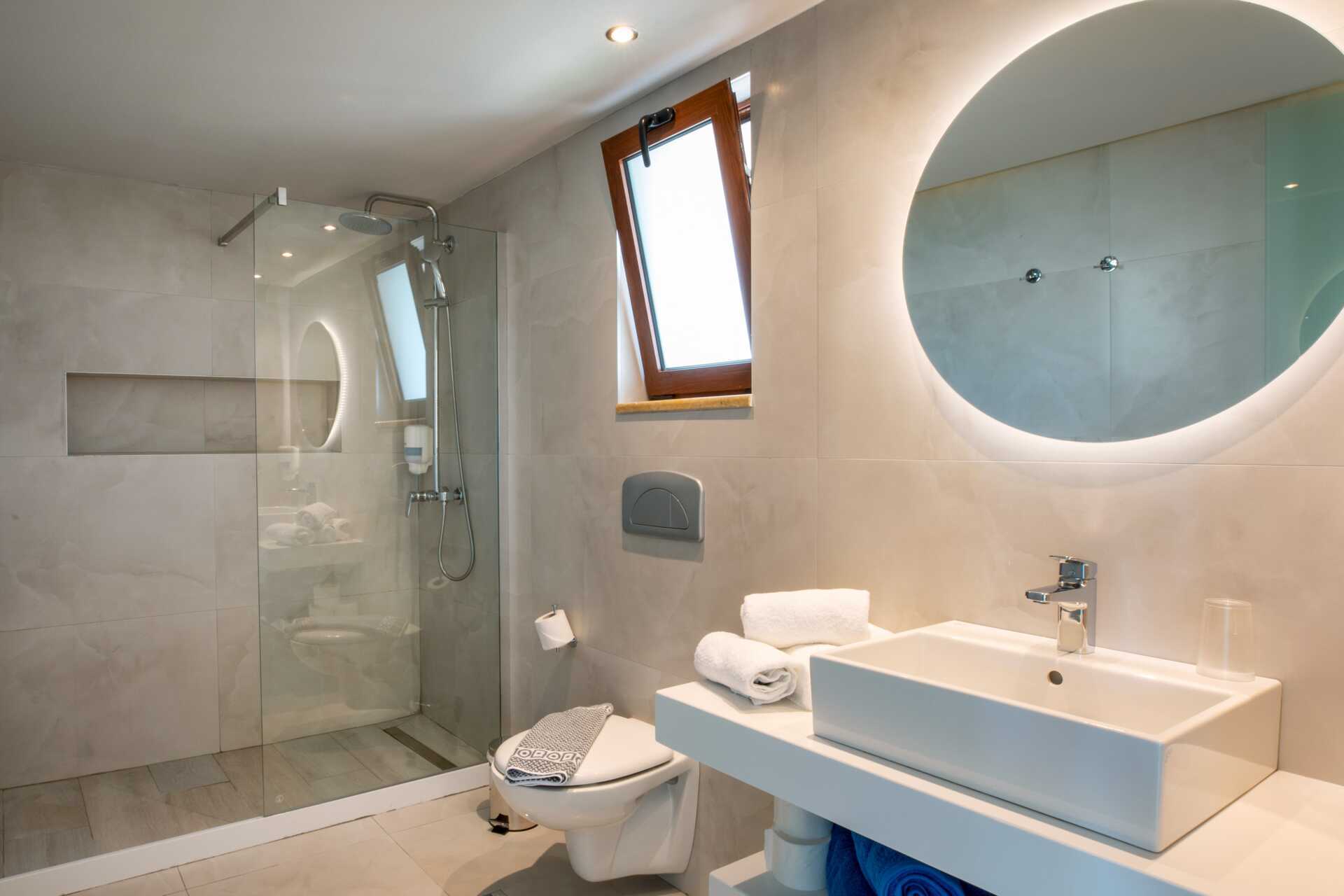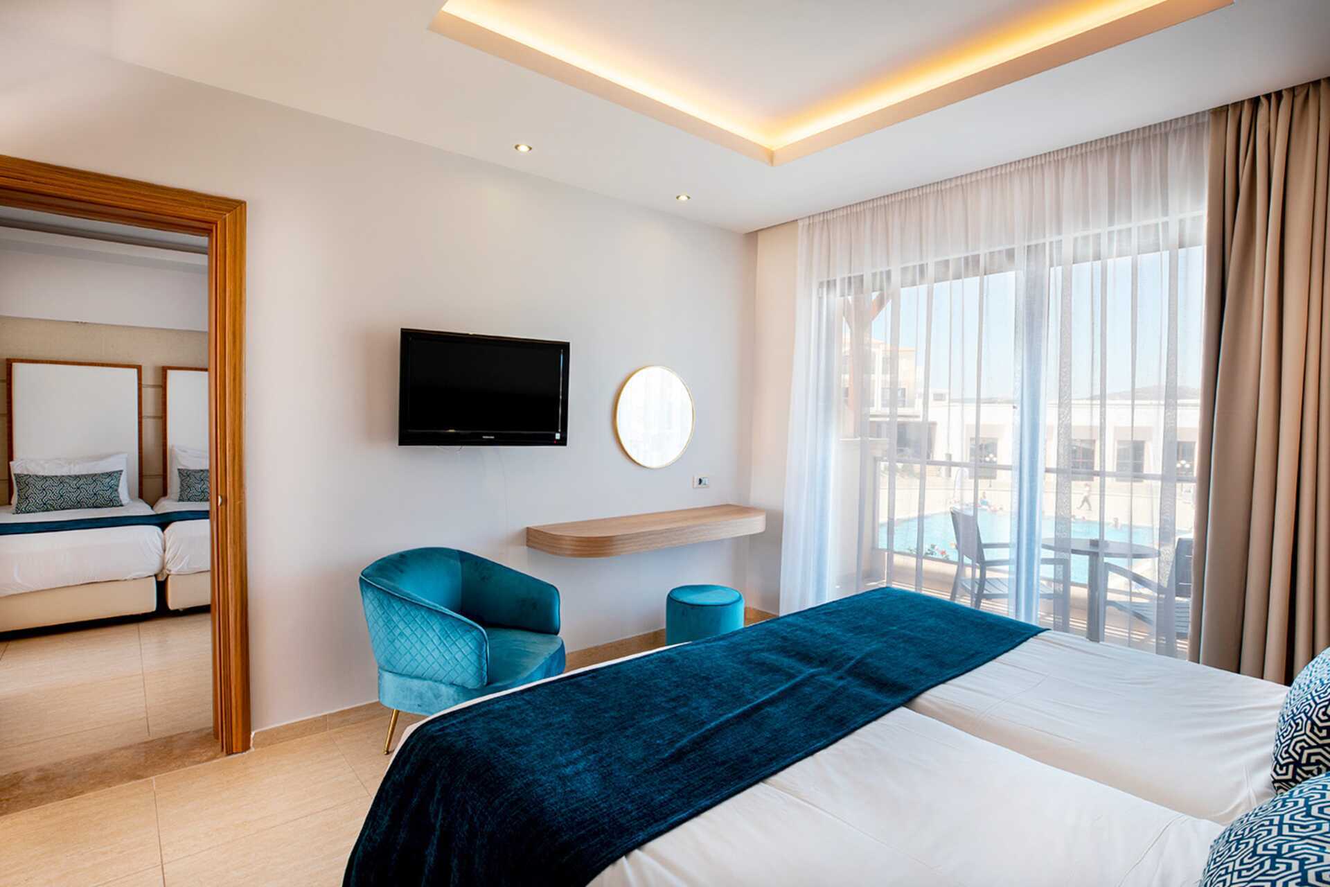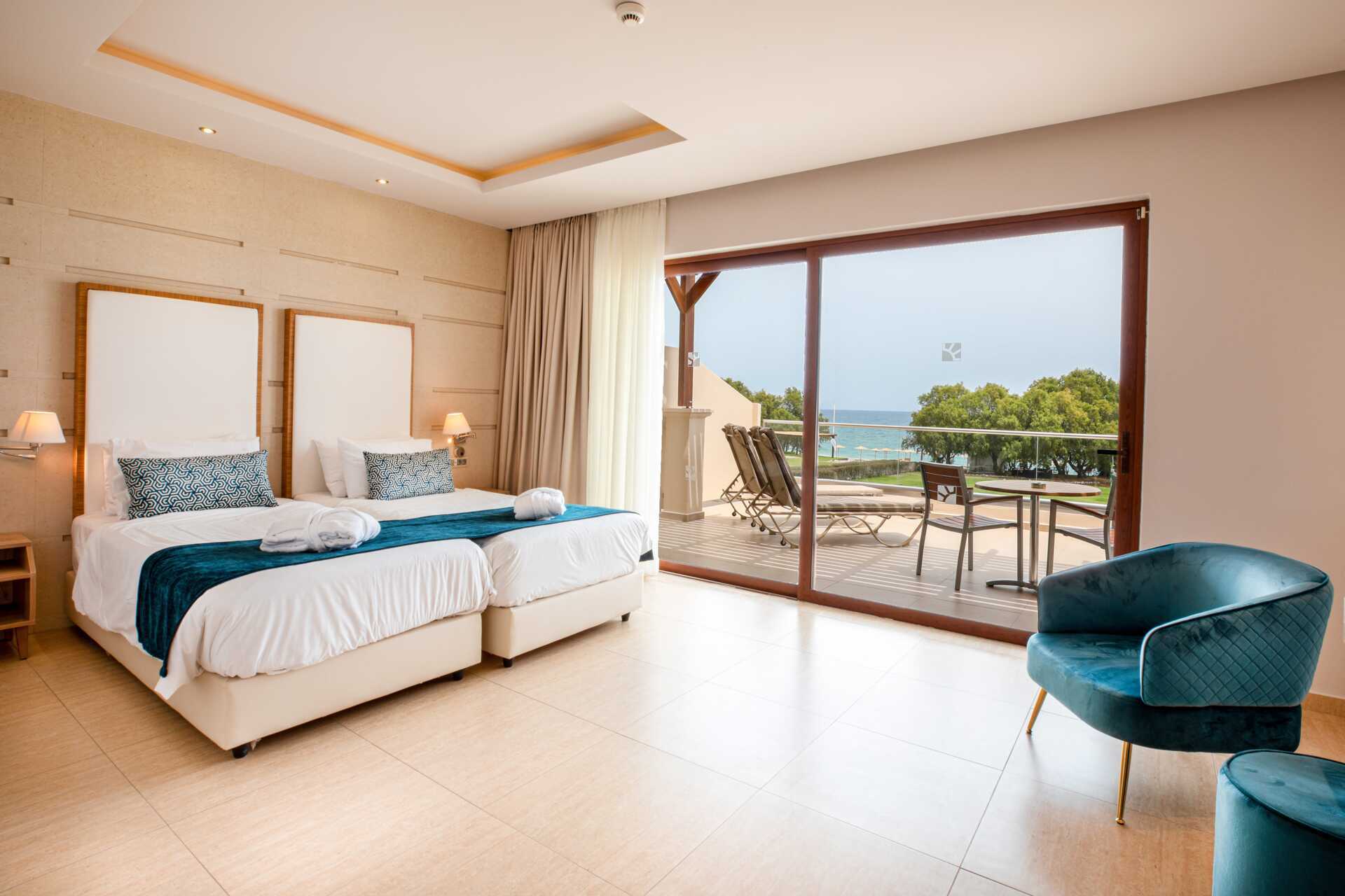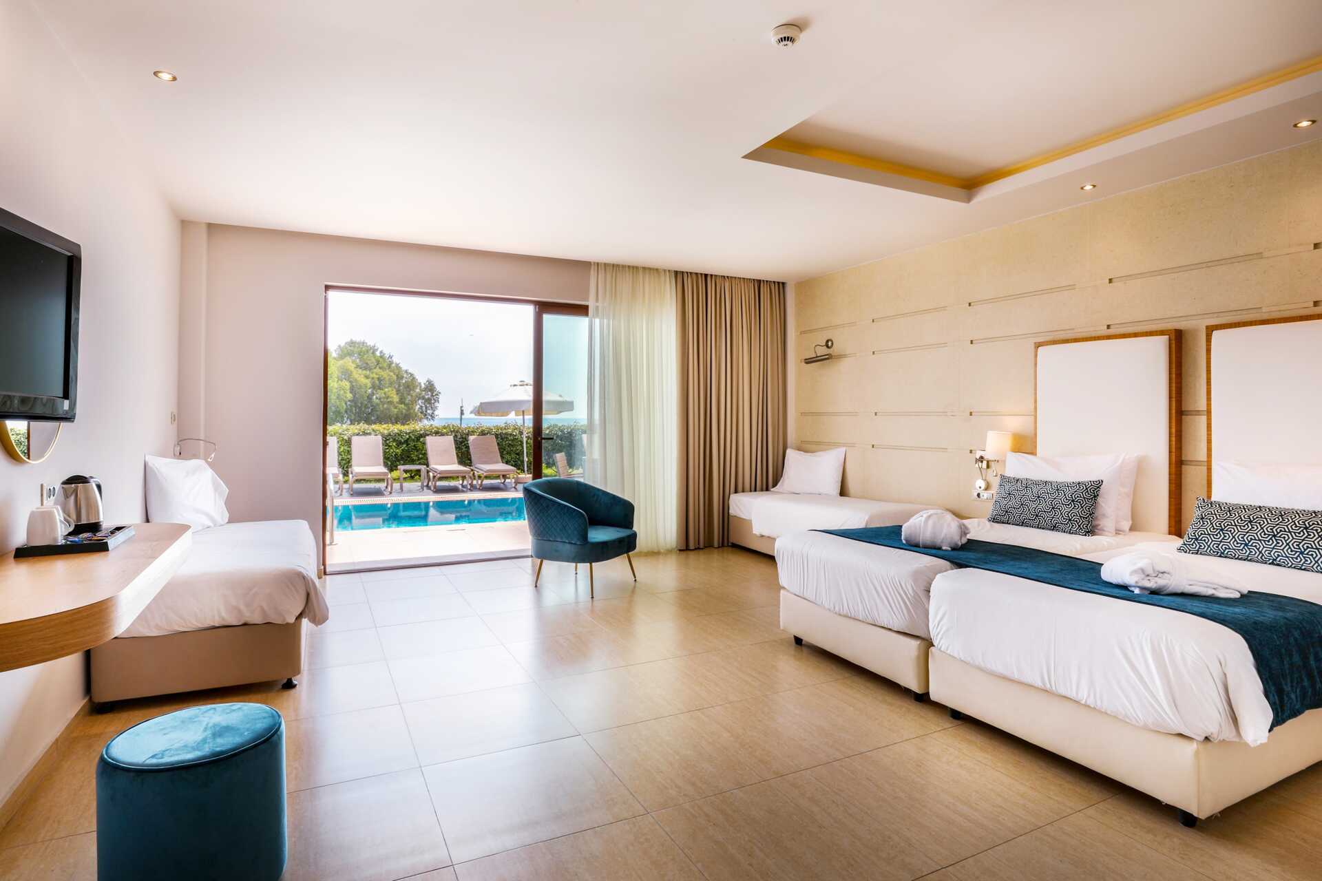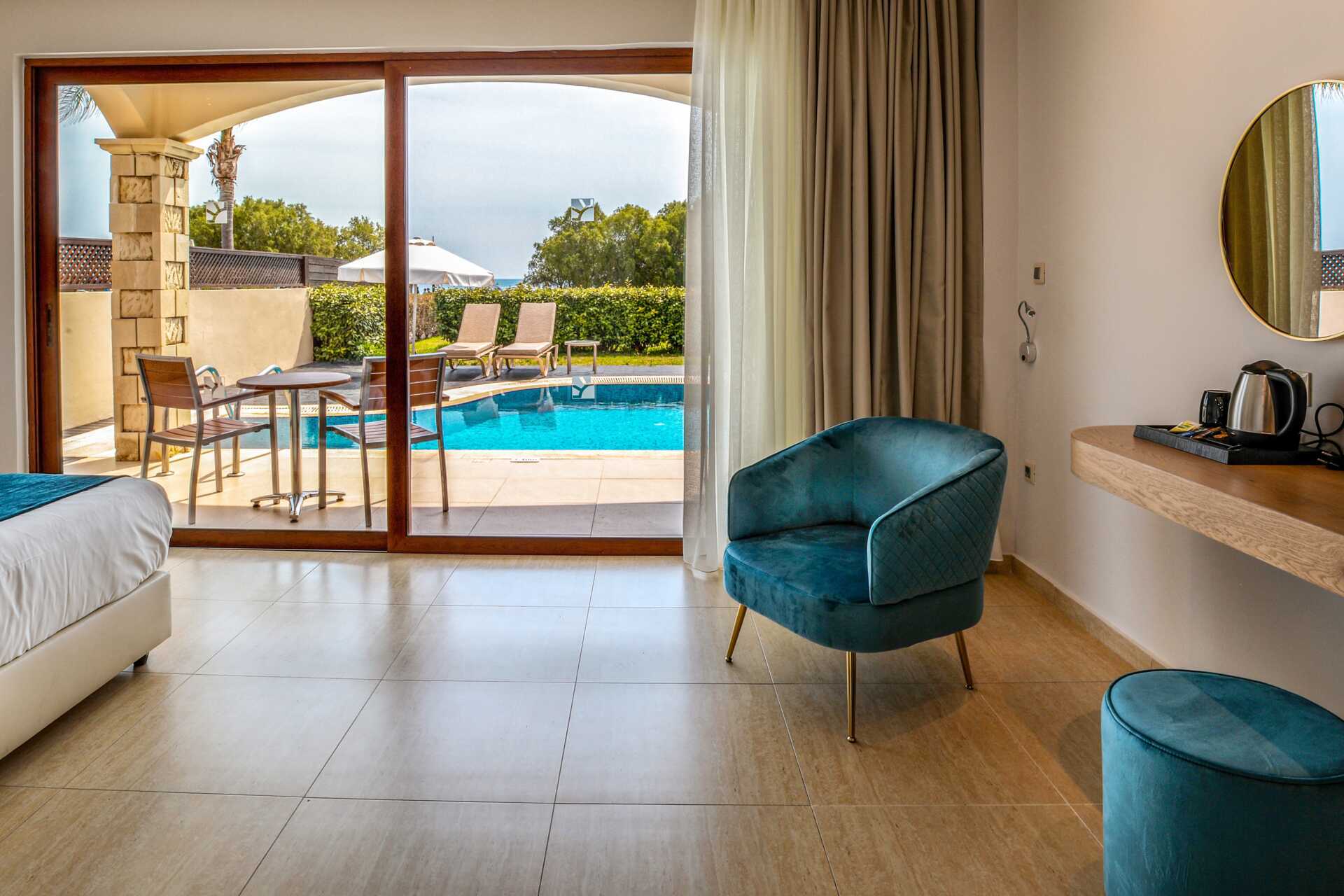 Juniorsuite med eget basseng og begrenset havutsikt fra markterrassen. På terrassen er det solsenger og parasoll samt bord og stoler. To enkeltsenger. Mulig med ekstrasenger i to sovesofaer. Wifi, safe og luftkondisjonering inkludert. Luftkondisjoneringen er sentralstyrt og slås på ved behov (kan da reguleres i juniorsuiten). Kjøleskap. Vannkoker samt kaffe og te. TV. Hårføner. Dusj og wc. Rengjøring 7 ganger/uke, hvorav en dag med enklere renhold.