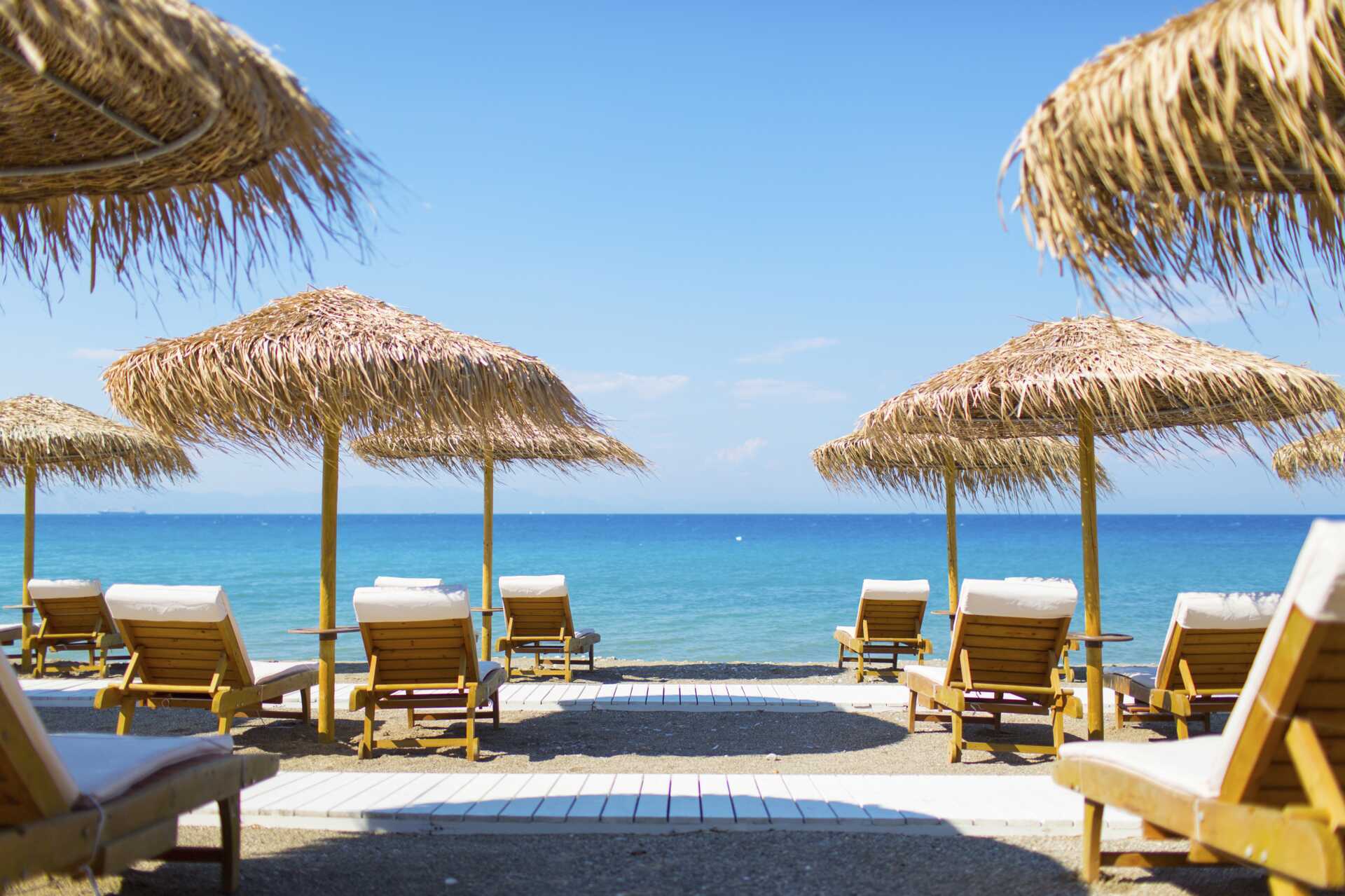 På vestkysten av Rhodos kan sanden blandes med rundslipte rullesteiner og her blåser middelhavsvinden Meltemian.