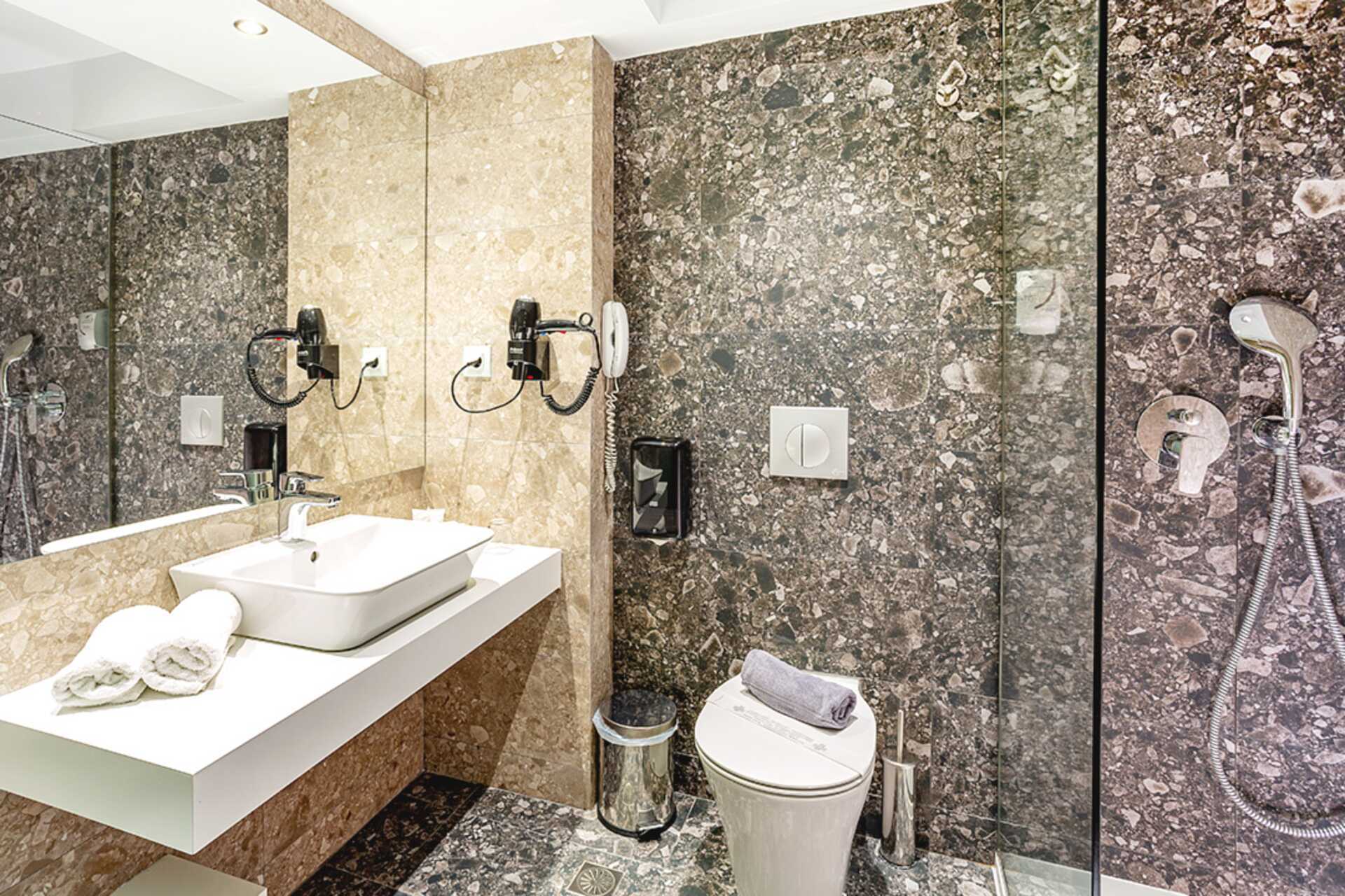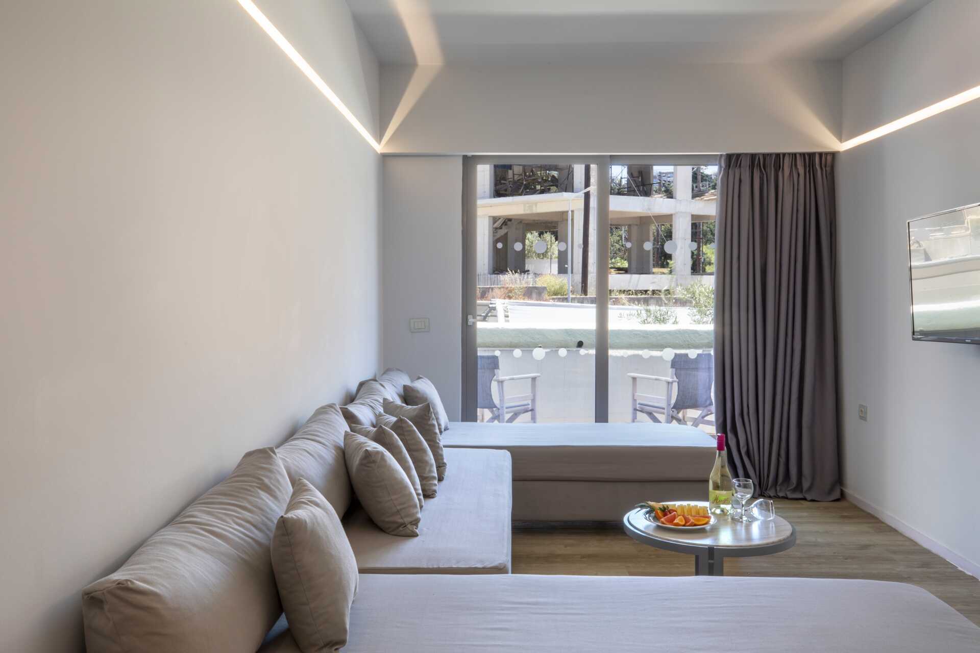 Familierom med balkong. Rommene ligger i hotellets sidebygning. Et soverom og en stue. En dobbeltseng på soverommet og mulighet for tre ekstrasenger i tre sovesofaer. Wifi, luftkondisjonering og safe inkludert. Minibaren på rommet er inkludert, etterfylles daglig med vin, øl, brus, juice og vann. Vannkoker samt kaffe og te. TV. Tøfler. Hårføner. Dusj og wc. Rengjøring 7 ggr/uke.