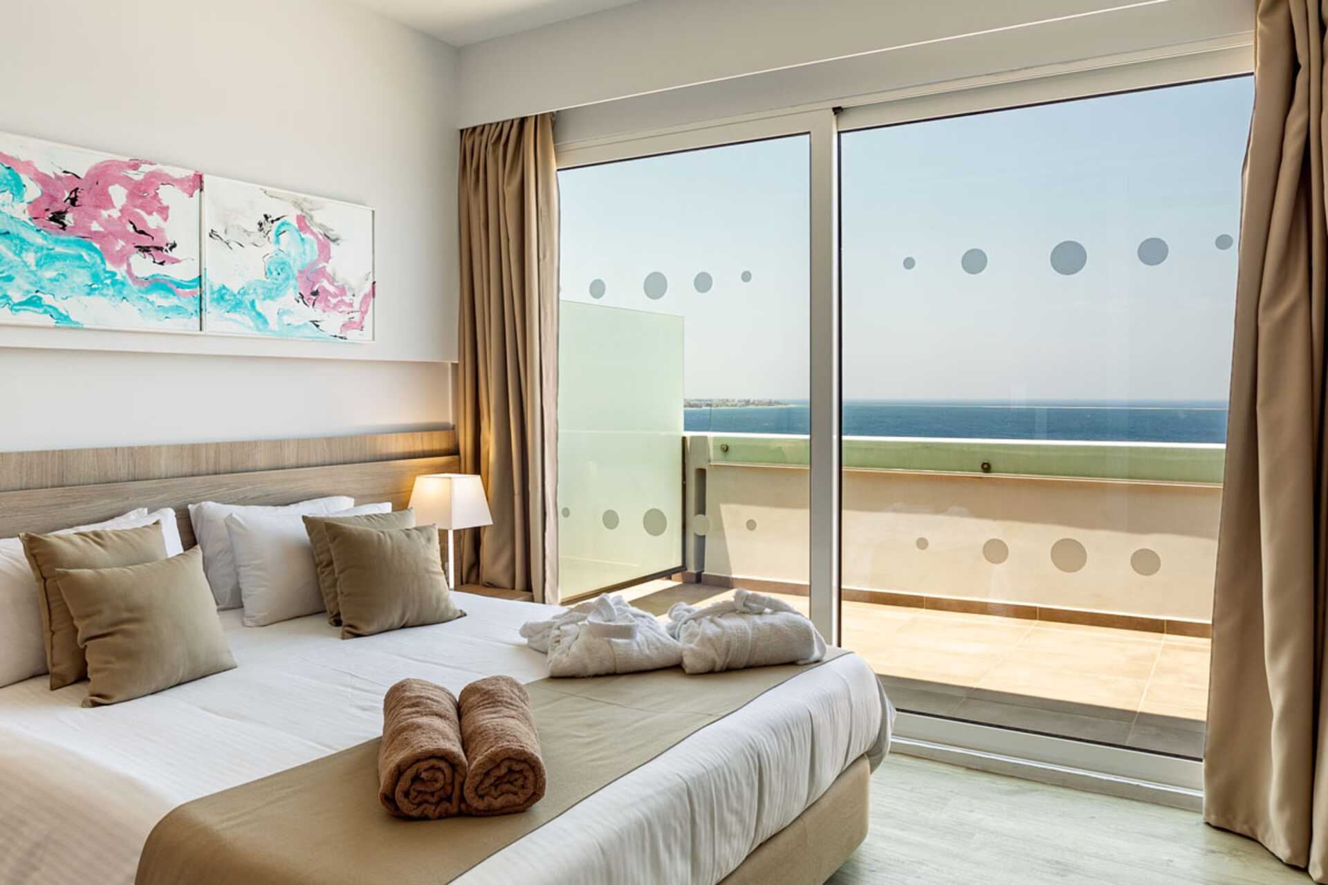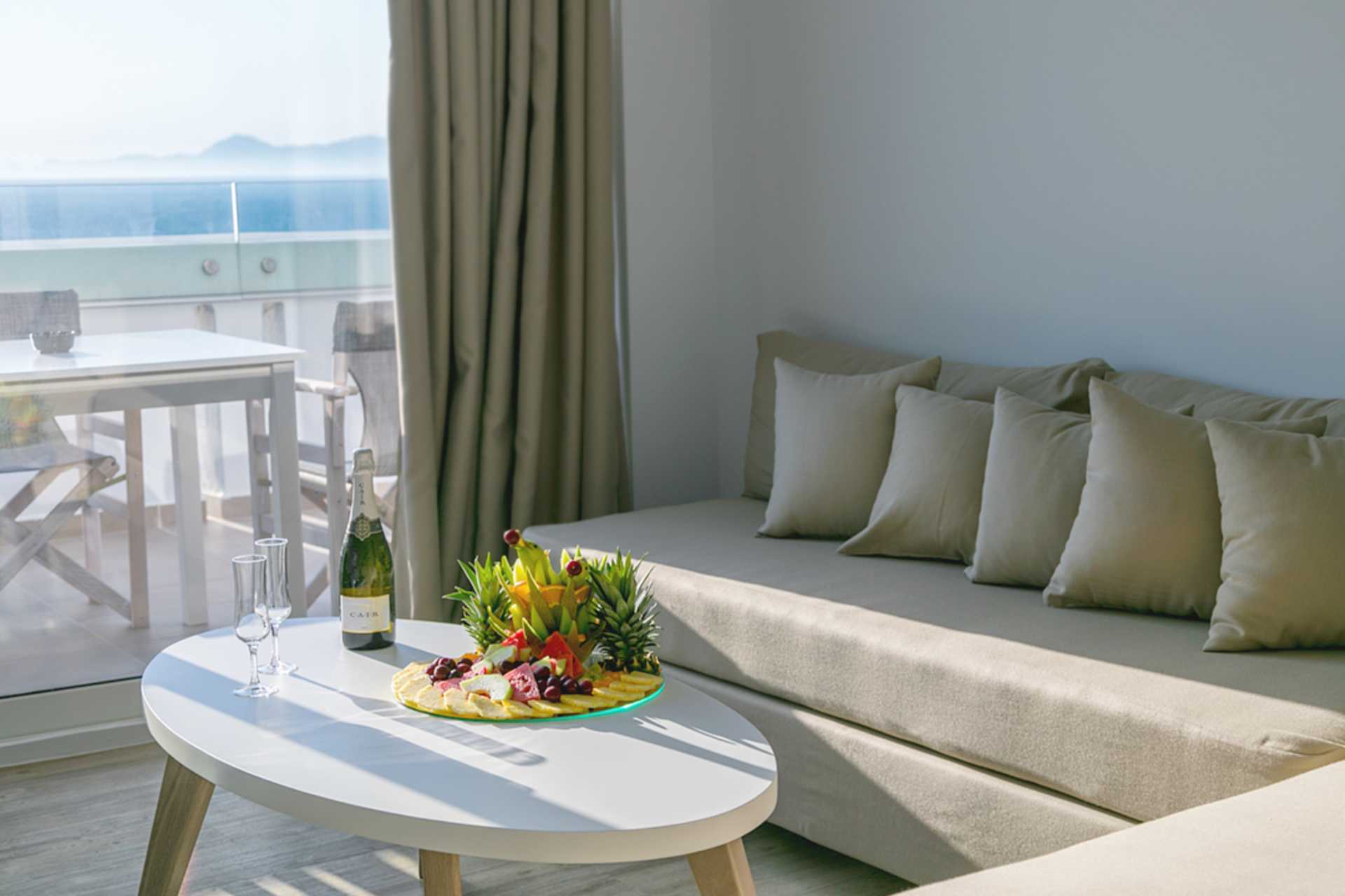 Suite med balkong. Noen balkonger har havutsikt og noen har begrenset havutsikt. Ett soverom med en dobbeltseng. Stue med mulighet for to ekstrasenger i to sovesofaer. Wifi, luftkondisjonering og safe inkludert. Minibaren på rommet er inkludert, etterfylles daglig med vin, øl, brus, juice og vann. Vannkoker samt kaffe og te og en Nespresso kaffemaskin. TV. Tøfler. Hårføner. Badekar eller dusj samt wc. Rengjøring 7 ggr/uke.