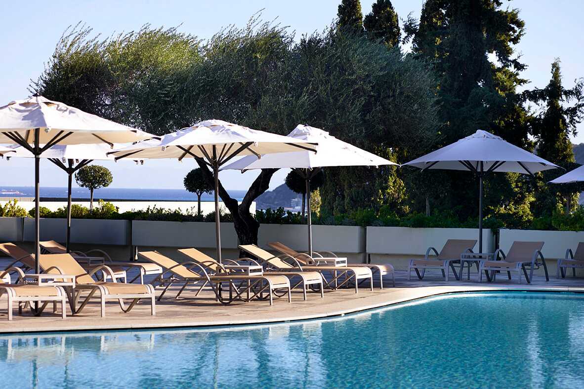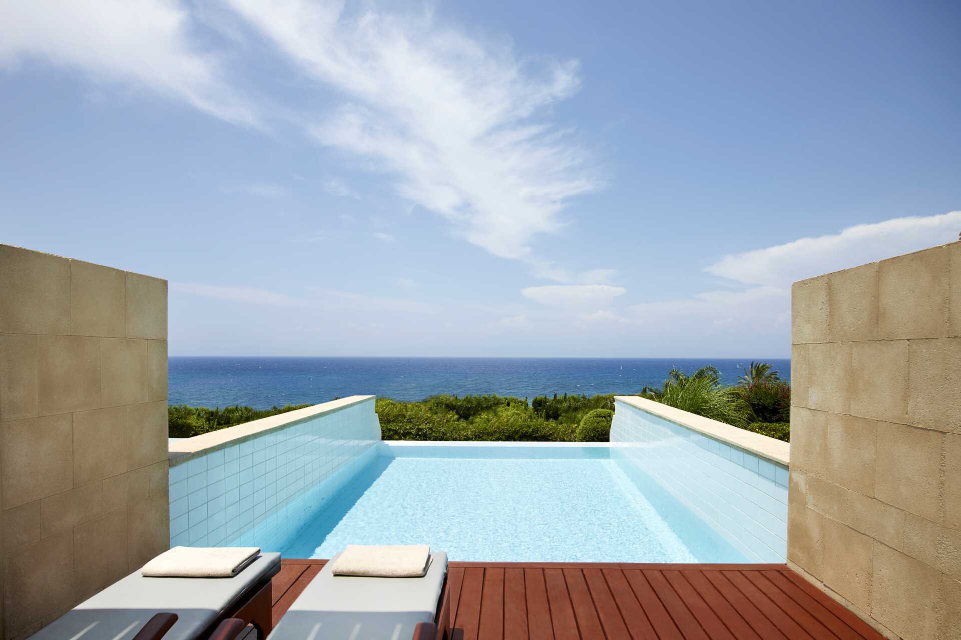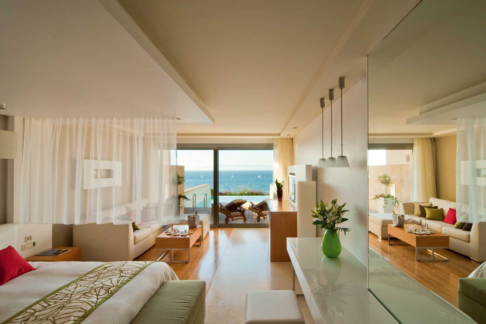 Suite med uteplass med eget basseng og havutsikt. Solsenger på terrassen. En dobbeltseng eller to enkeltsenger. Mulig med en ekstraseng i sovesofa. Wifi, luftkondisjonering og safe inkludert. Kjøleskap. Vannkoker samt kaffe og te. TV. Badekåper og tøfler. Hårføner. Bad med badekar, dusj og wc. Rengjøring 7 ggr/uke. Barn under 2 år regnes inn i maksantallet i rommet.