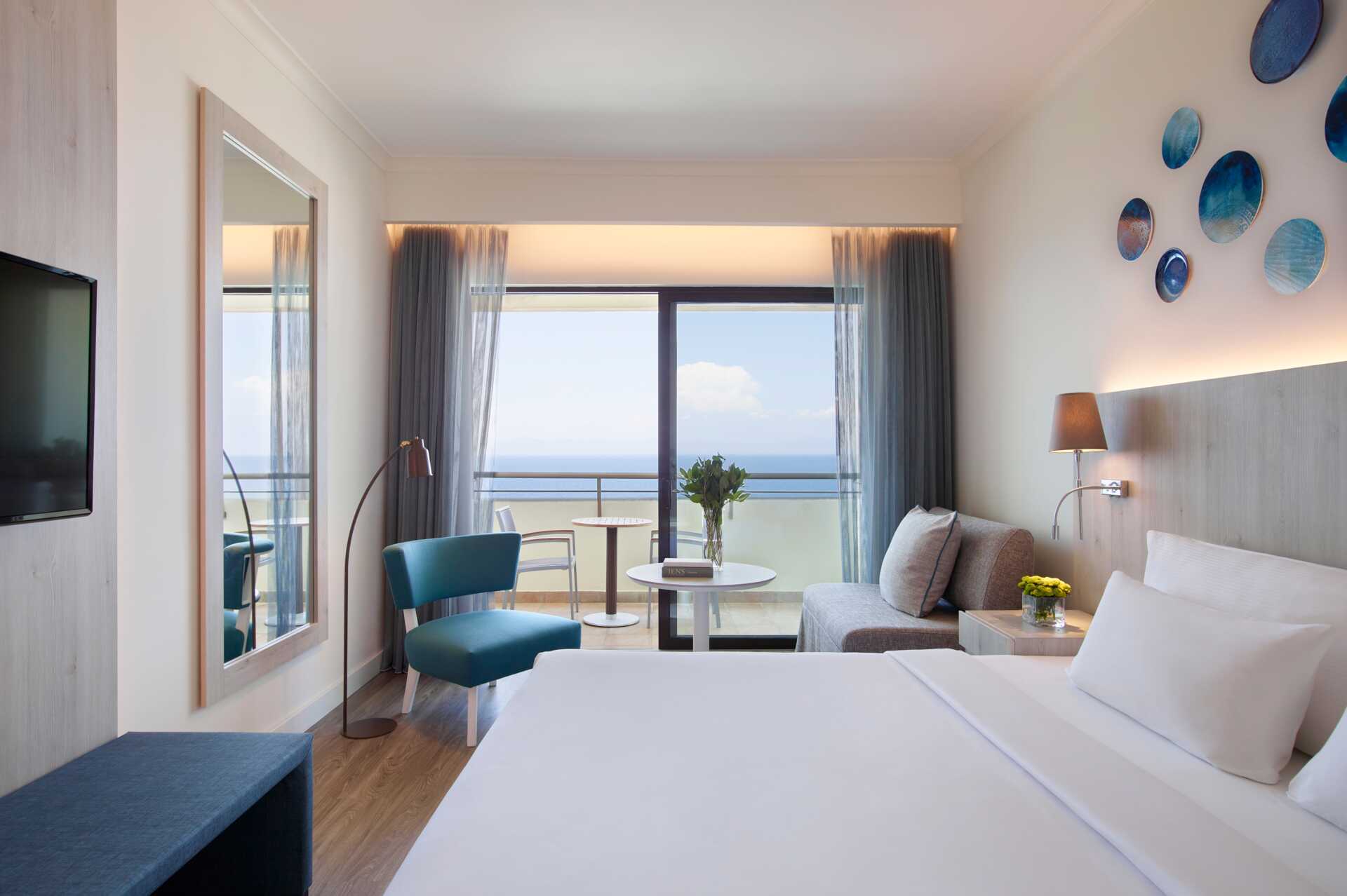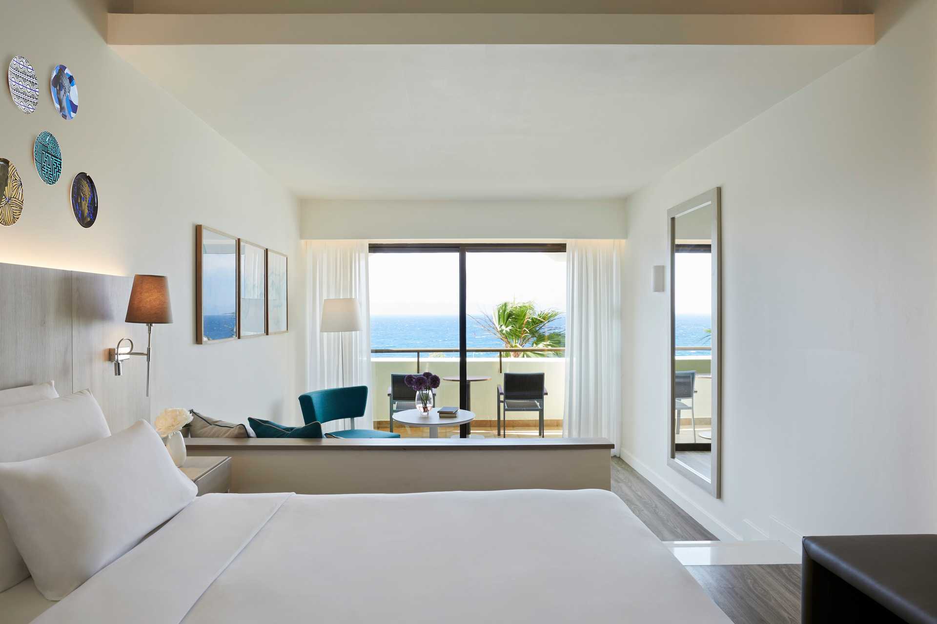Deluxerom plus med balkong og havutsikt. Rommet består av en soveromsdel med dobbeltseng og et par trappetrinn ned til en stuedel med sovesofa. Wifi, luftkondisjonering og safe inkludert. Kjøleskap. Vannkoker samt kaffe og te. Nespresso kaffemaskin. TV. Badekåper og tøfler. Dusj og wc. Rengjøring 7 ggr/uke. Barn under 2 år regnes inn i maksantallet i rommet.