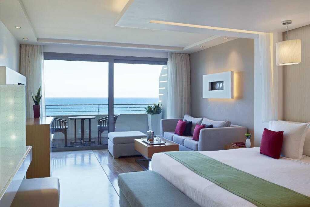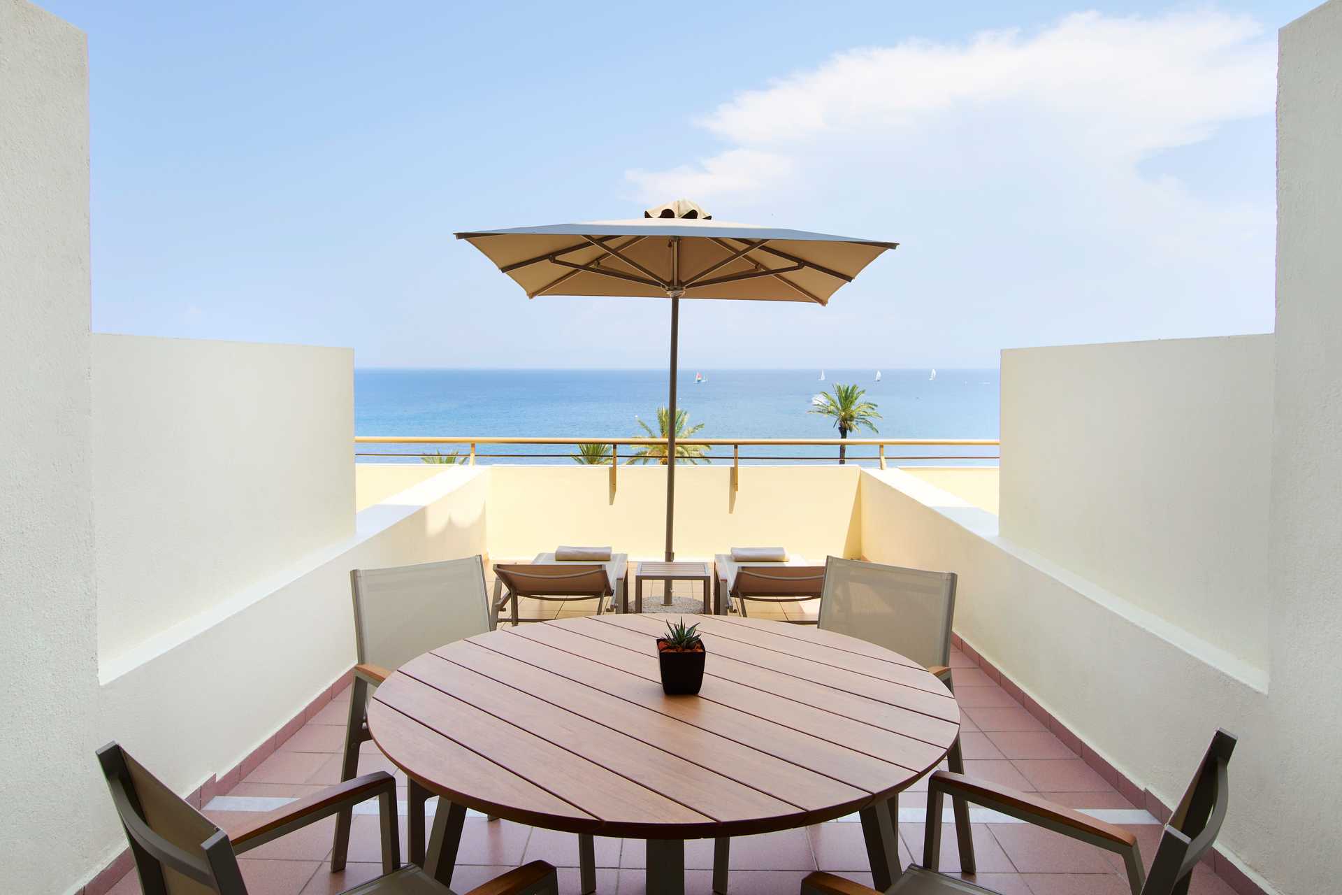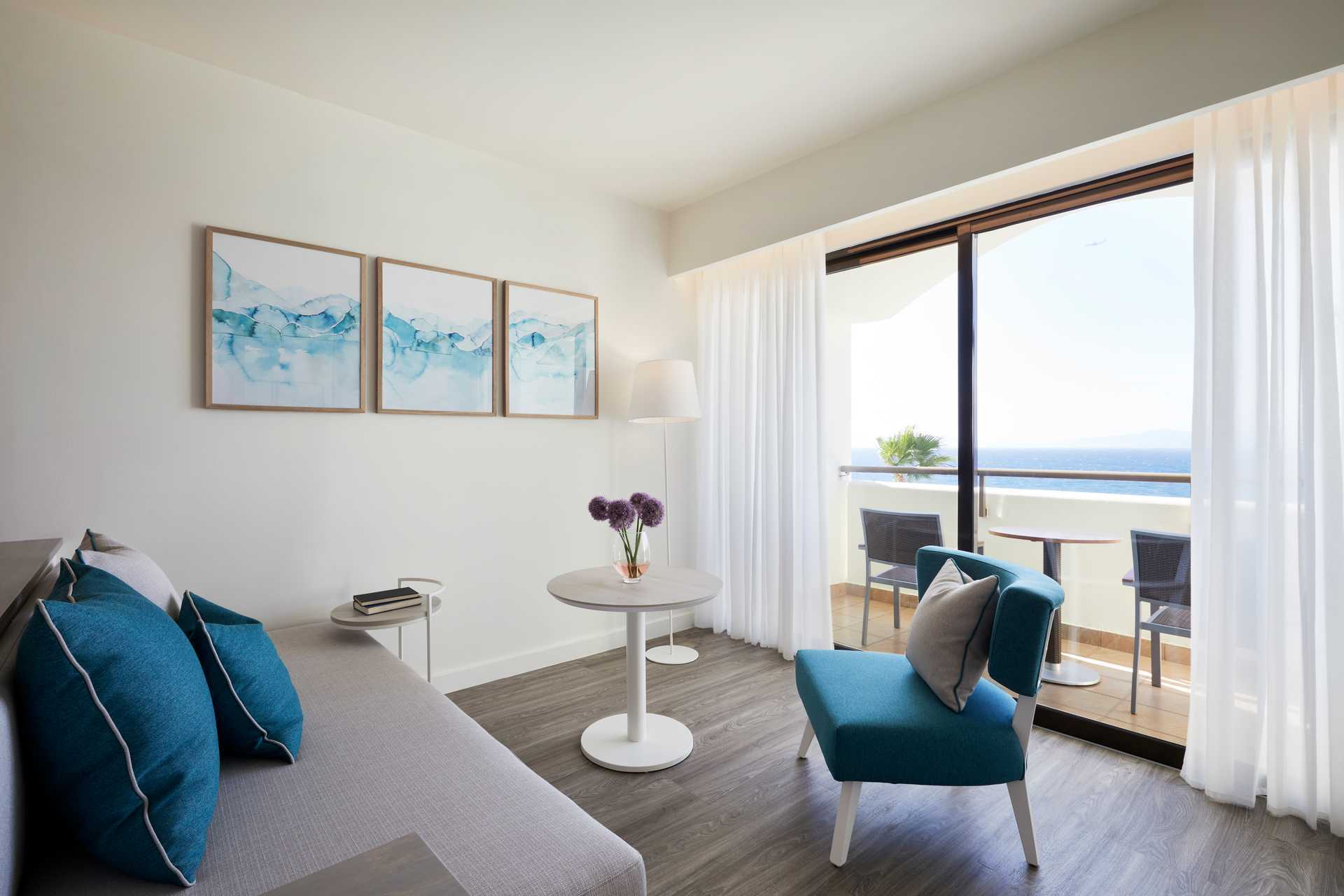 Suite med balkong og havutsikt. En dobbeltseng eller to enkeltsenger. Mulig med en ekstraseng i sovesofa. Wifi, luftkondisjonering og safe inkludert. Kjøleskap. Vannkoker samt kaffe og te. TV. Badekåper og tøfler. Hårføner. Bad med badekar, dusj og wc. Rengjøring 7 ggr/uke. Barn under 2 år regnes inn i maksantallet i rommet.